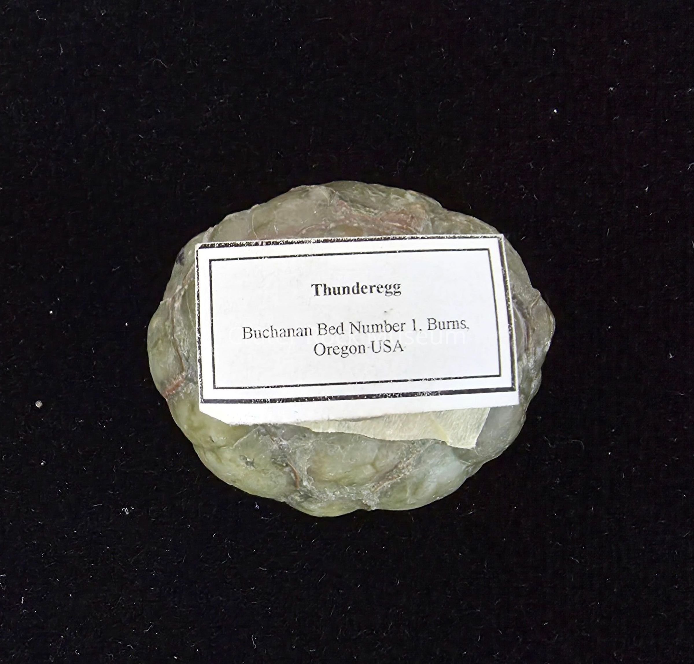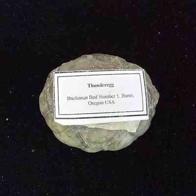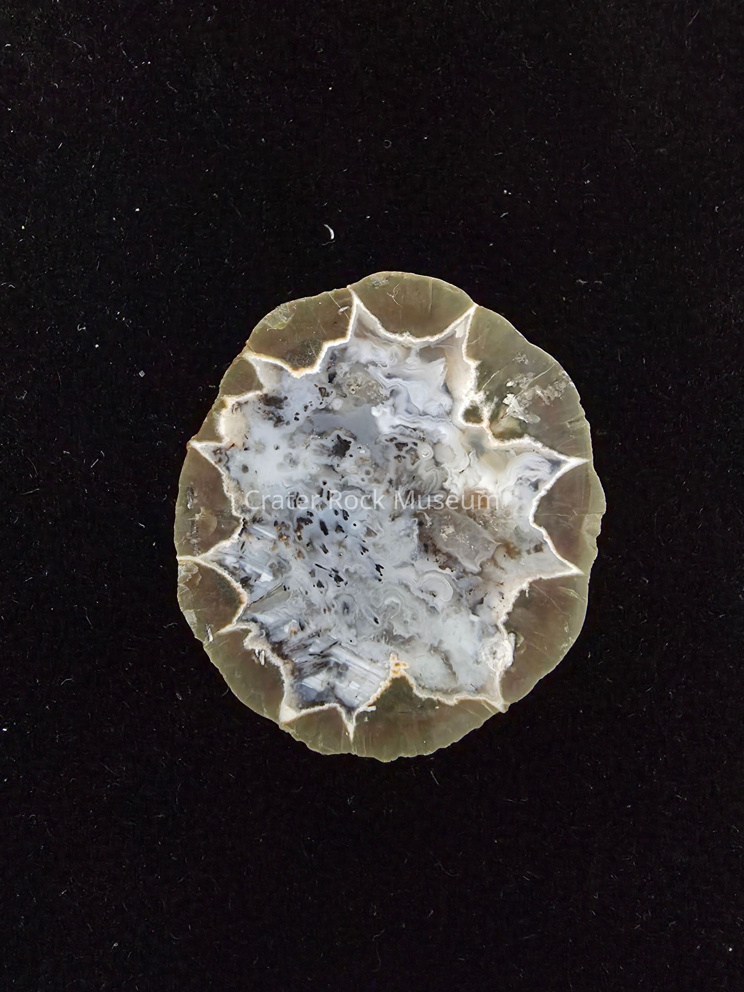 A Thunderegg from the Buchanan Beds in Burns, OR (Eastern OR). Cut side shows Star center in Crystalline, White and Grey with black speckled dedrites and bedded agate at edges in White. Outer rock is greyish brown.Location