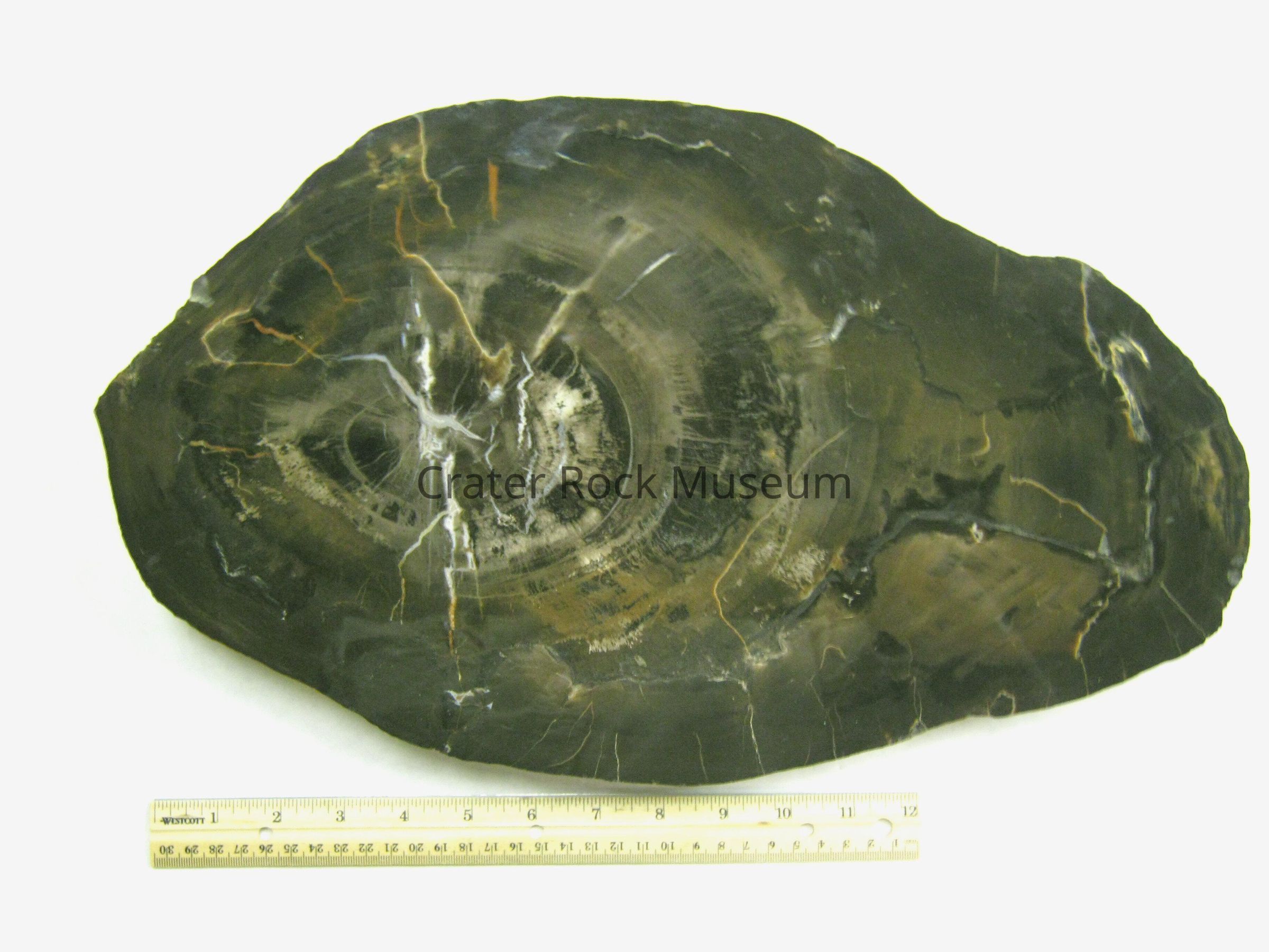 Description: Polished face shows colors of orange, black, brown, grey, there are slight growth rings are apparent. The slab is a complete round