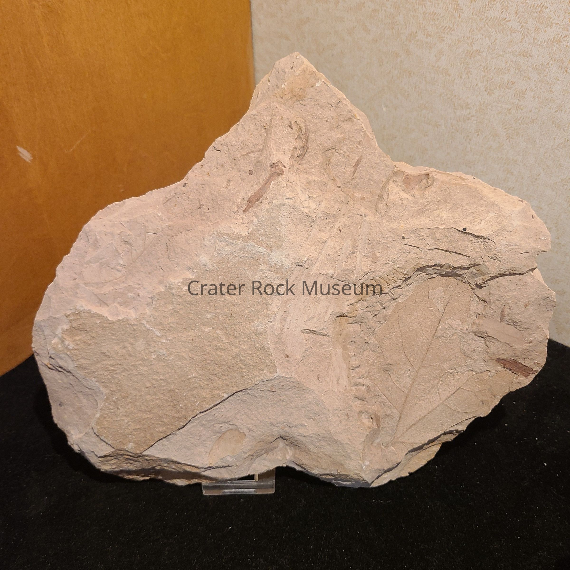One large and several small overlapping leaf impressions in a light colored irregular pentagonal matrix