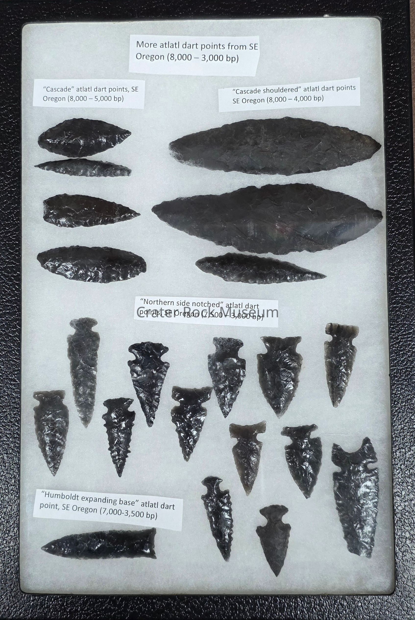21 obsidian projectile points- 4 Cascade, 3 Cascade shouldered, 13 Northern side notched, and 1 Humbolt expanding base forms- in an 8"x12" Riker frameCollection