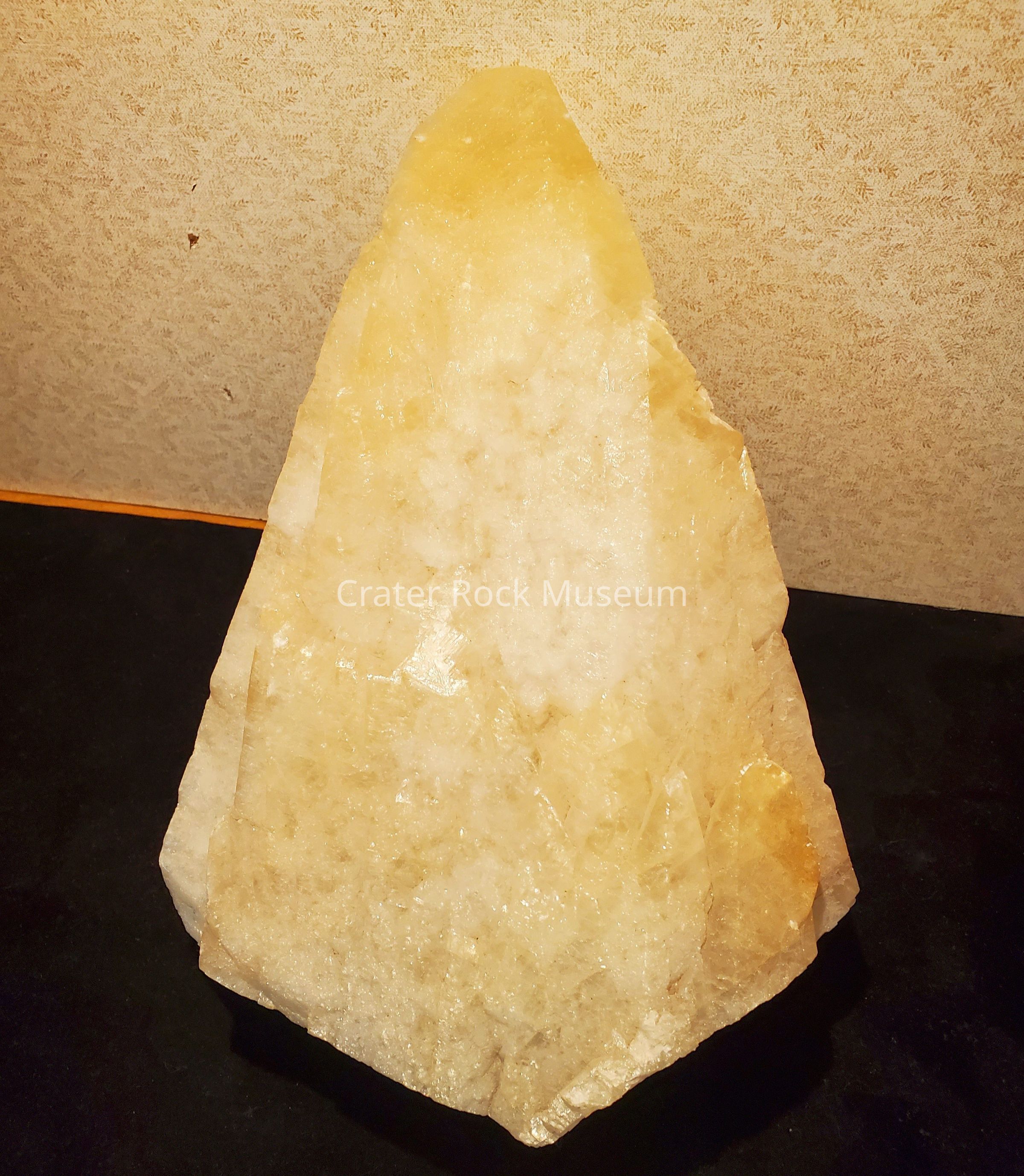 A calcite crystal from New Mexico, piece is roughly triangular, with semi-protruding crystal on side. Base is with cubic cleavage. opposite end is blunted.