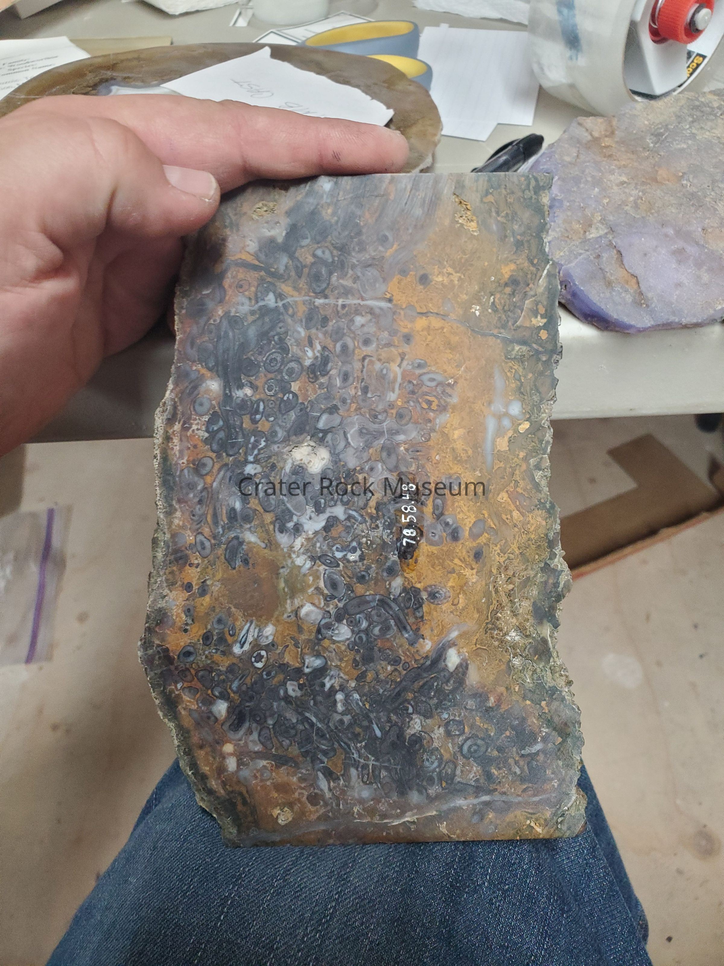 A piece of petrified wood (root of palm), from Yermo, California (center of Death Valley). Probably from Jurassic period, Mesozoic era. Delmar Smith says this plant grew during a time when there was a lot of rain carried by the trade winds. Plant grew like a palm with branches and leaves resembling fern. There are many "eyes" of grey with darker centers surrounded by a groundmass of yellows and browns. Tropical tree. Probably ~200 myaCollection