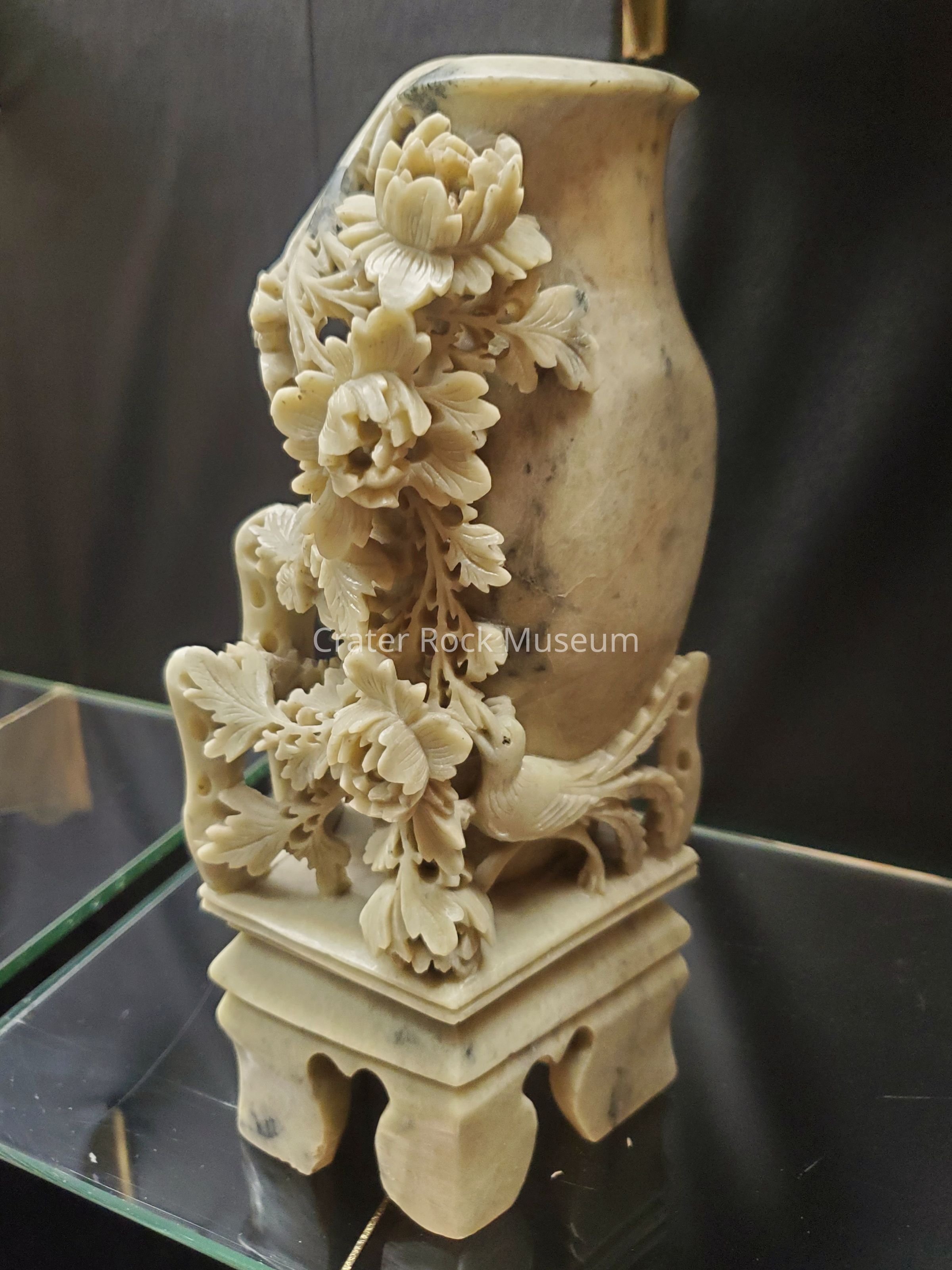 Flower vase carved from soapstone with very beautiful flowing flowers and bird designed carved on the outside.