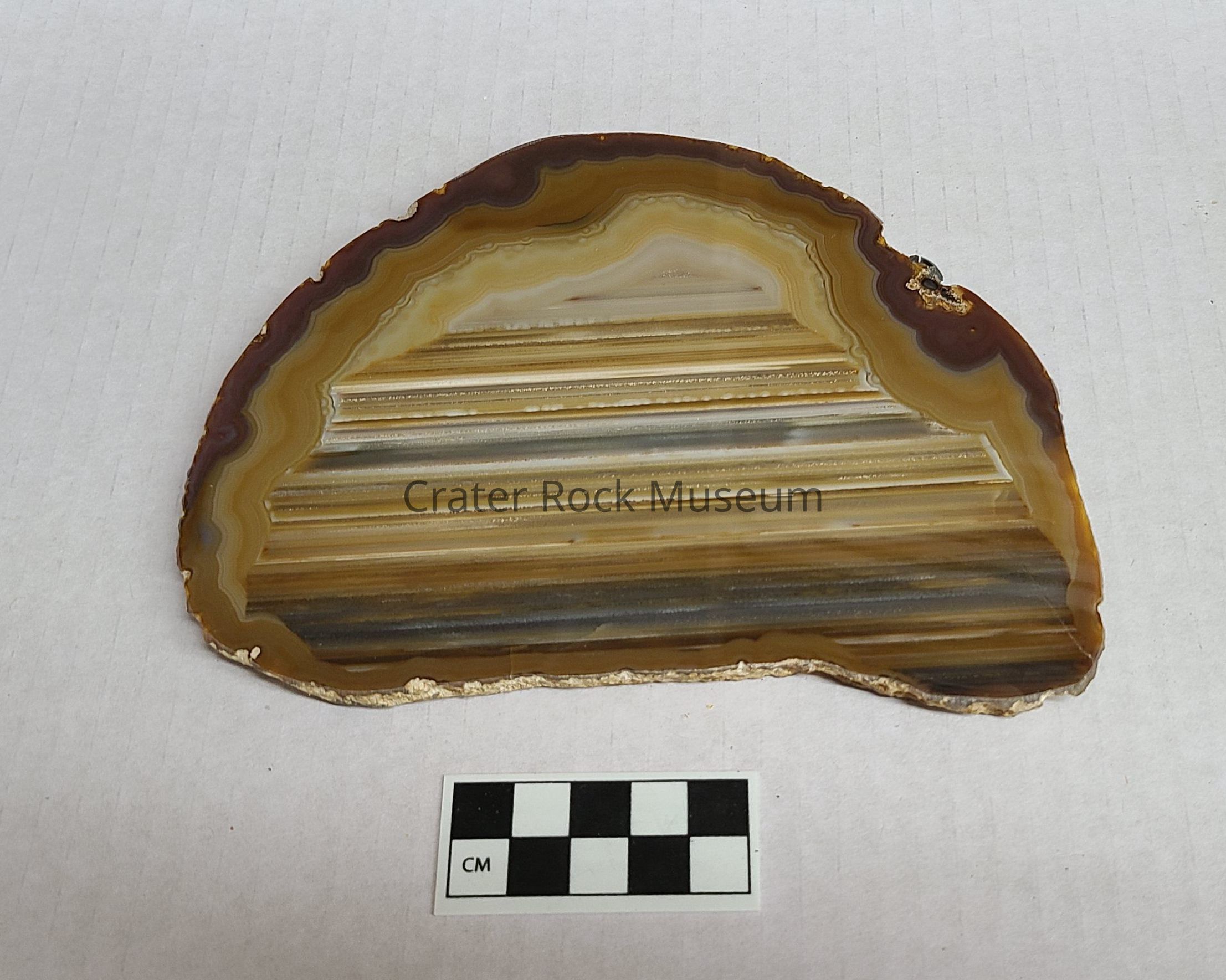 A 3/8" (.9 cm) thick slice of an Agate from Brazil. Polished side shows bedded Agate in Greys, Butterscotch, Crystalline, Brown and White surrounded by fortified Agate in Butterscotch and Violets.Collection