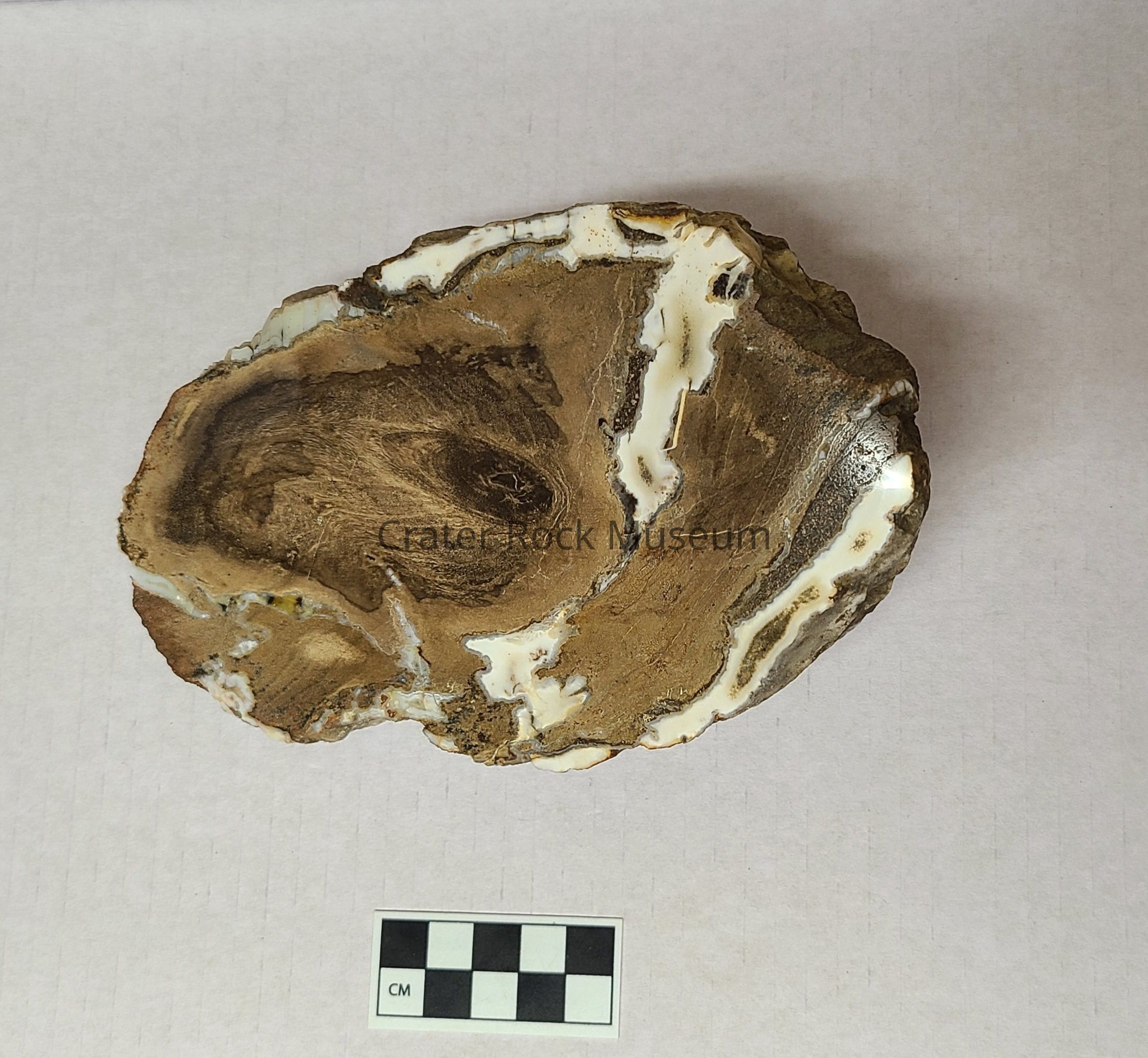 Colors: Dark brown center surrounded by various shades of brown. Several wide and cracks are filled with opaque, white silicate material. One crack is filled partially with yellow, brown, and black agate.