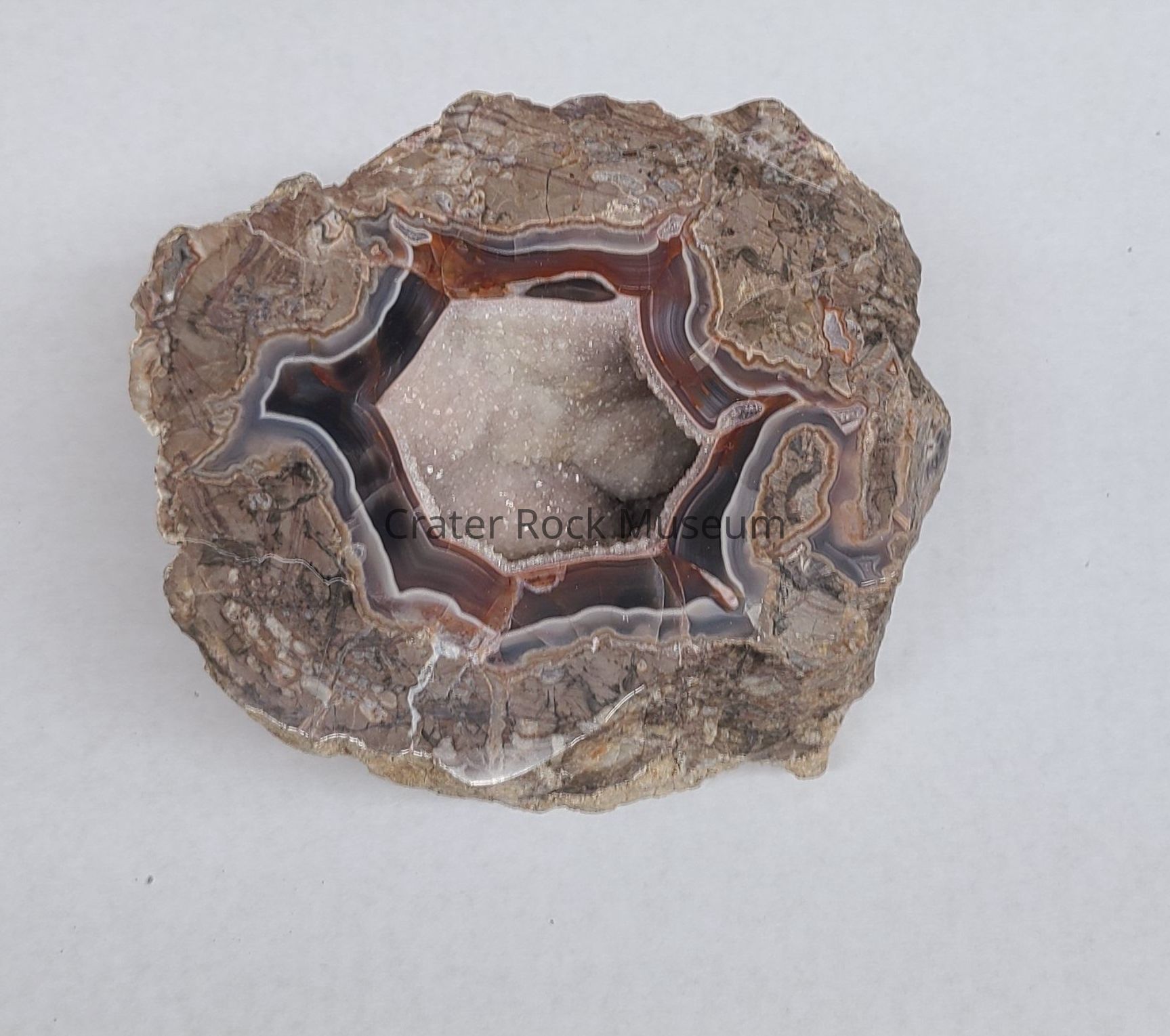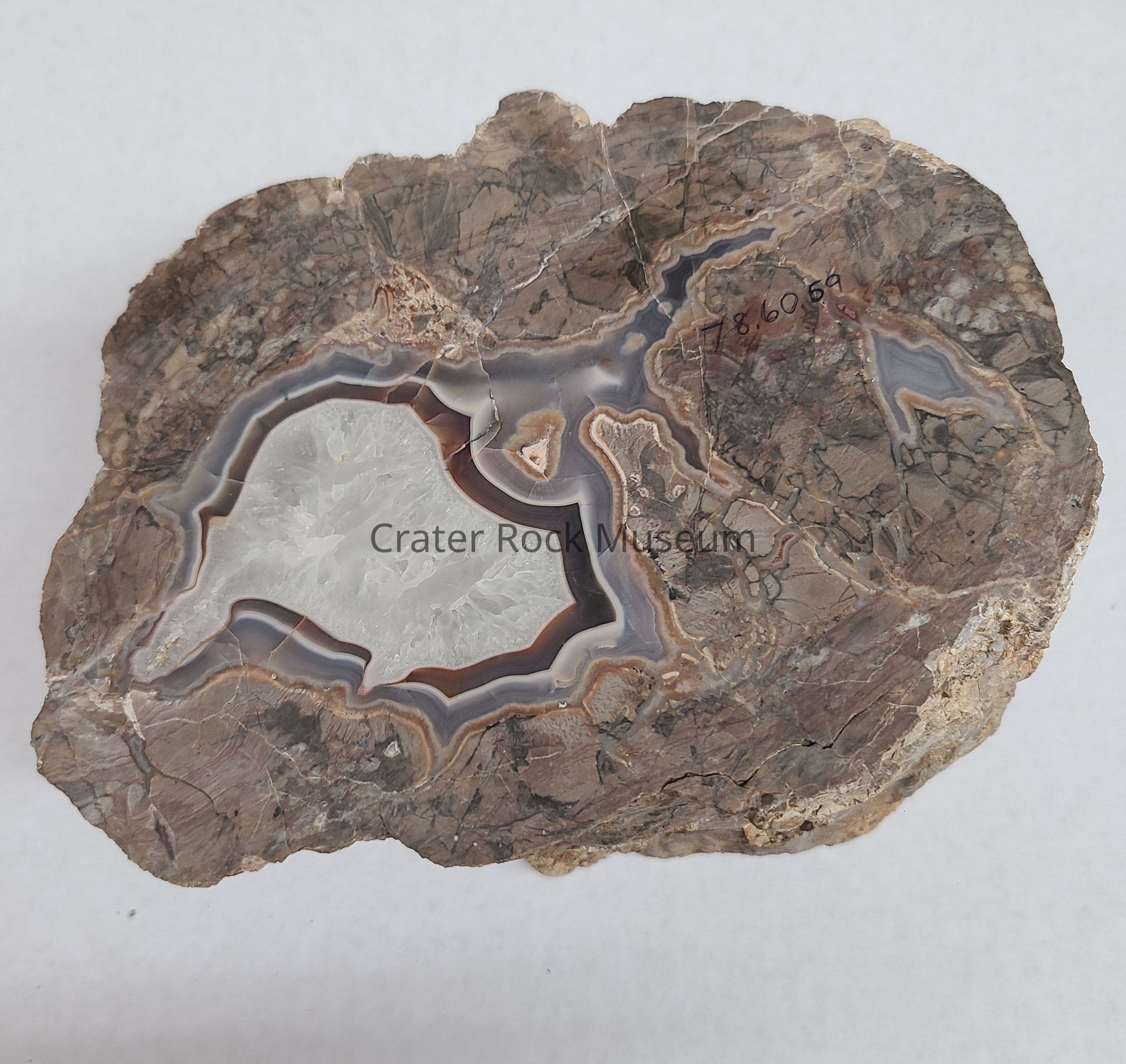 A Thunderegg from the Baker Ranch in Deming, New Mexico (Northern NM). The center is Silicate and Agate filled. It's possibly a double Thunderegg. Crystal side is faint Pink with Dark Grey fortification lines surrounding it. Bottom of piece shows Silicate center and fortification lines. Outside is Rhyolite.Dimensions