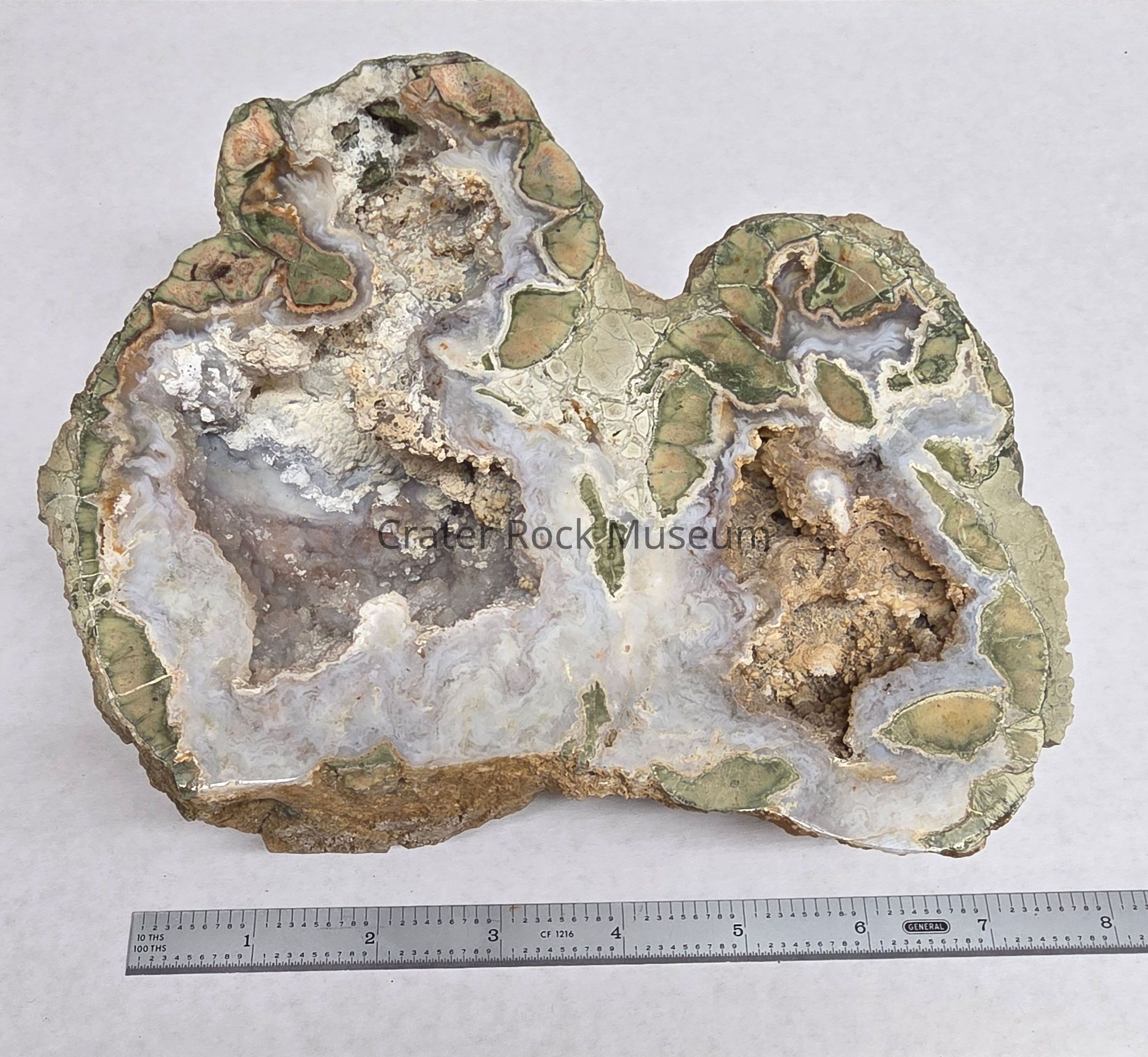 A multichambered Thunderegg from Burns Bed, OR (Eastern OR). Cut side shows three open areas, rough Crystalline lined in White, Pink and Tan surrounded by swirled Agate in White, Grey and Pink. Surrounding rock is in Green, Tan and Pink and is seen _______________ in some areas.Dimensions