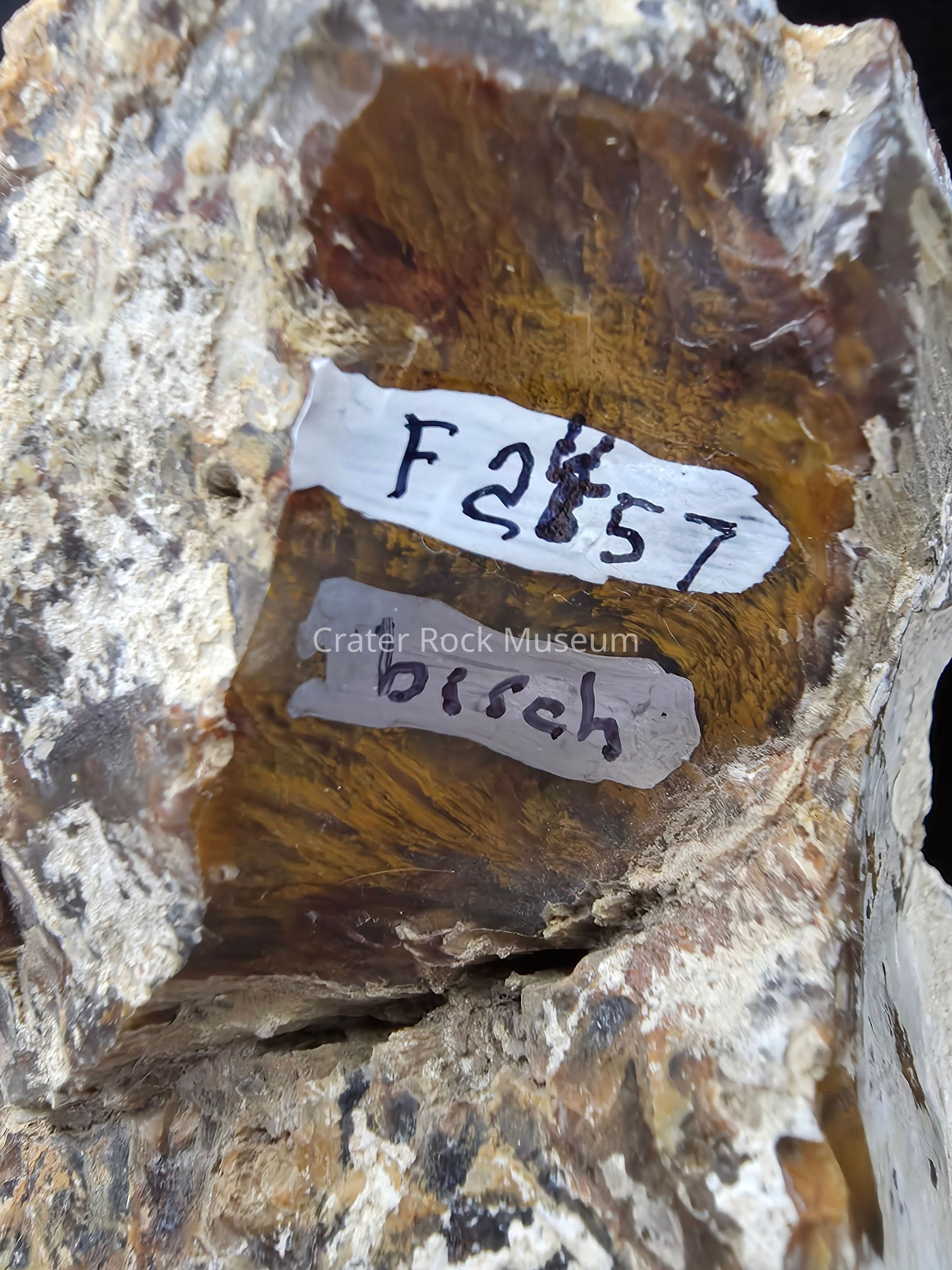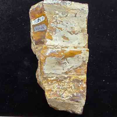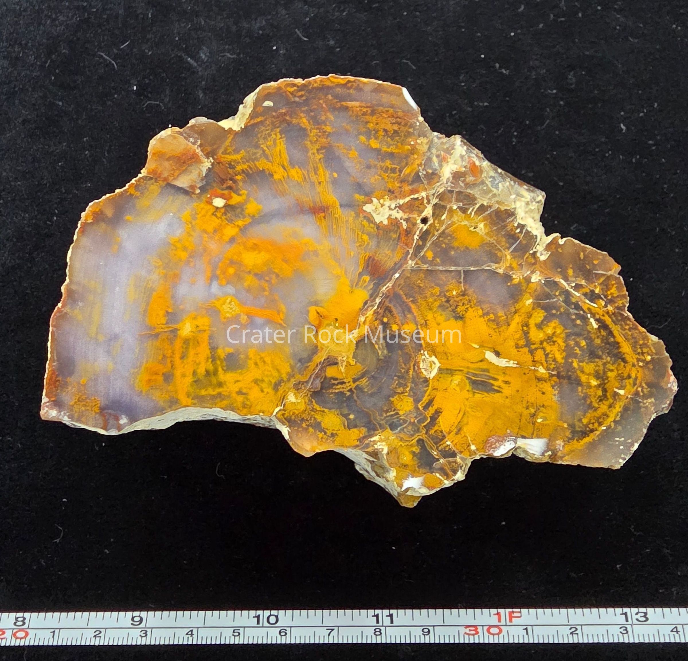 Incomplete round slab in yellow-oranges, brown, grey-blue, and white with blocky patterns along the growth rings. Exterior matrix in chalk-like and rough. Polished on one side with a prominent semi-filled hole on the bottom left.
