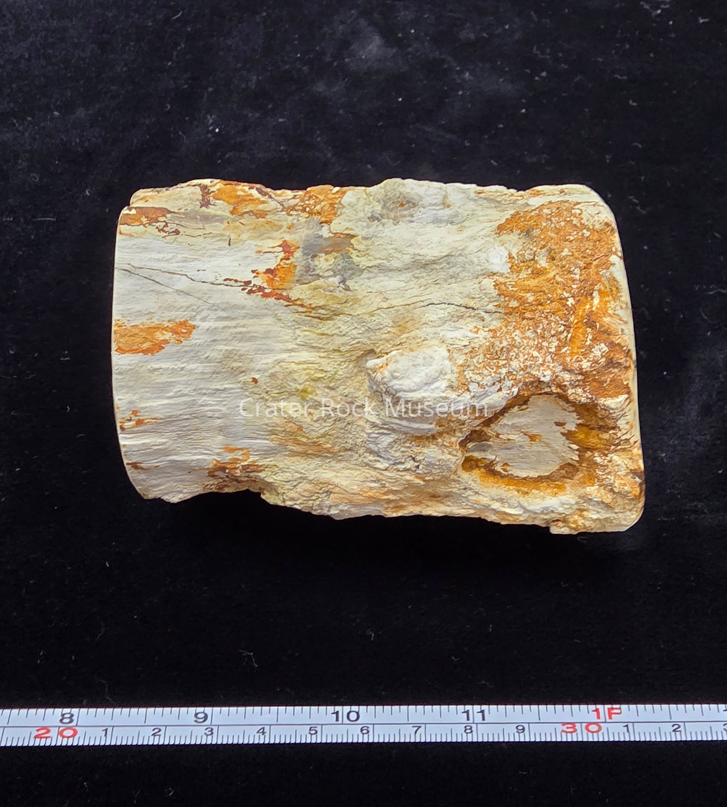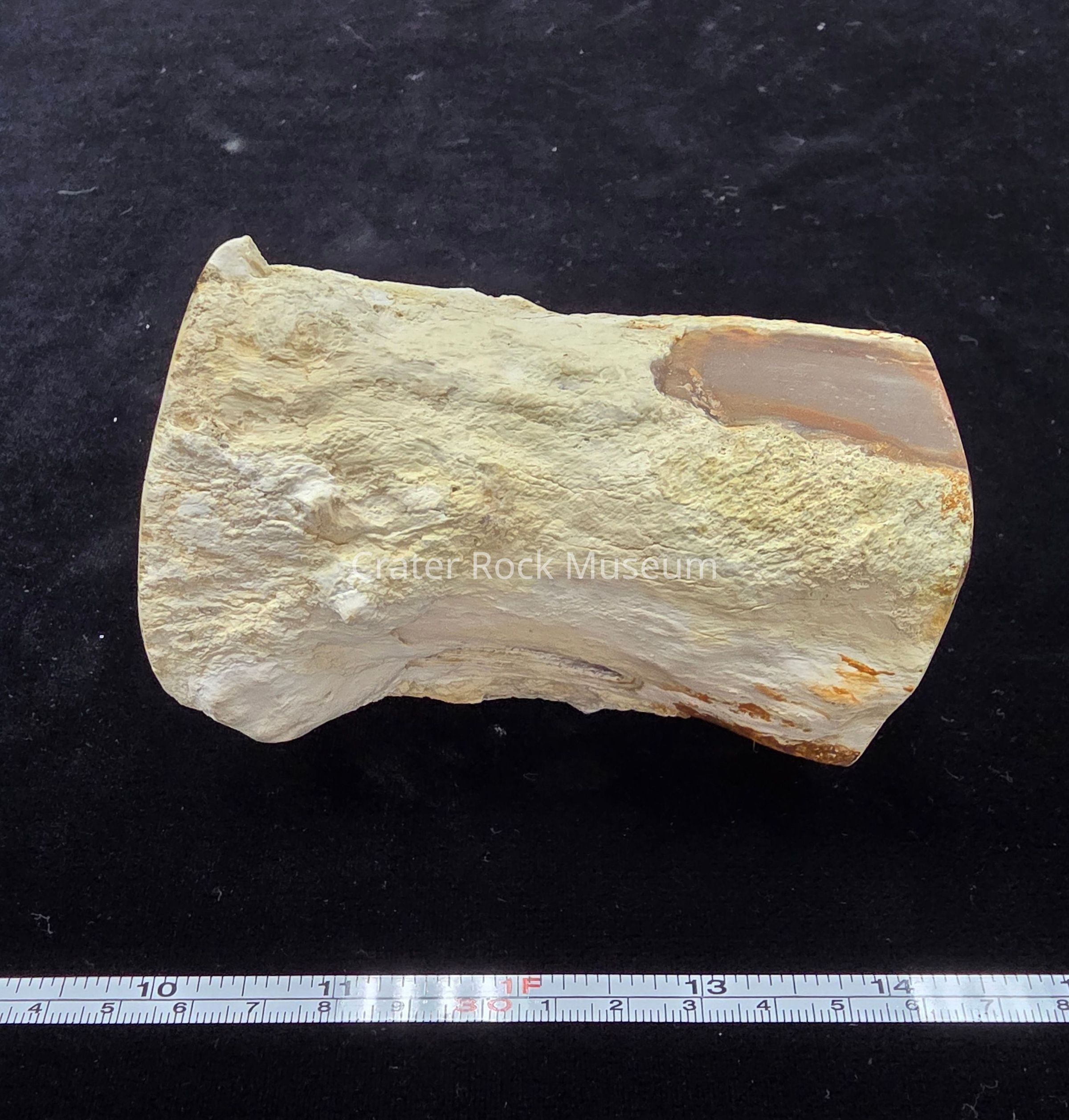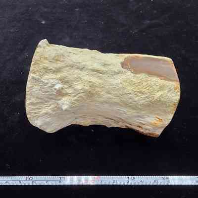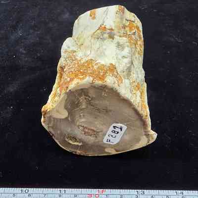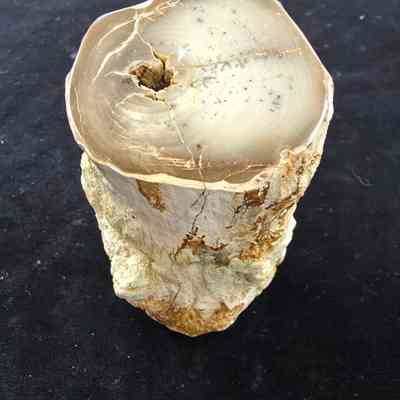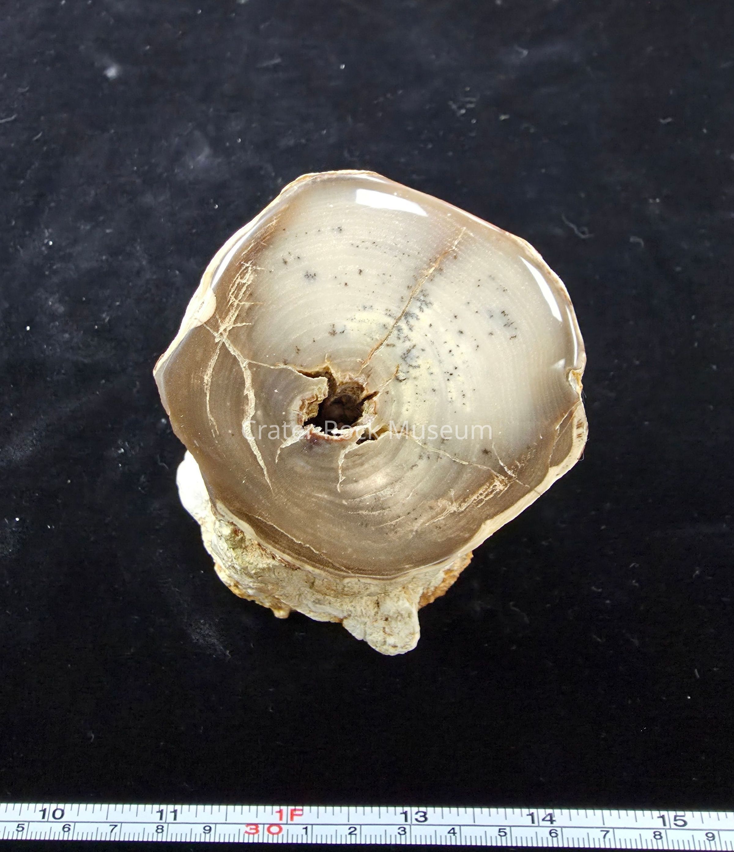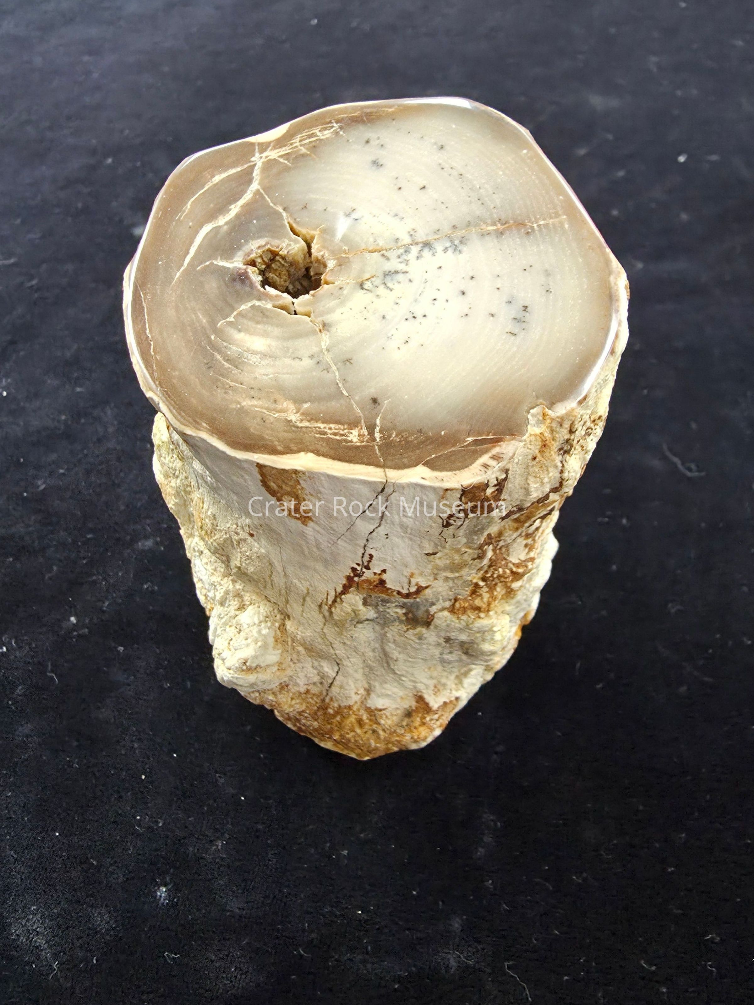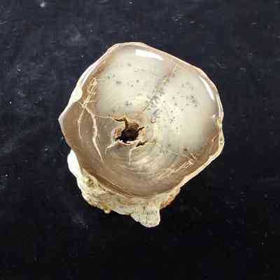 A round with open termite gallery through and through. The polished face is a pale cream with a few dendrites and a darker brown nearer the edges. Exterior matrix is tan and orange.Collection
