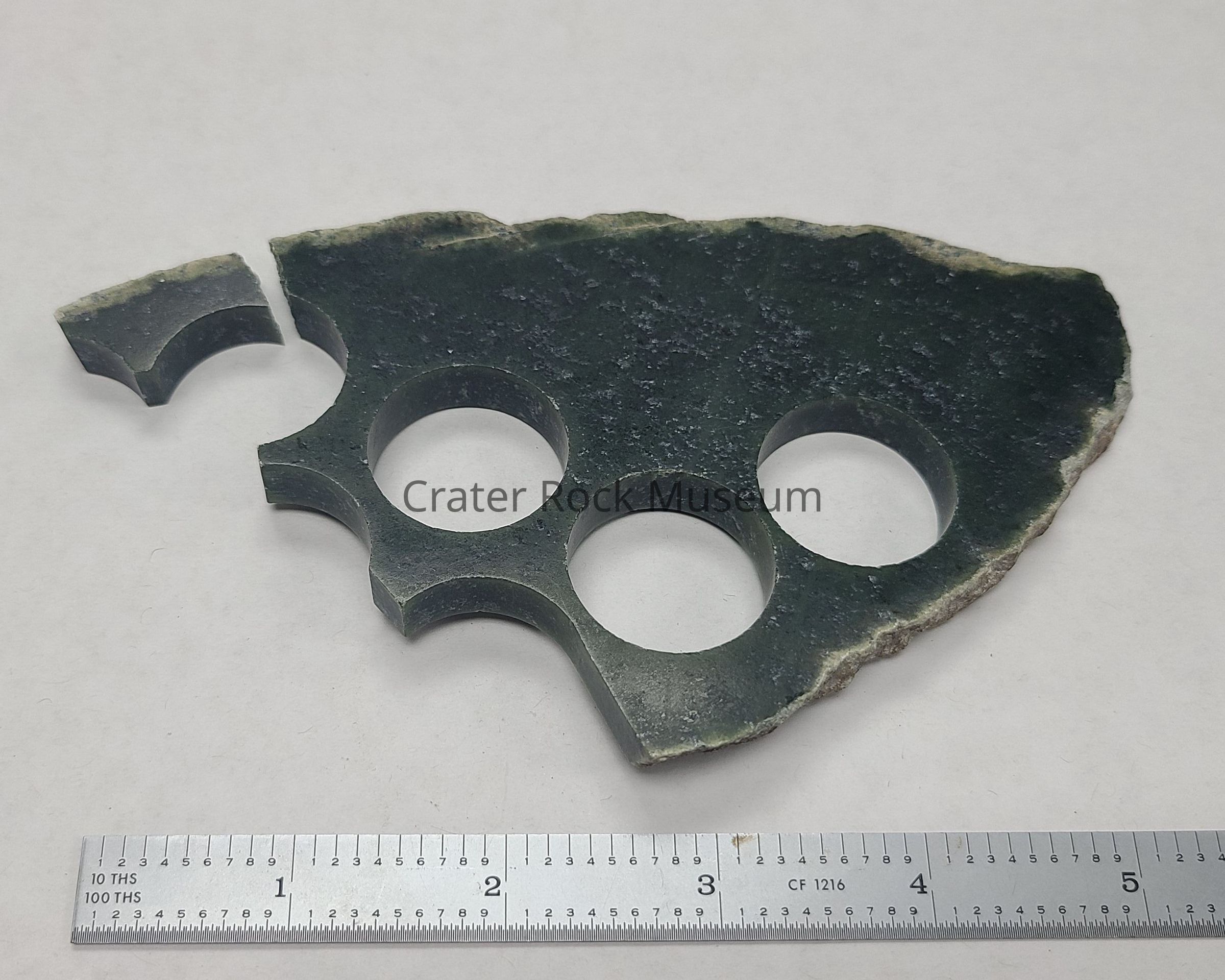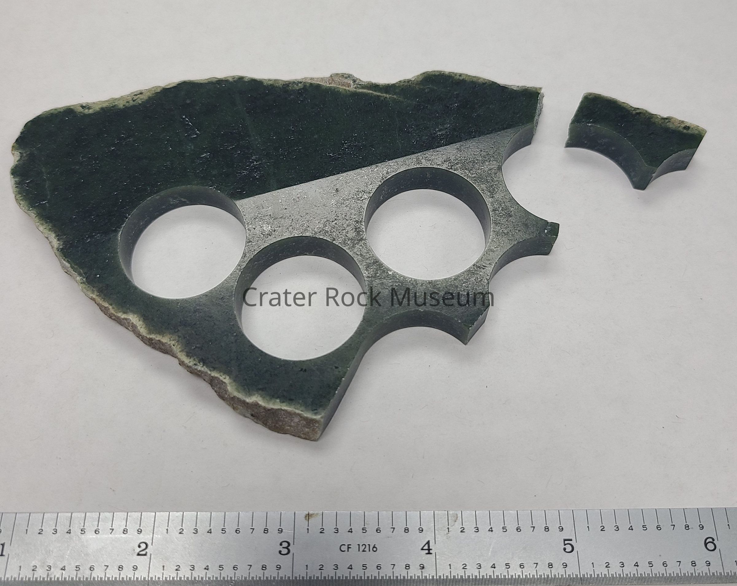 1/4-1/8" beveled slab of dark green with 3 circular bore holes and 3 incomplete circular holes where cores have been removedLocation