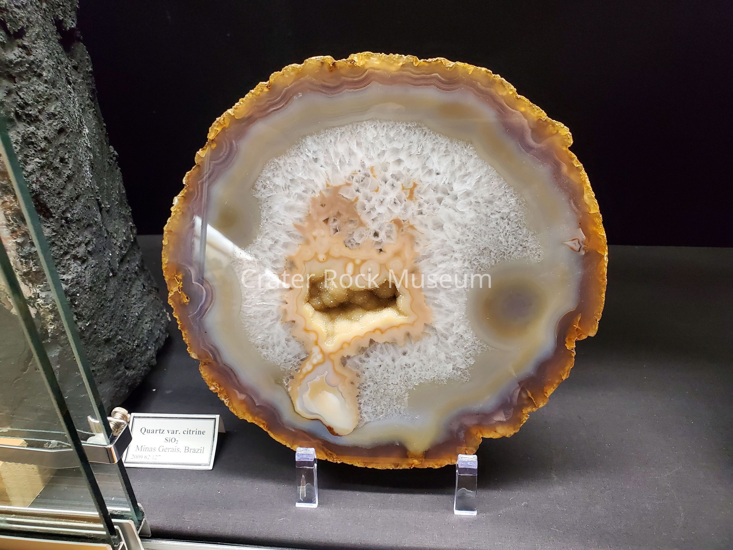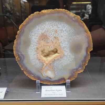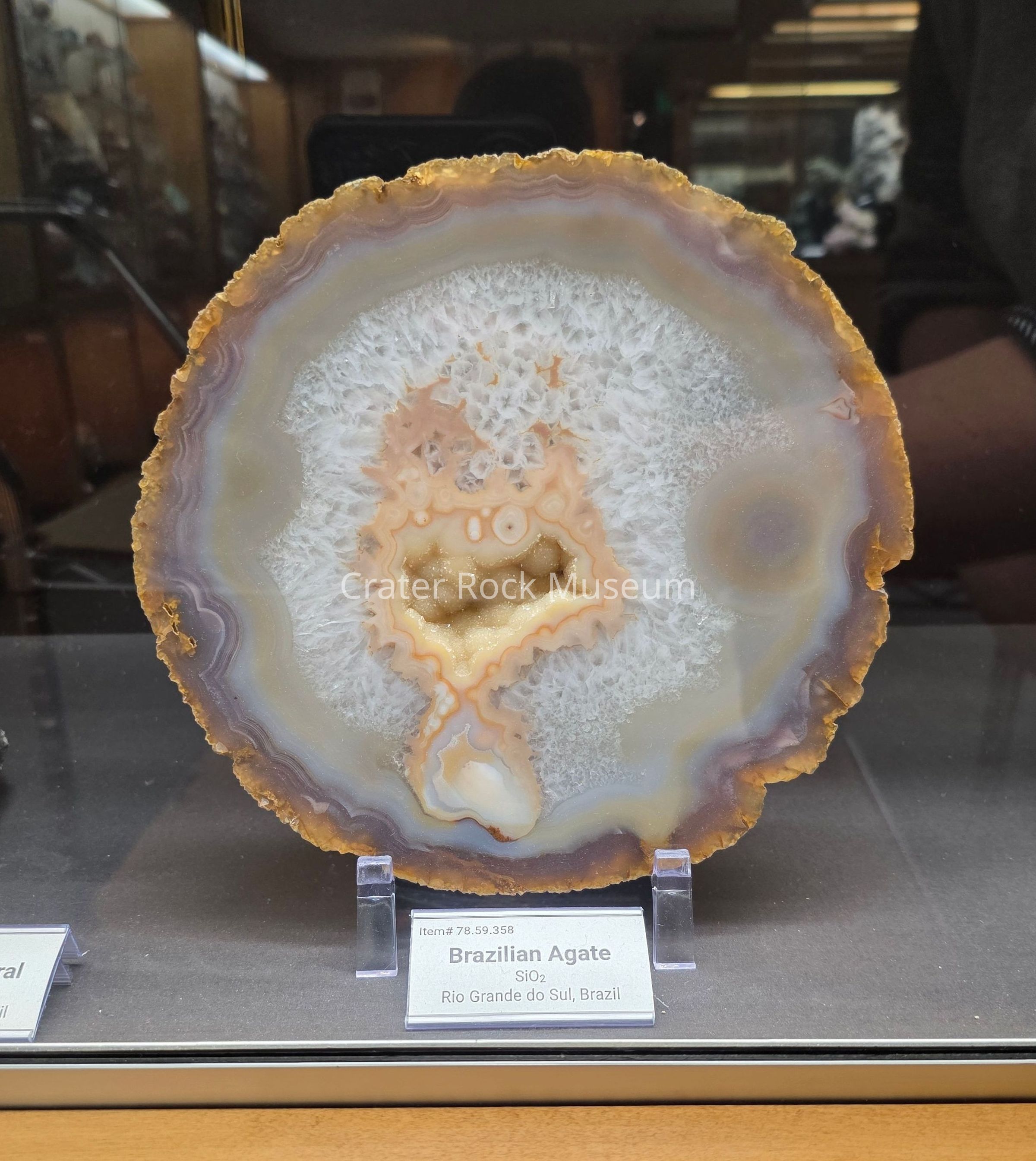 A 1/2" (1.2 cm) thick slice of an Agate from Brazil. Polished side shows a Yellow Drusy (sparkling) center of fortified Agate. Immediate Agate is in Curly Creams and Tan with some White and a rounded extension (infiltration hole). Surrounding this is a large Crystalline area, next are olive Green and Grey fortified lines with two large Eyes at opposite sides. Next is a Plum colored lines and Brown at outermost edge.Dimensions