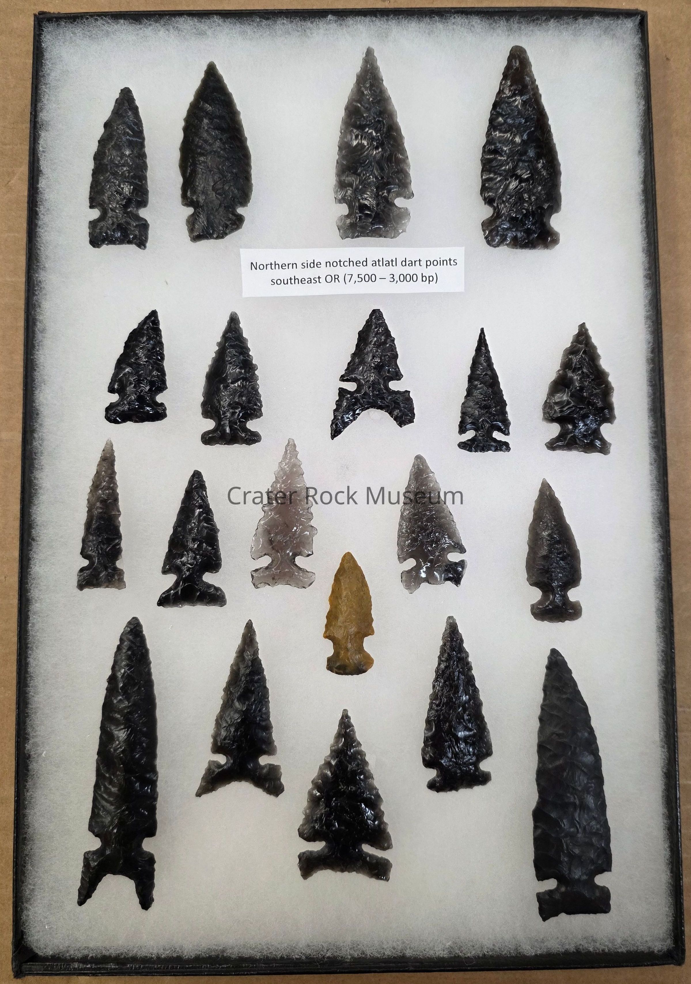 20 obsidian and jasper Northern side notch projectile points in an 8"x12" Riker frameCollection