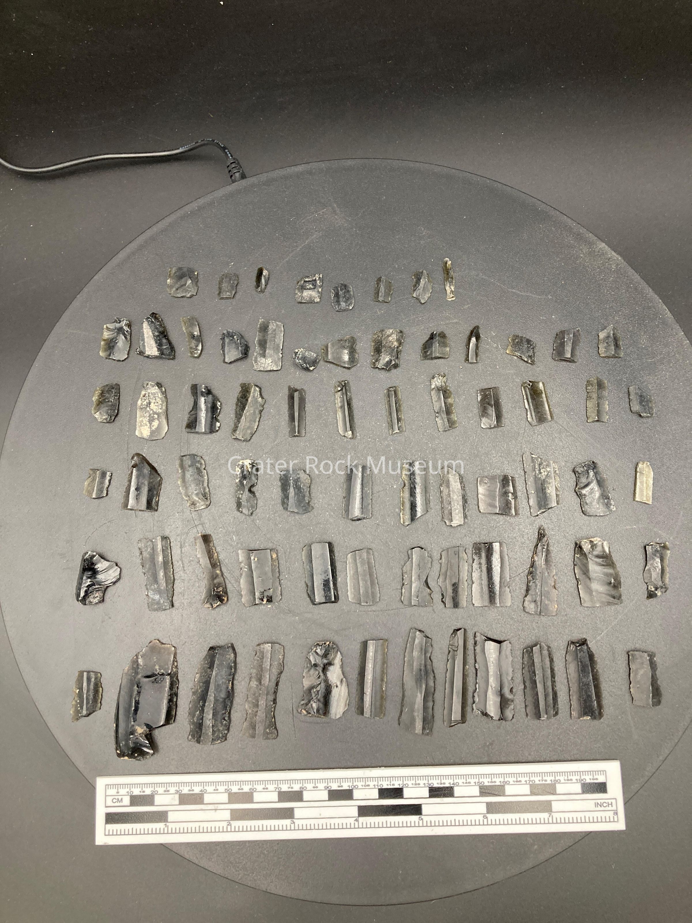 69 individual blades flaked from polyhedral prismatic obsidian cores. Likely for macuahuitl weaponry.