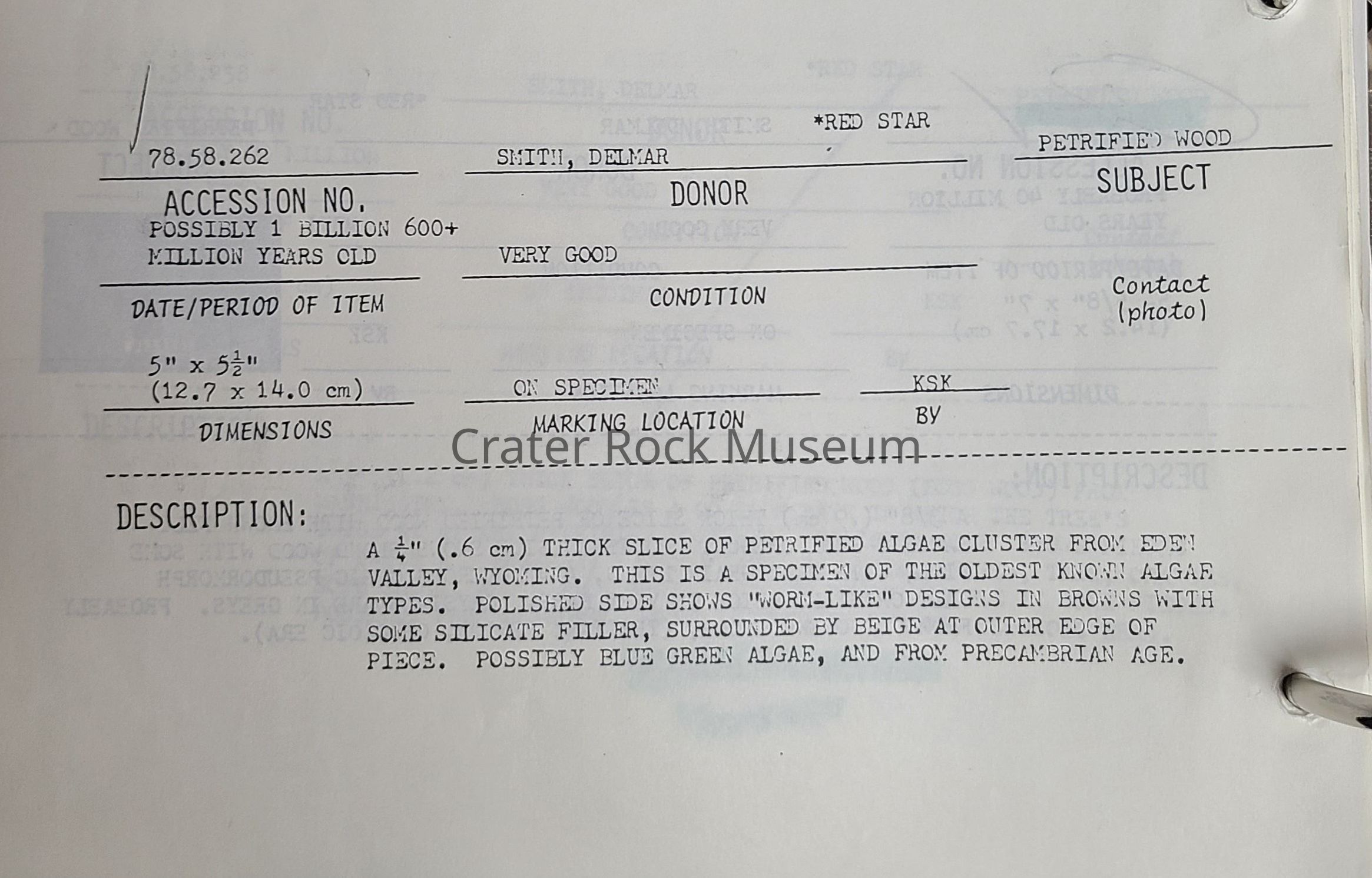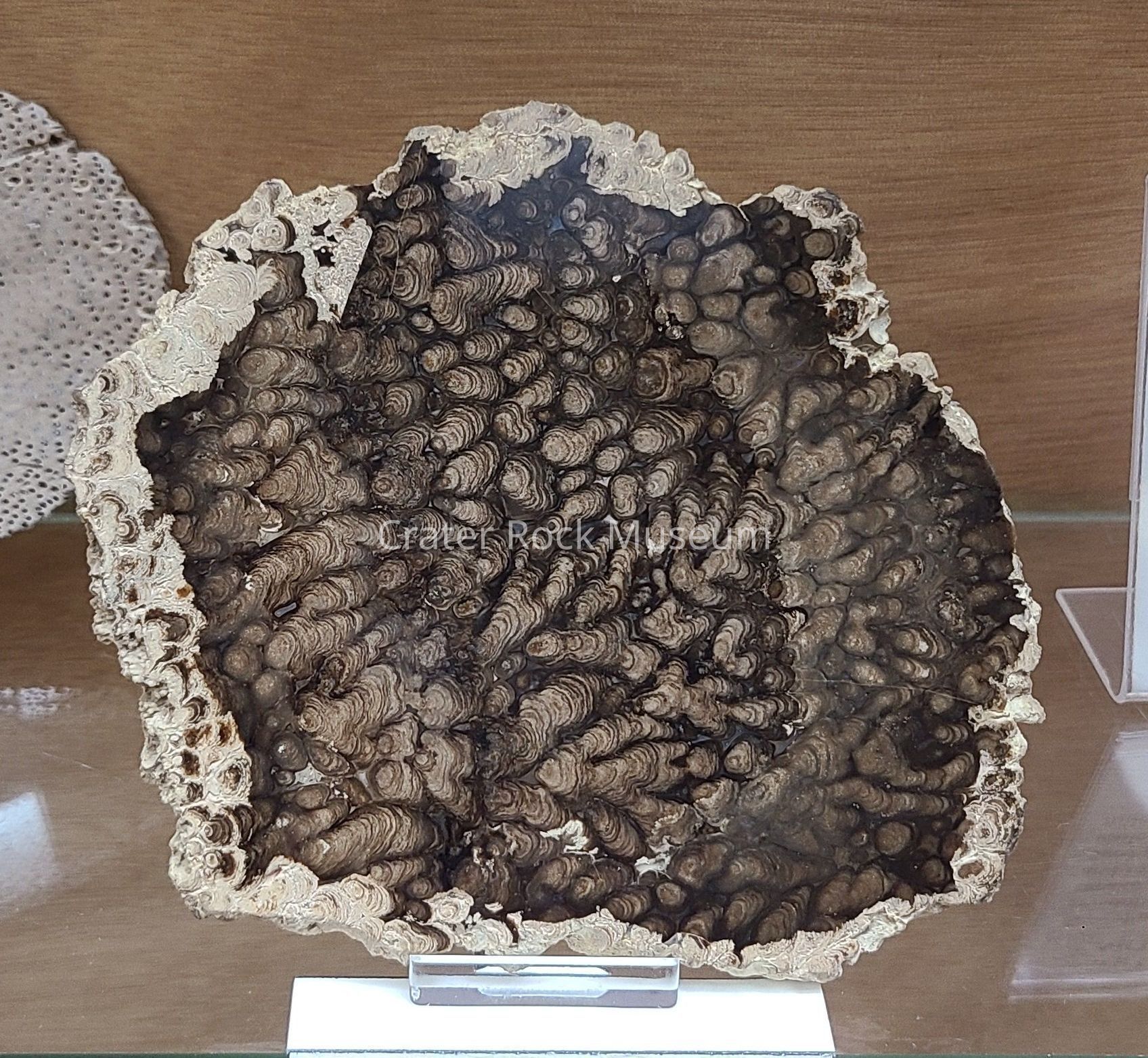 Delmar description: 1/4" (.6cm) thick slice of petrified algae cluster from Eden Valley, Wyoming . This is a specimen of the oldest known algae types. Polished side shows "worm-like" design in browns with some silicate filler surrounded by beige at the outer edge of piece. Possibly blue green algae, and from Precambrian ageLocation