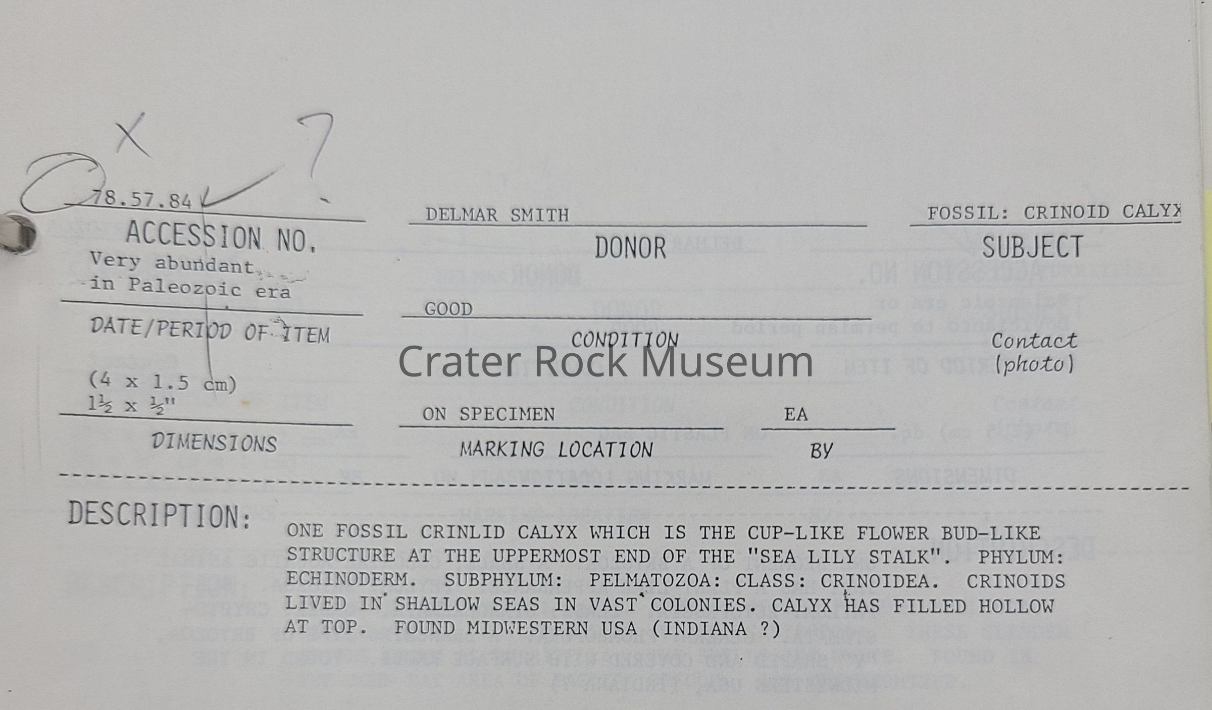 Calyx has a filled (permineralized) hollow on its dorsal (top) side.Collection