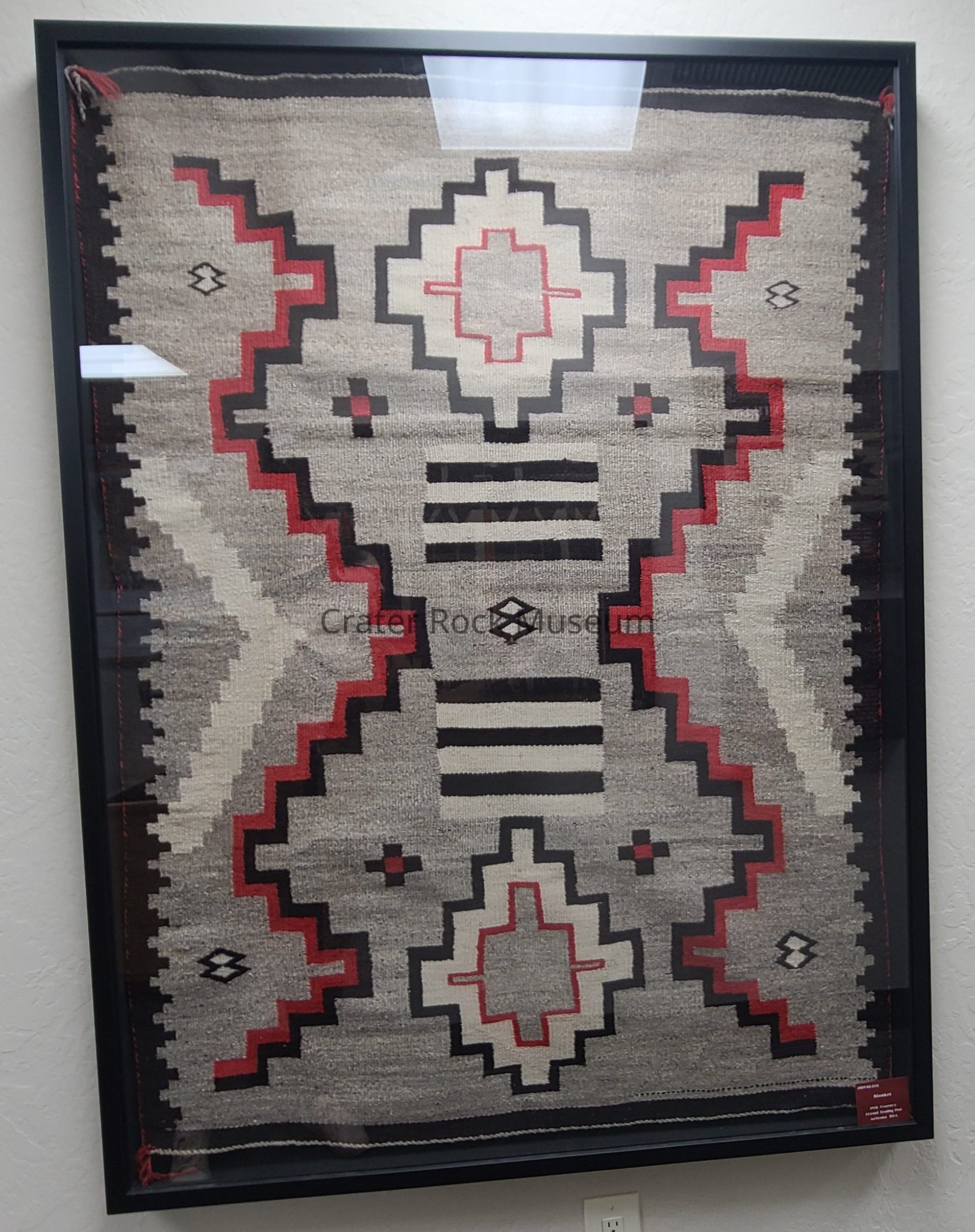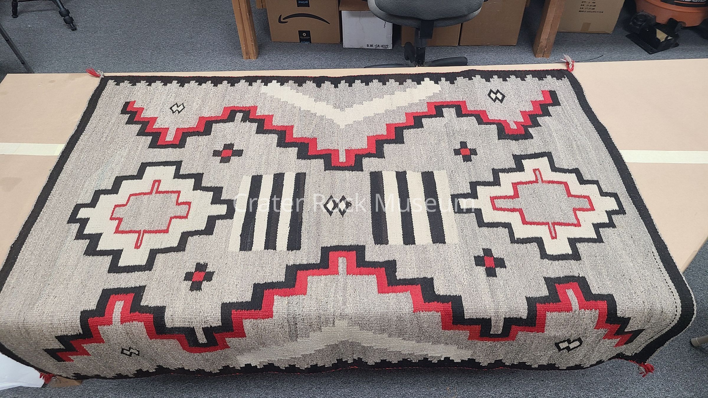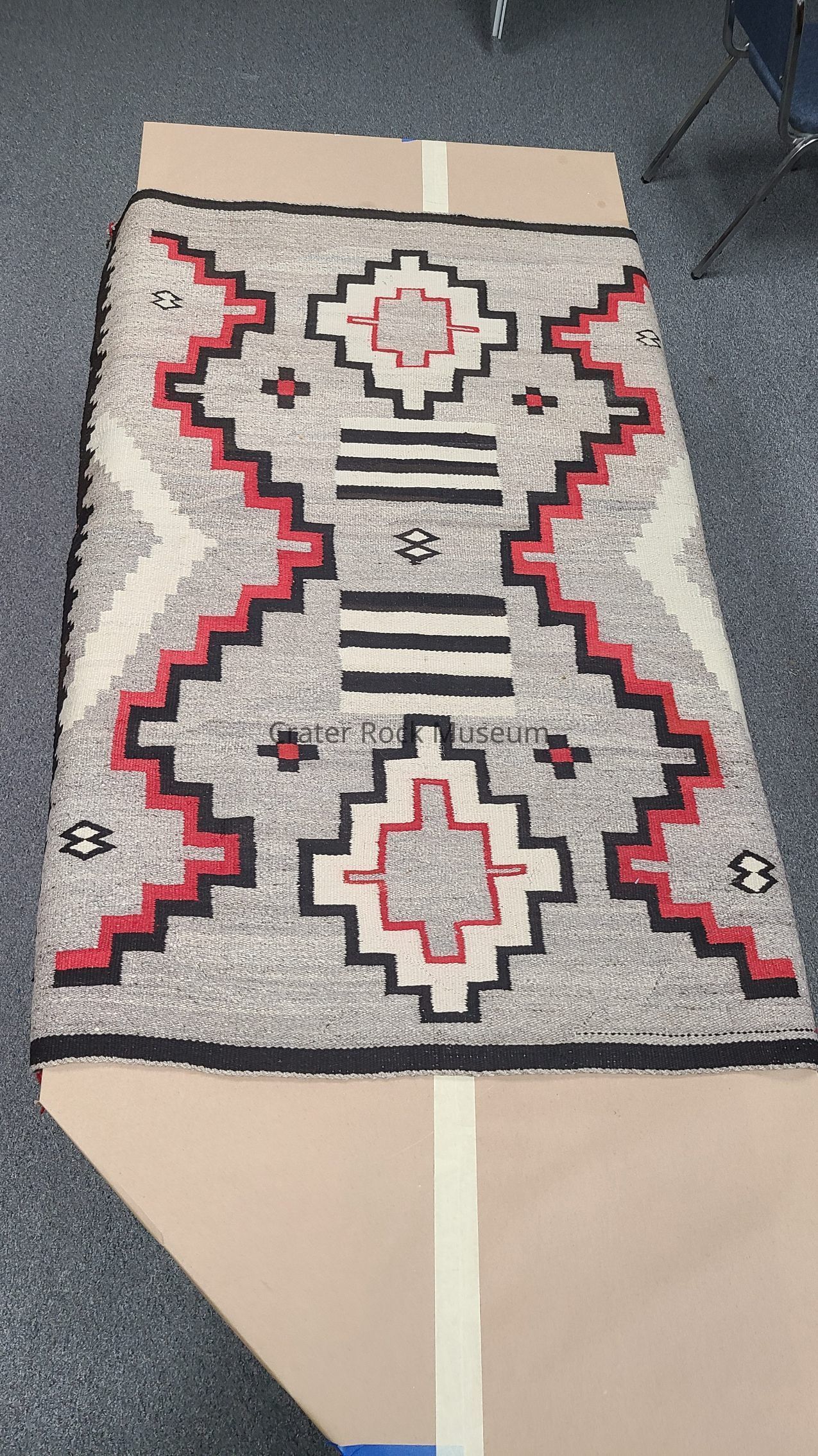Dine (Navajo) blanket- Black, Gray, Red on White. Four winds designs manufactured between 1900-1940Location