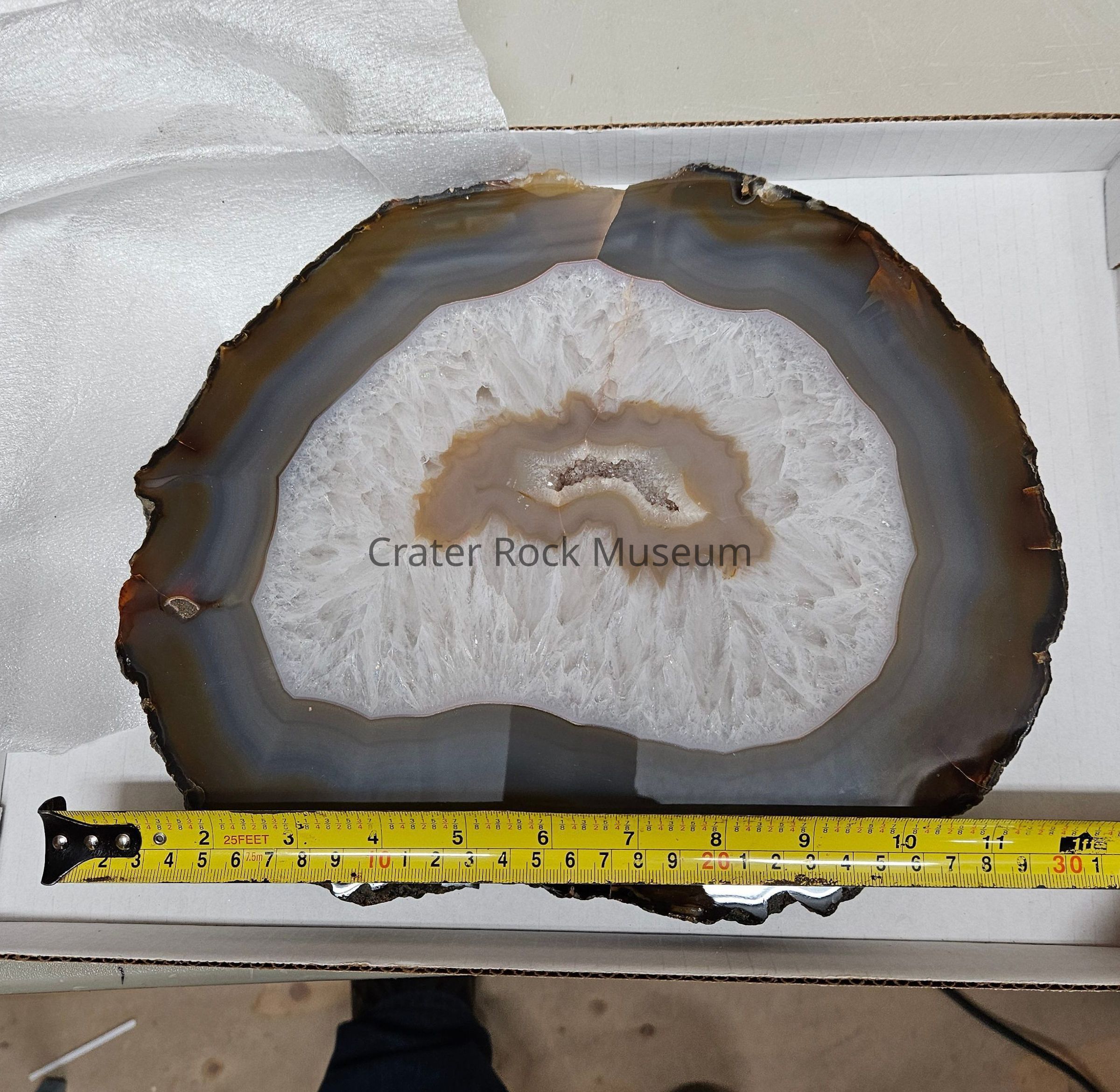 A 3/4" (1.9 cm) thick slice of an Agate from Brazil. Polished side shows open Crystalline center surrounded by Light Grey and Yellow Agate, then a large Crystalline band then fortified Agate in Blue Greys, Browns and Black at outer edge. One Crystalline hole is to one side. One edge is broken off.Dimensions