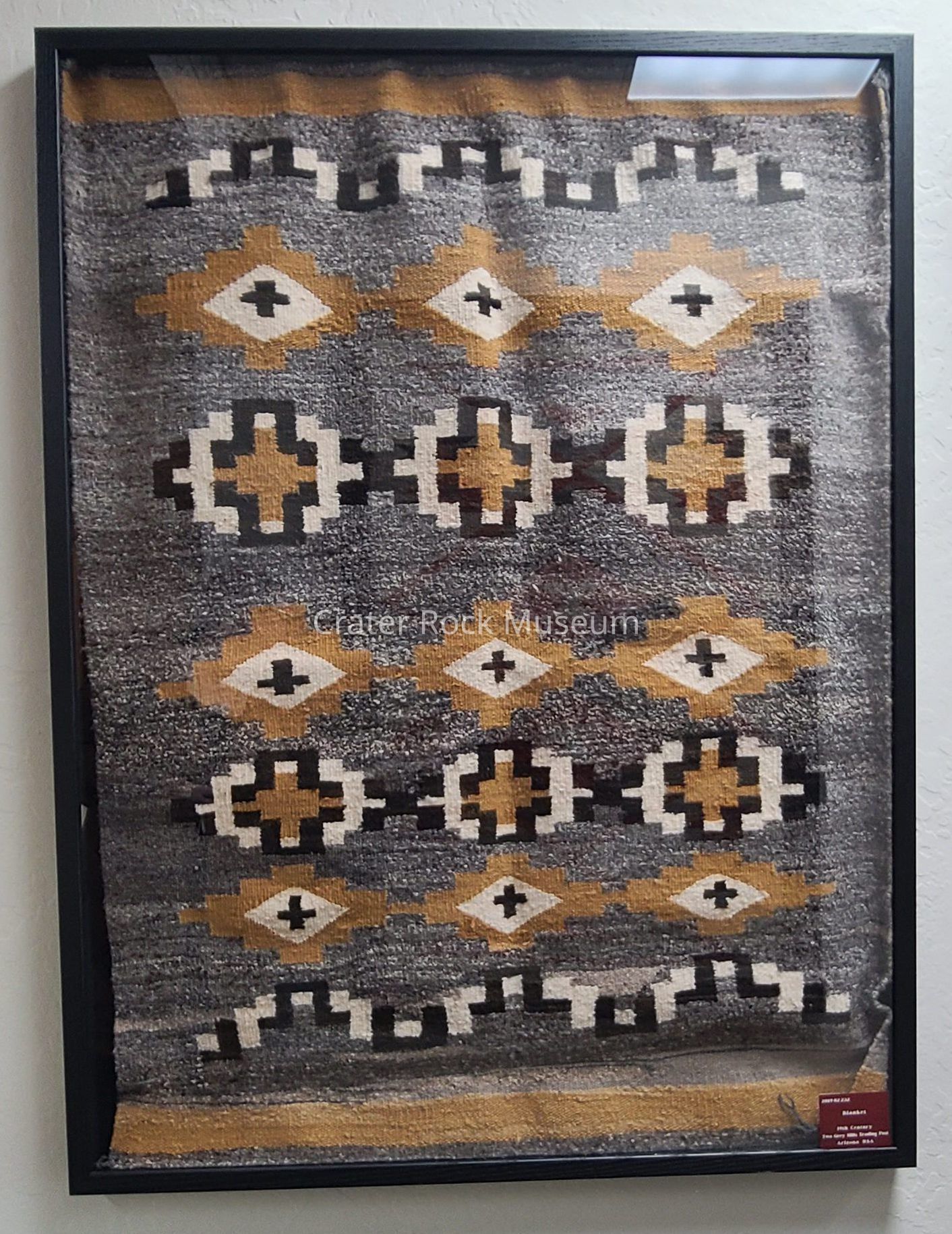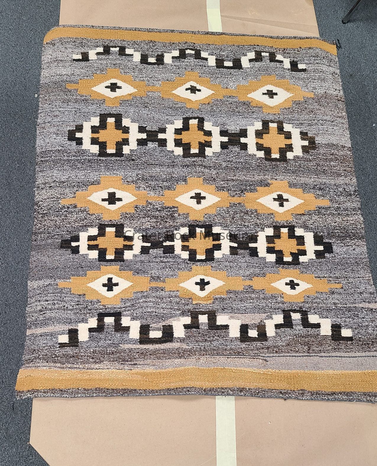 Woven blanket of grey, browns, yellow, and white with geometric patterns