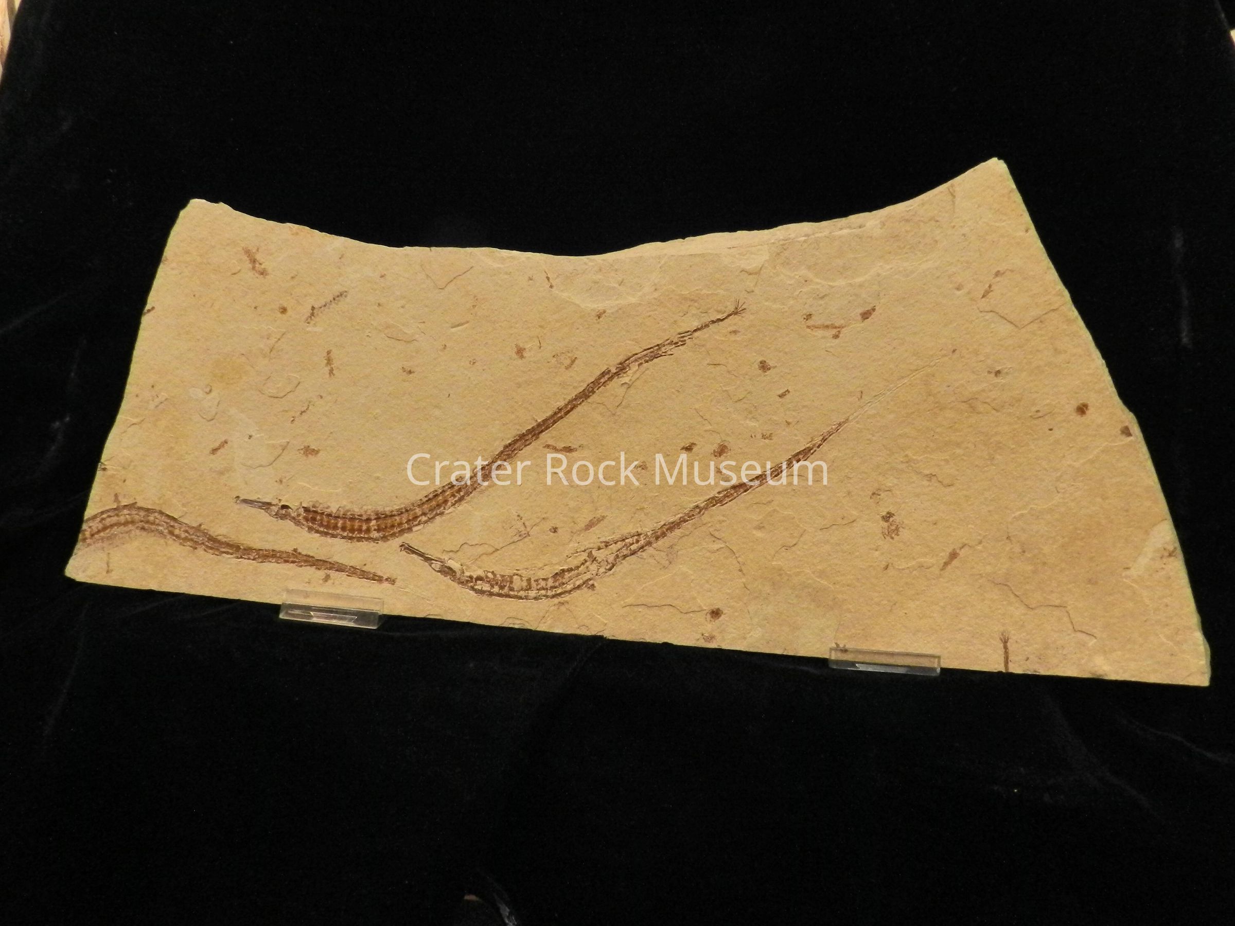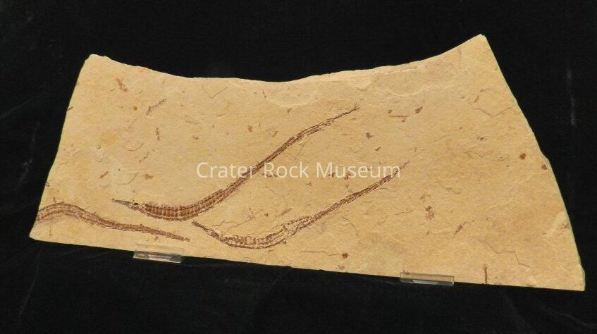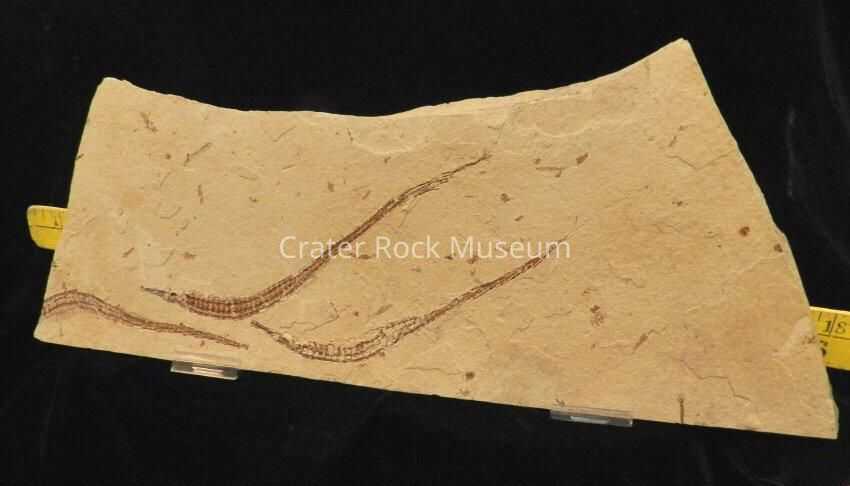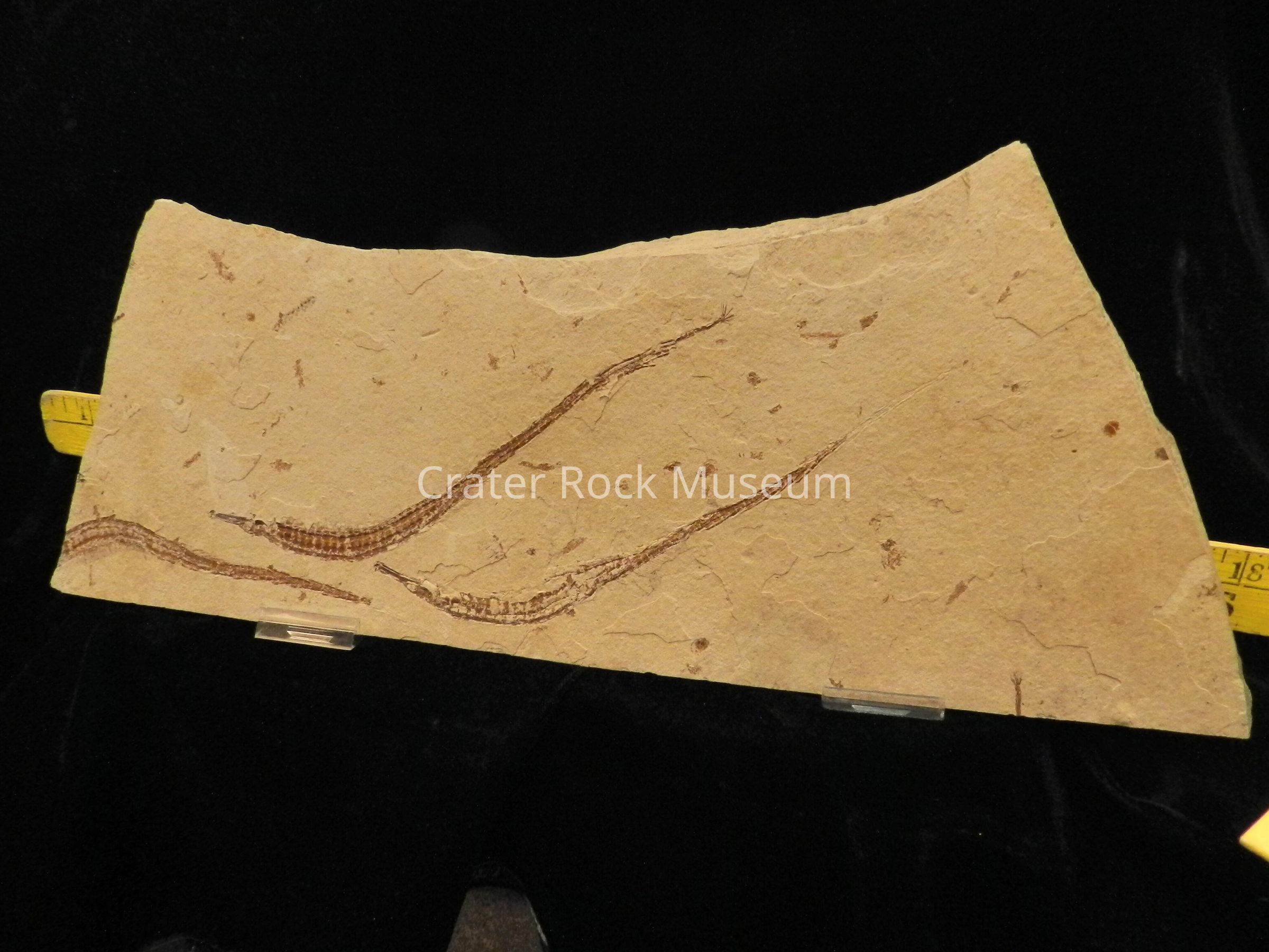 Description: Large thick slab with irregular shape. Three distinct fossilized pipe fish, each approx. 6 to 9 inches long. Beige matrix with reddish-brown fossils.