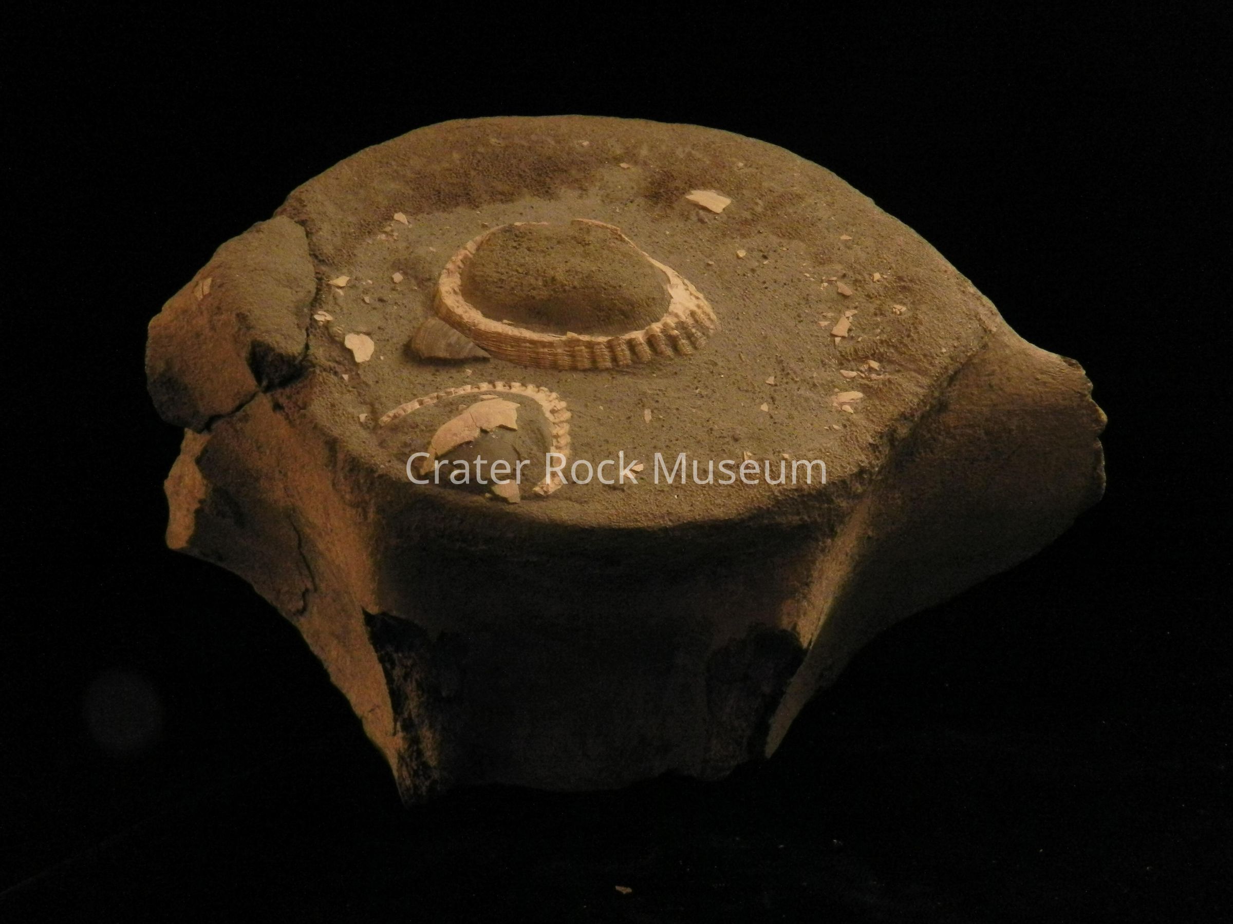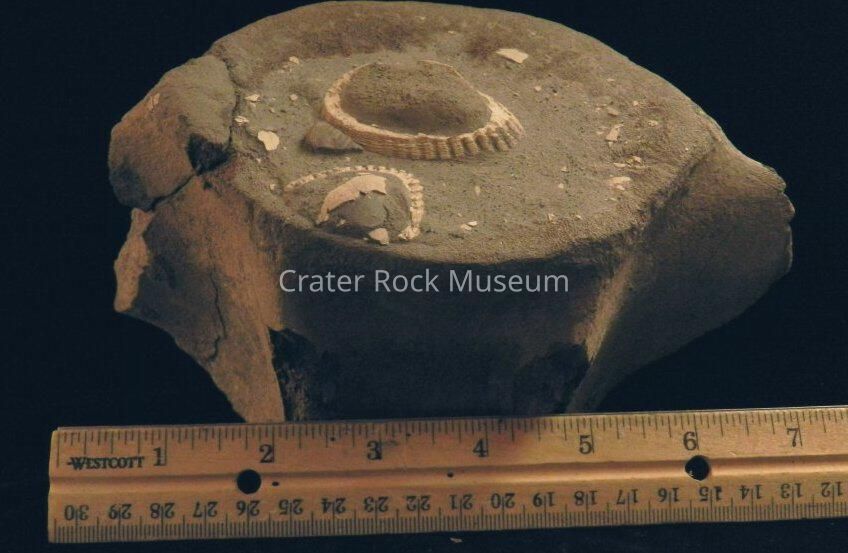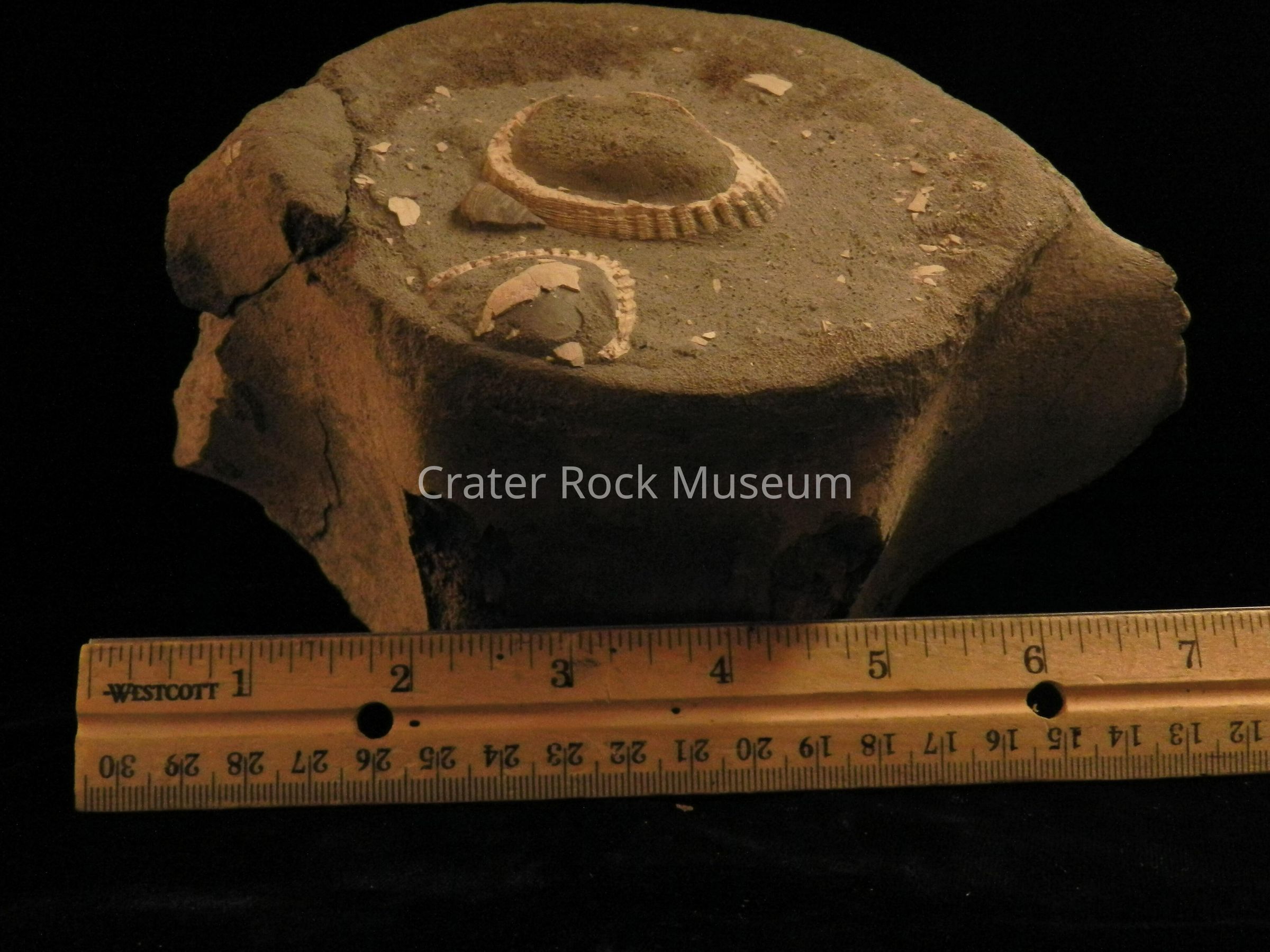 Description: A smaller vertebre (perhaps the tail) from an unknown species of whale. One end has two(2) shell crustations embedded at the top. Gray to brown in color.