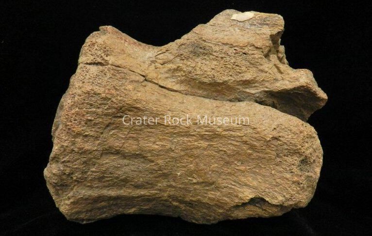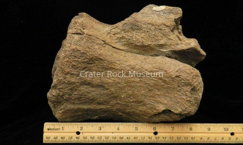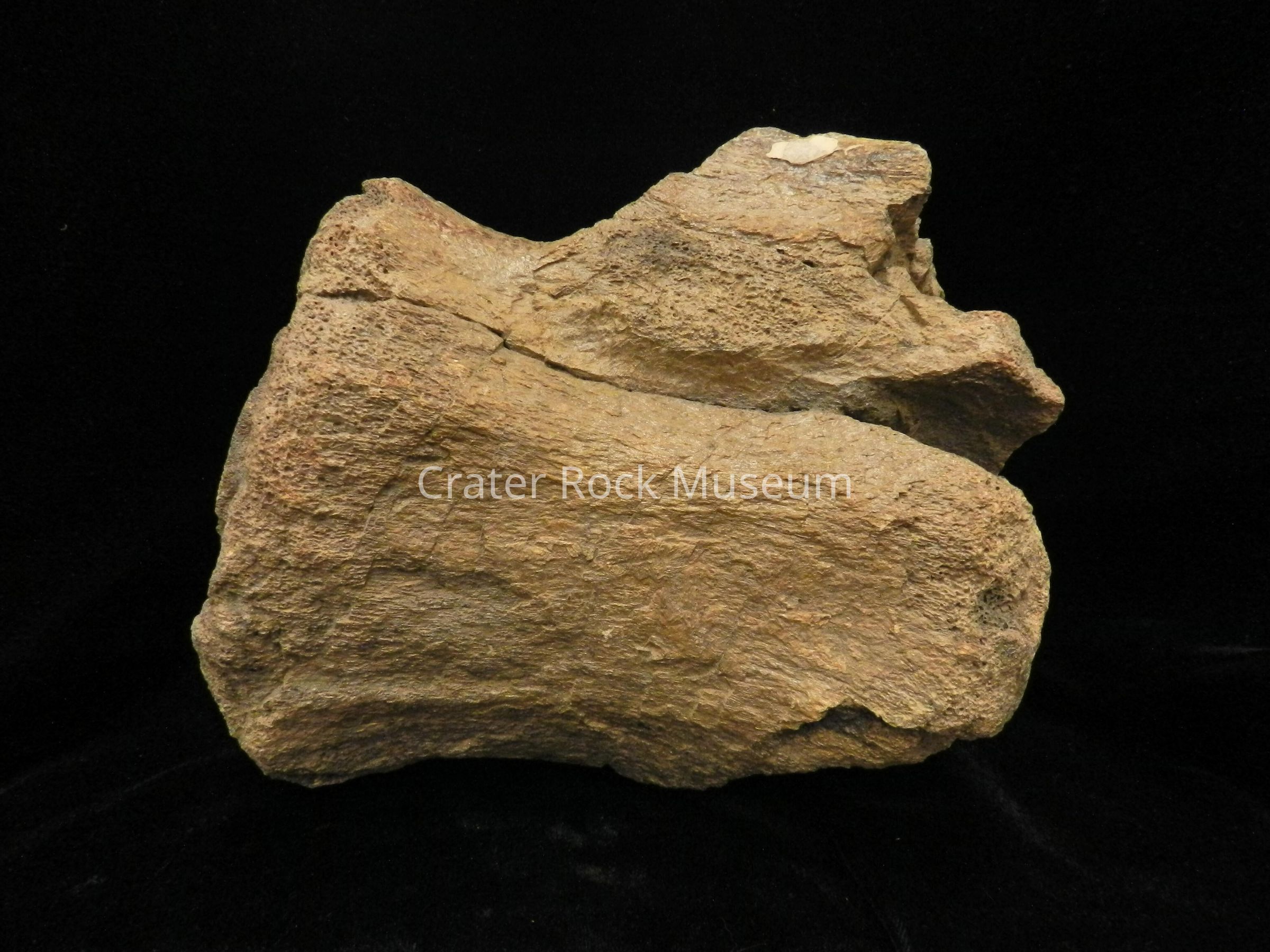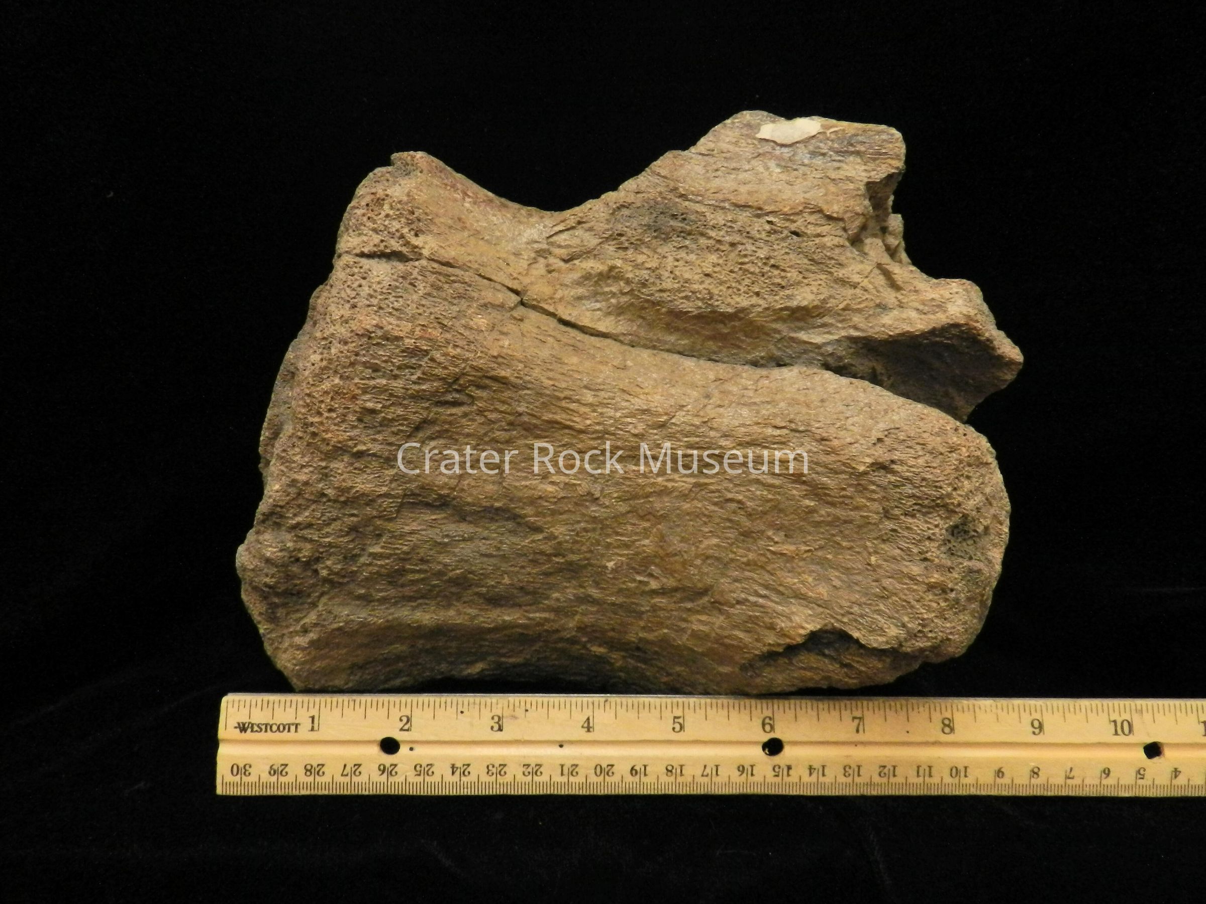 Description: Large fossilized bone (vertebre) (species unknown). Very heavy with concave "flat spot" on one end. Various shades of brown with noticeable porosity.