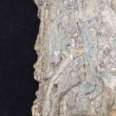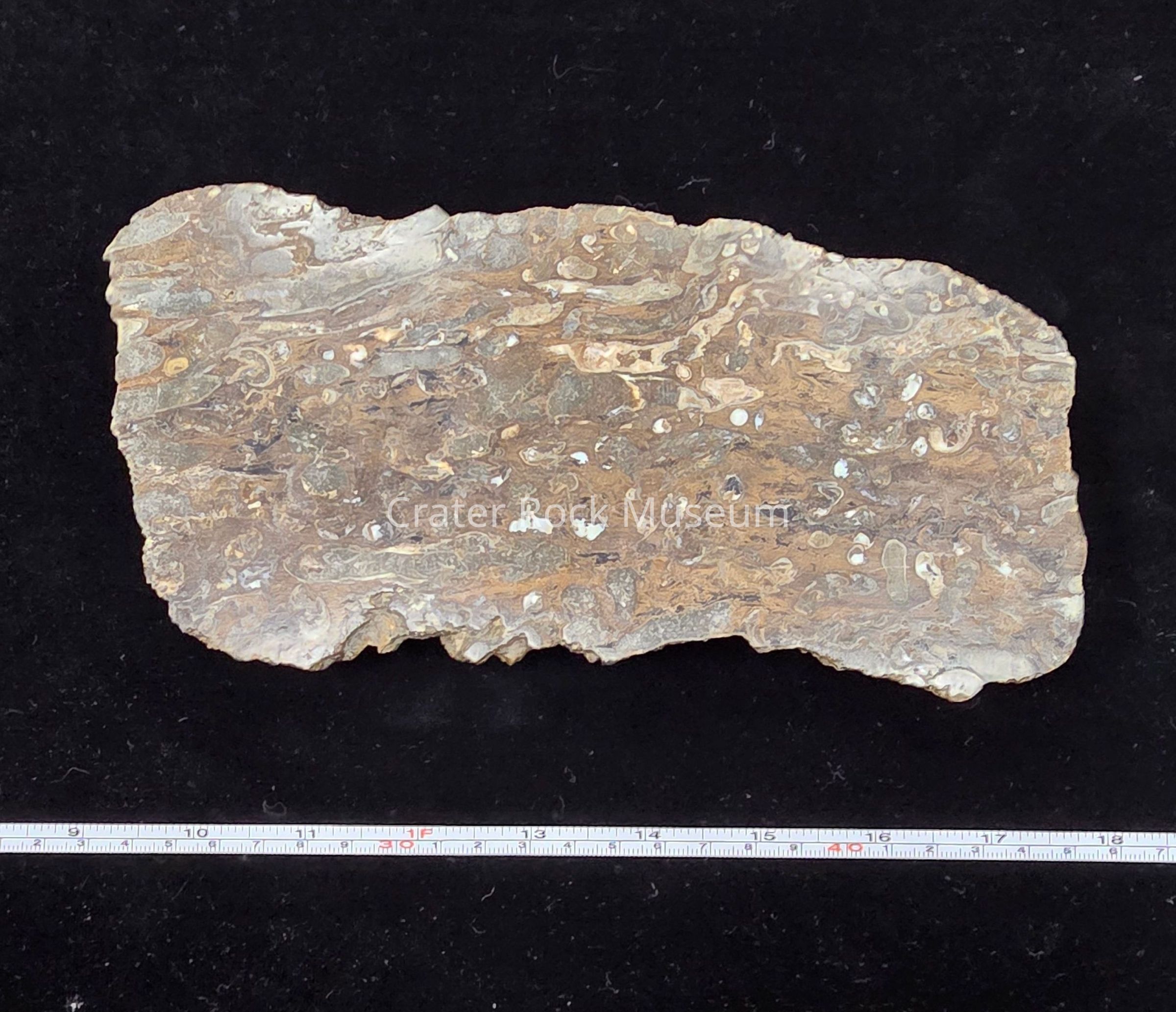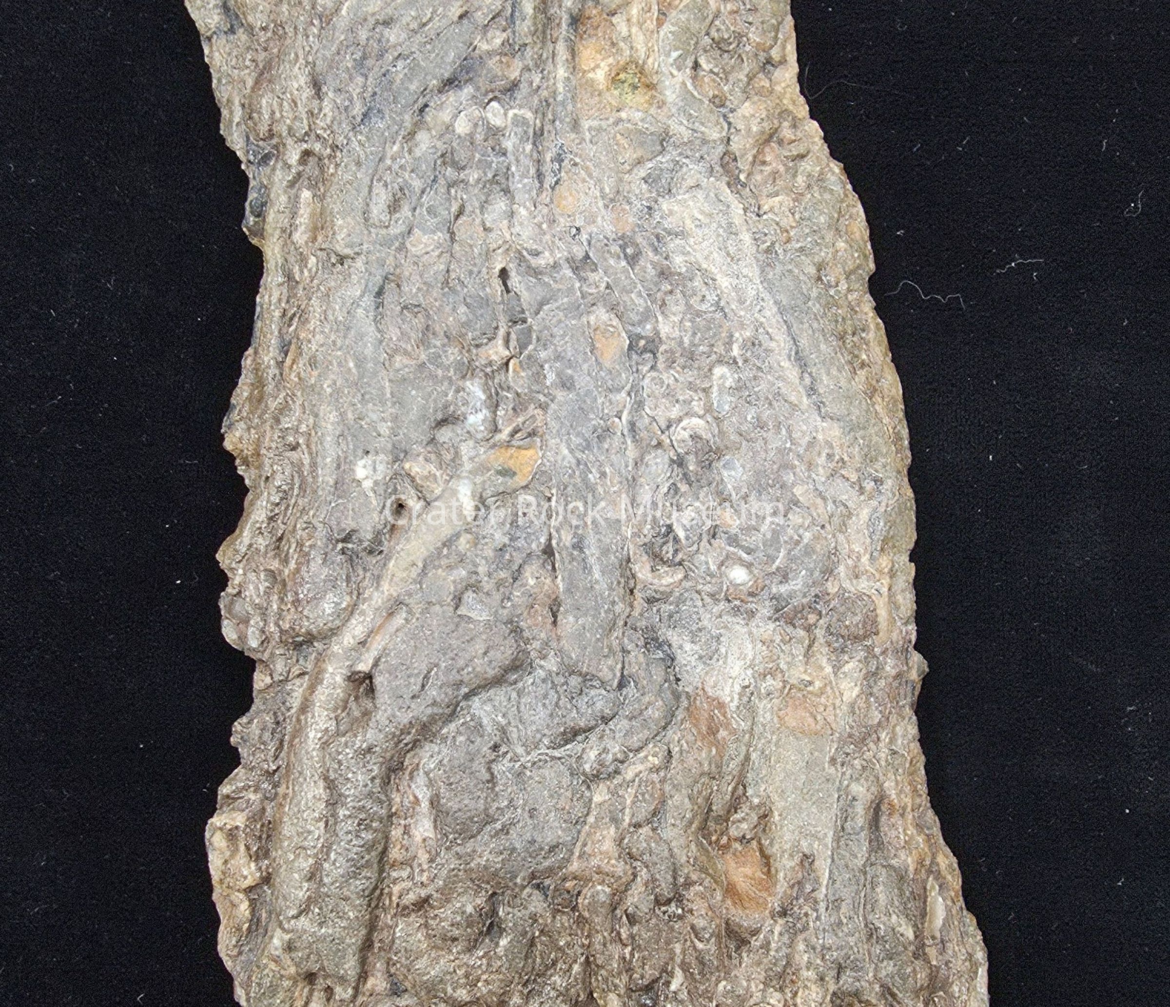 a V-cut butt cut slab with ship worm (teredo worm) damage. Irregular patterns of circular and cylindrical tunnels in grey-brown, brown, tan, and some white.Dimensions