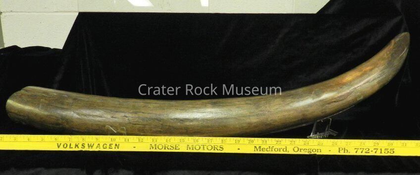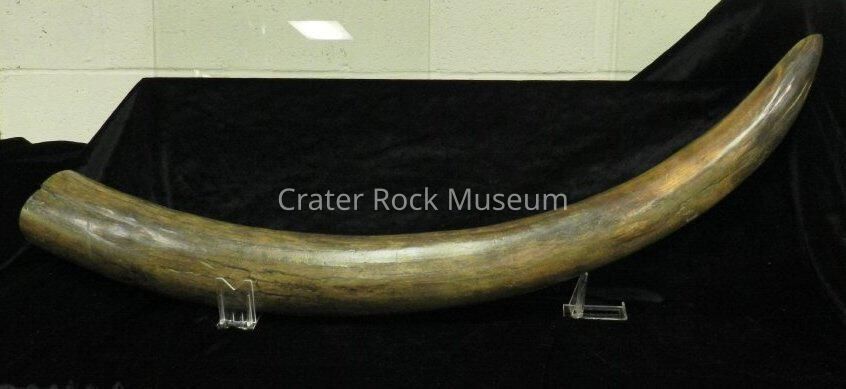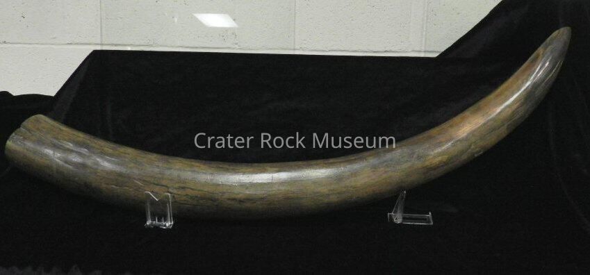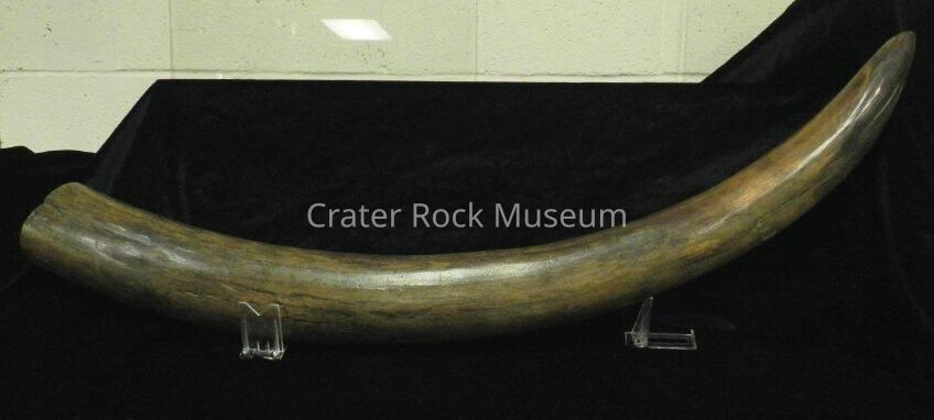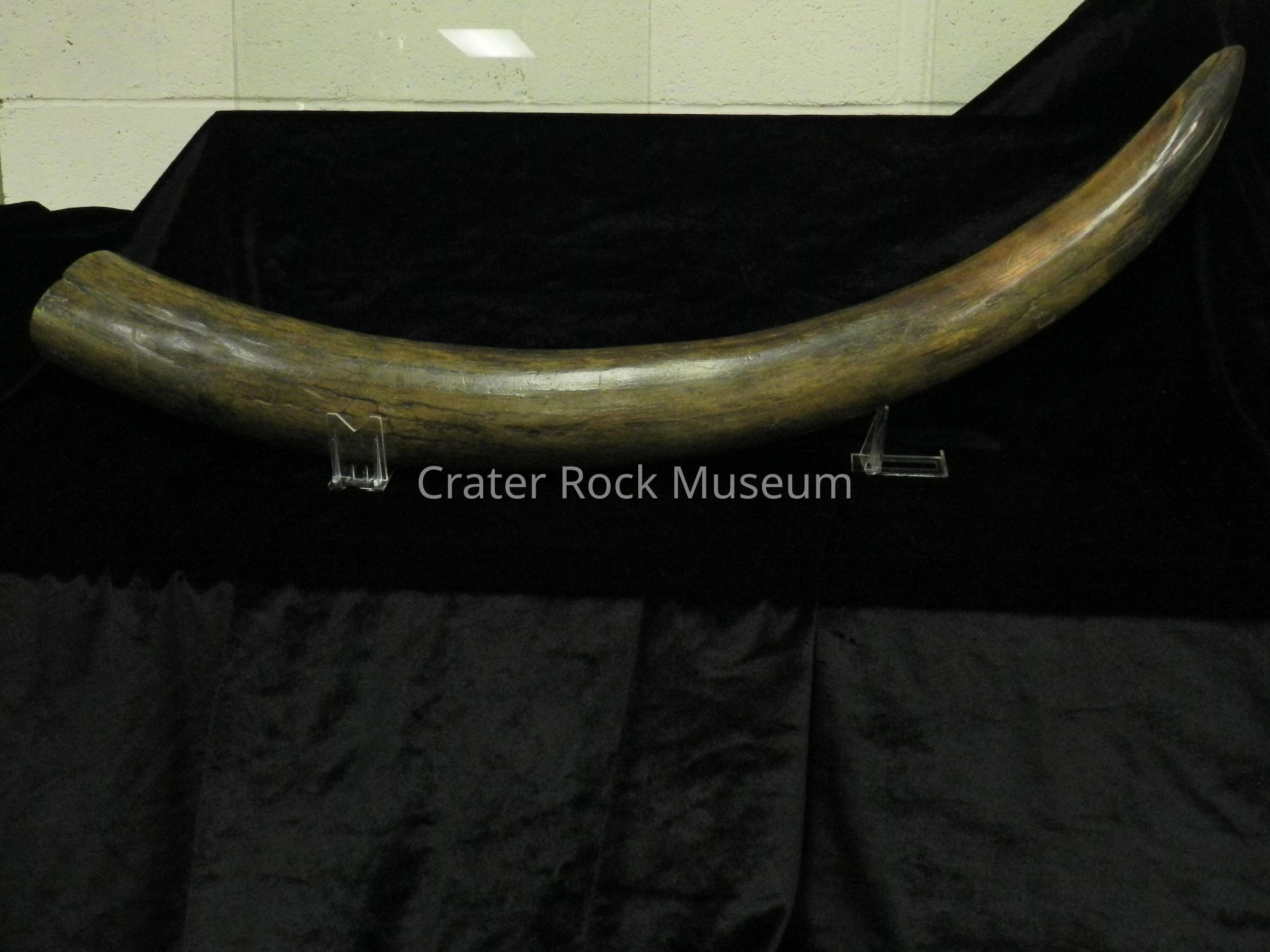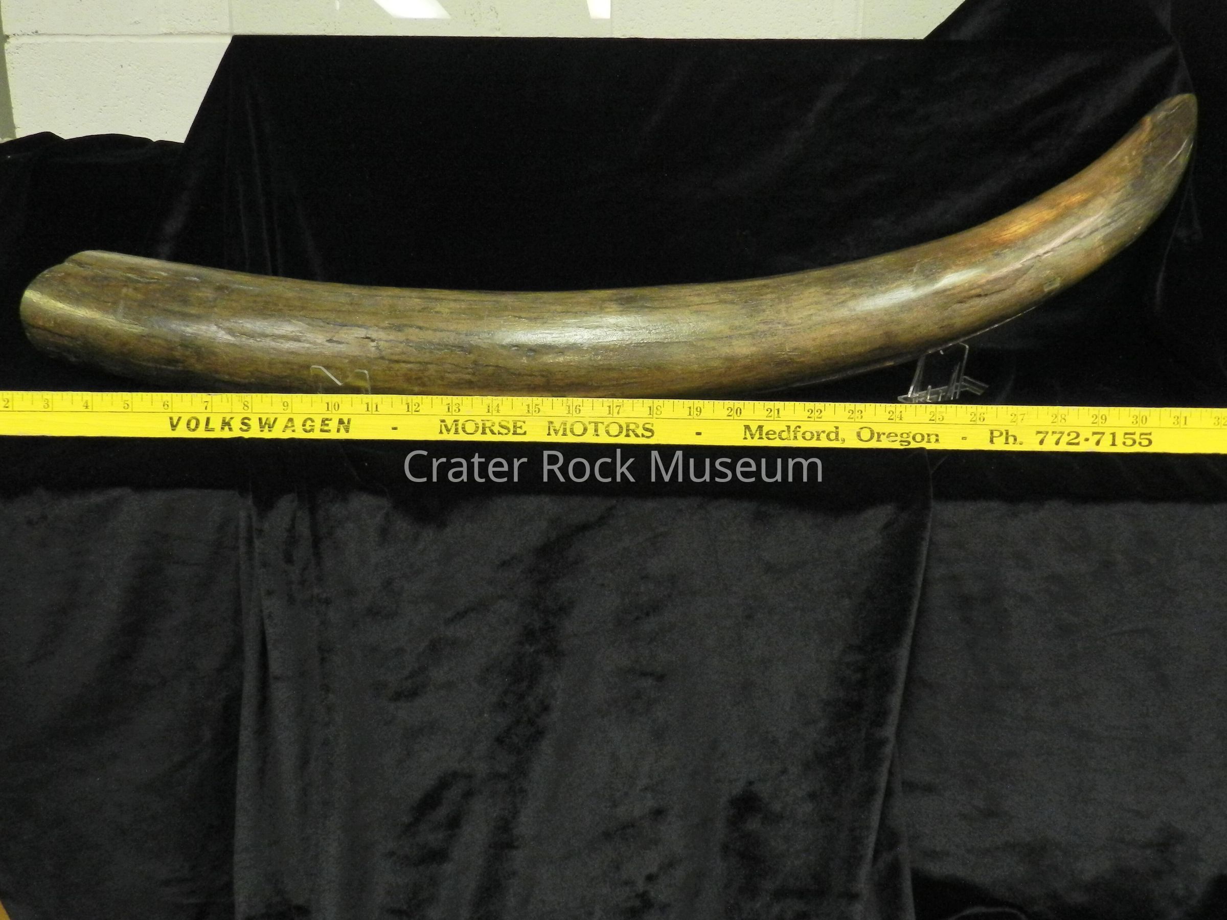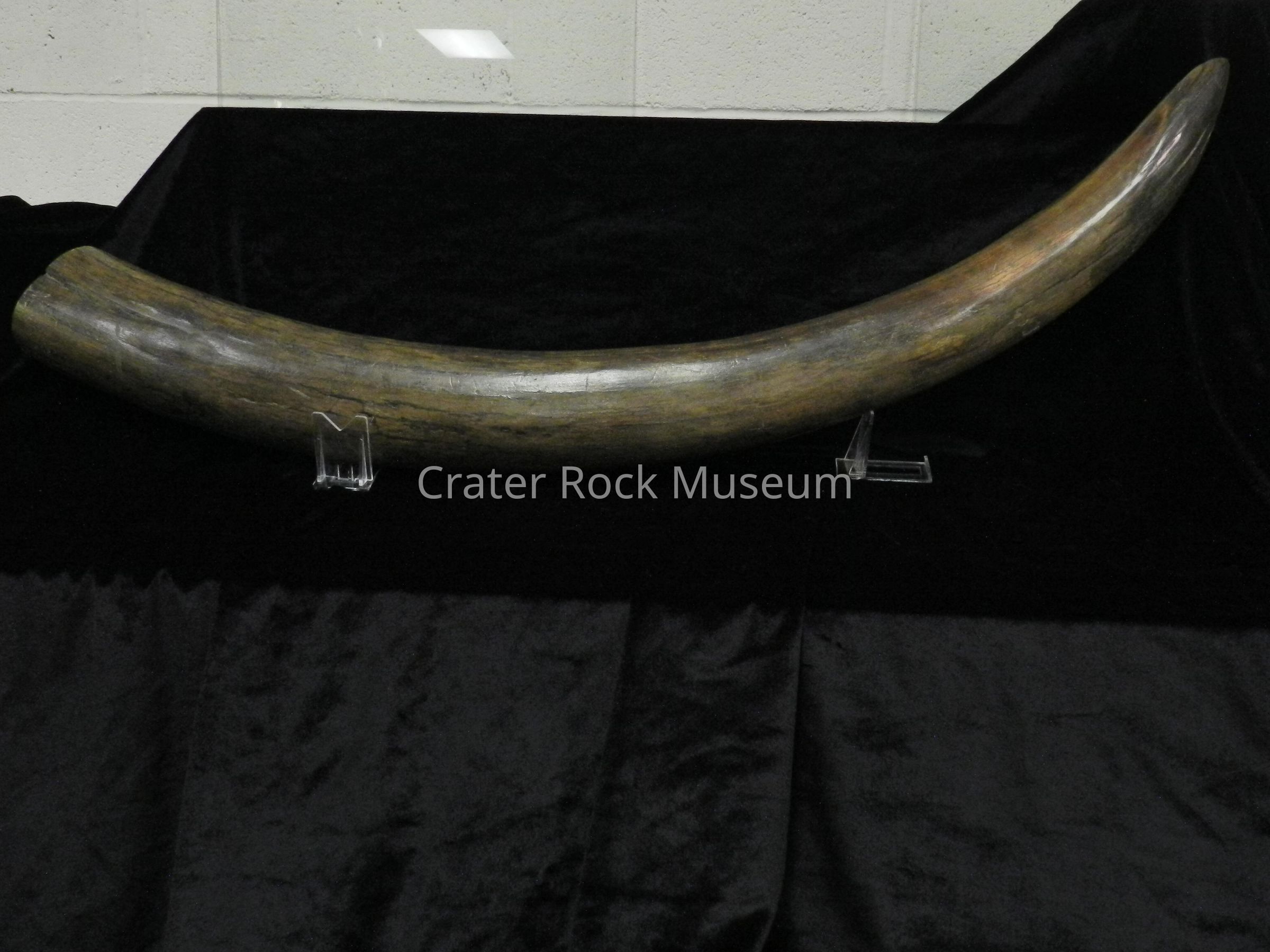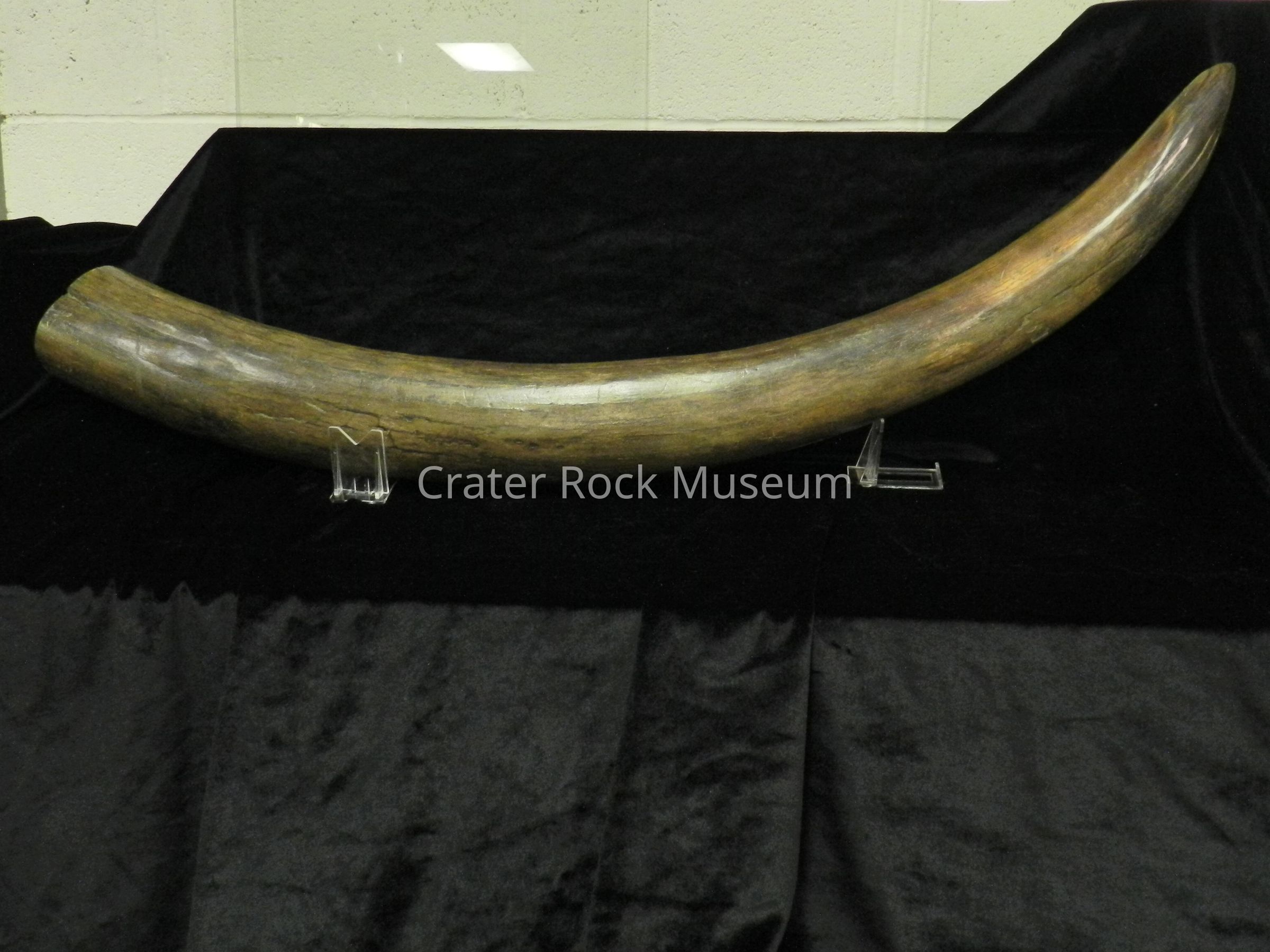 Description: Long large Mastodon tusk. Brown and tan with some linear cracking. Very well preserved.