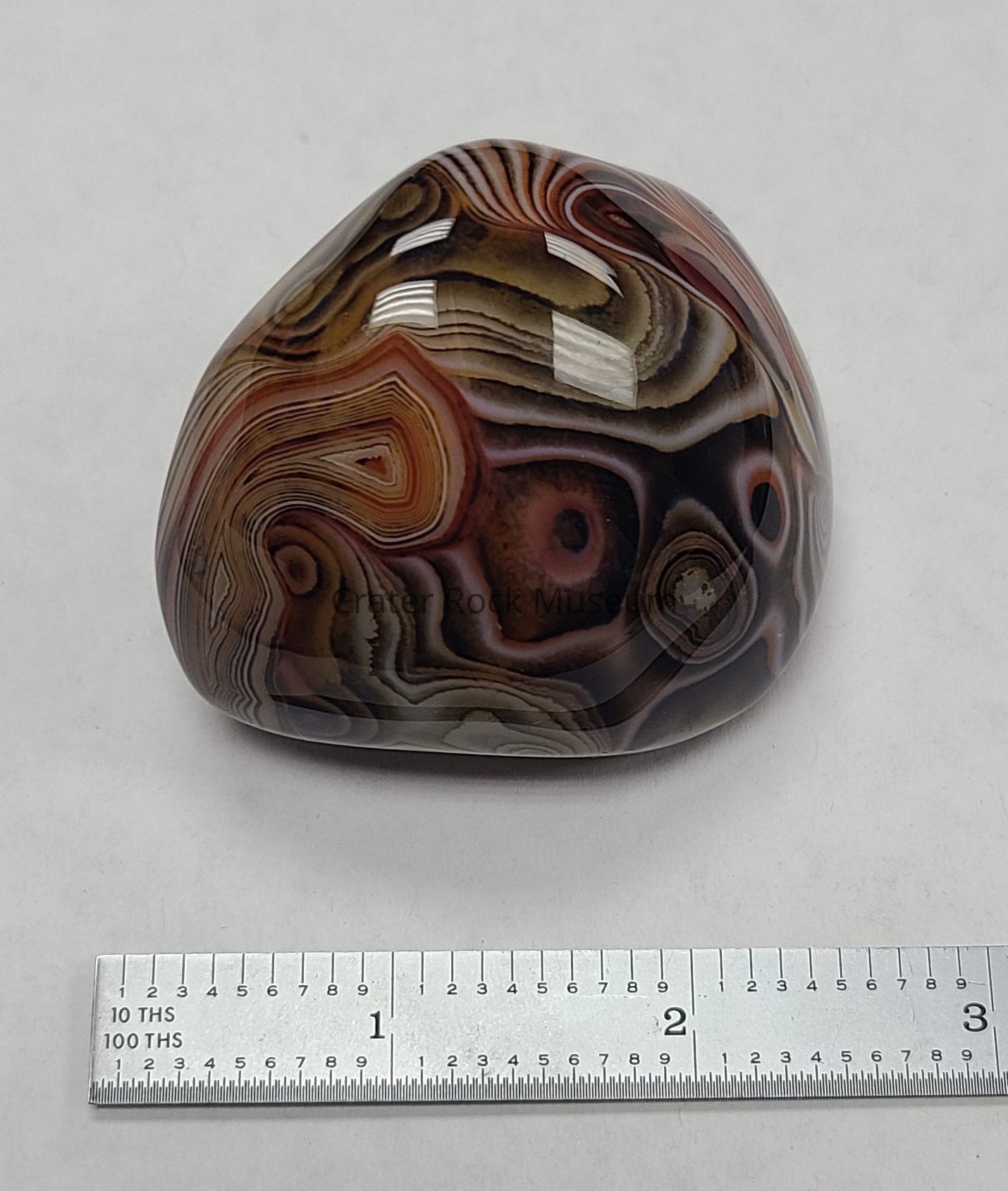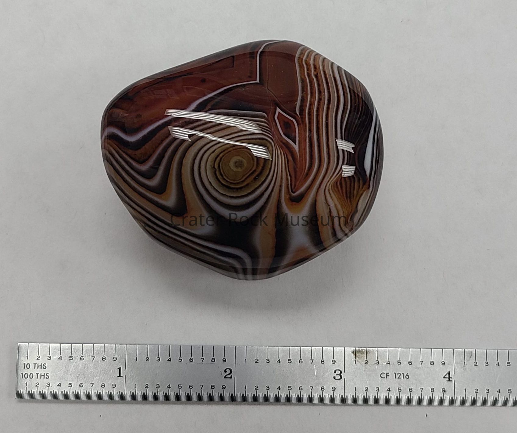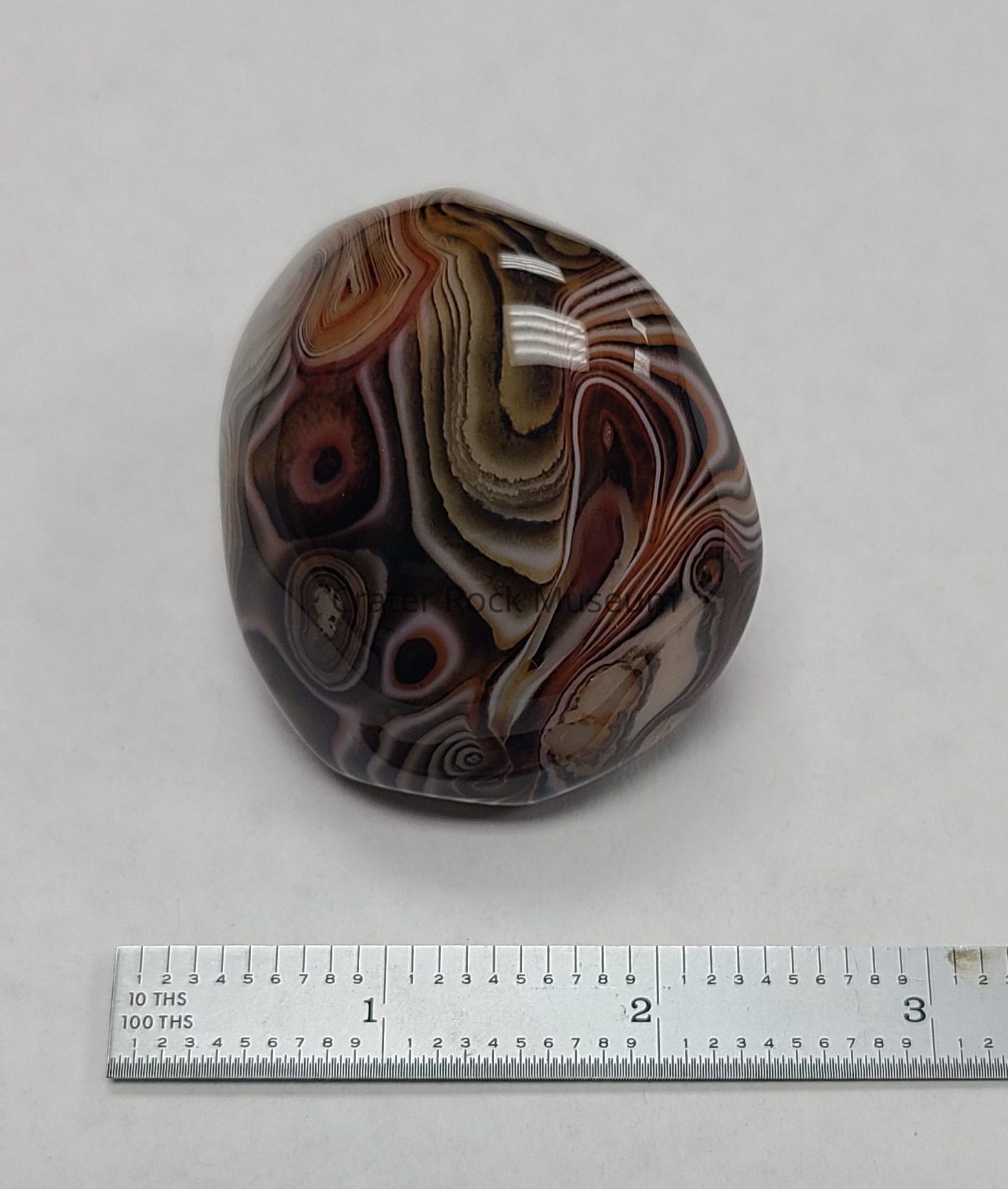 The image showcases a polished sardonyx gemstone, featuring intricate layers of reddish-brown, white, and darker hues that create captivating, swirling patterns. This semi-precious stone, with its glossy surface, is placed above a measuring ruler, indicating its size within a well-lit environment, emphasizing its smooth, rounded shape and the natural beauty of its banded designs. The unique patterns seen in the sardonyx are often valued in jewelry making and collection.