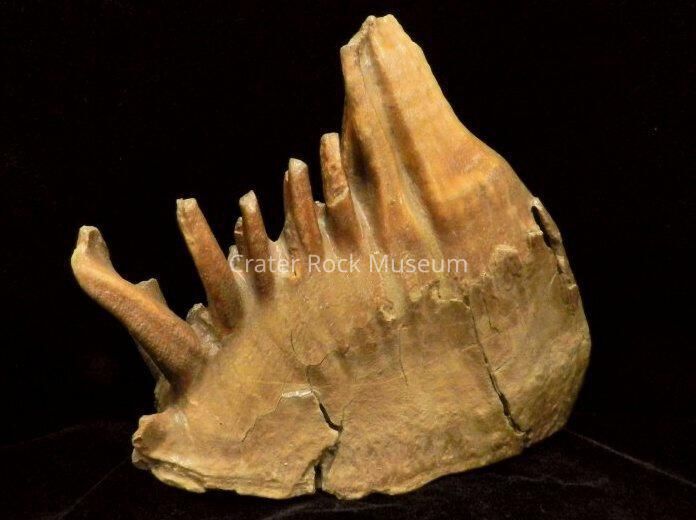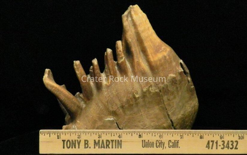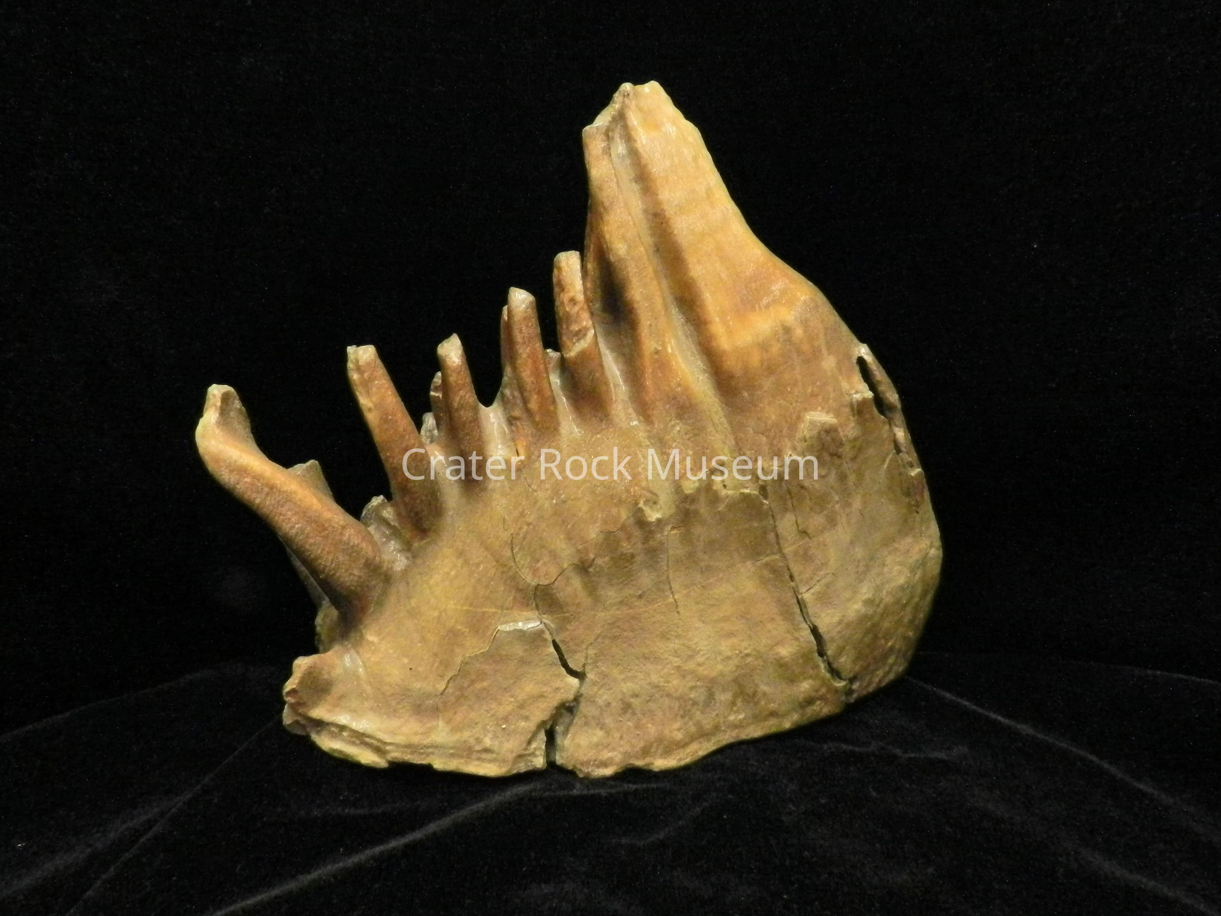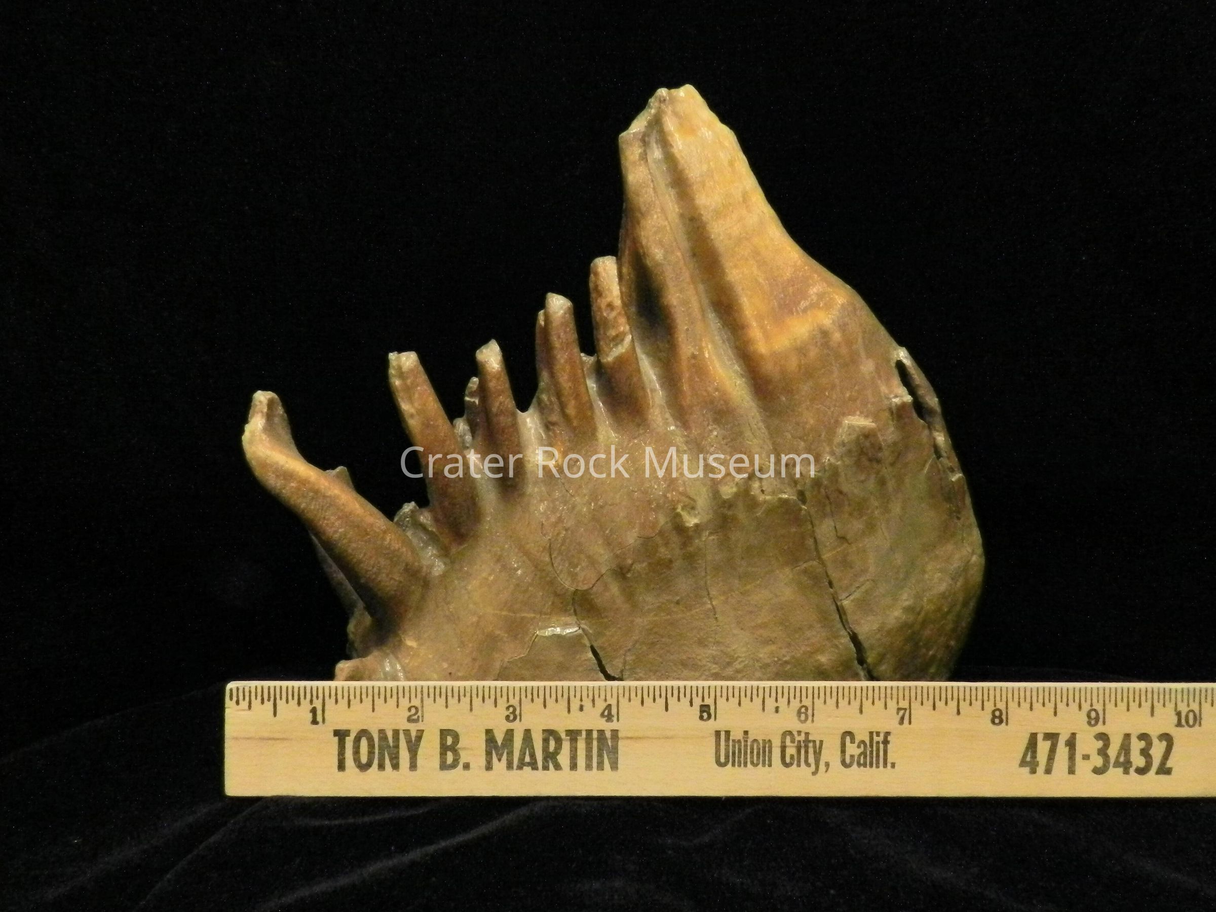Description: Large single mollar with extensive root system. Brown to tan to dull yellow at tips of roots. (specimen is varnished)