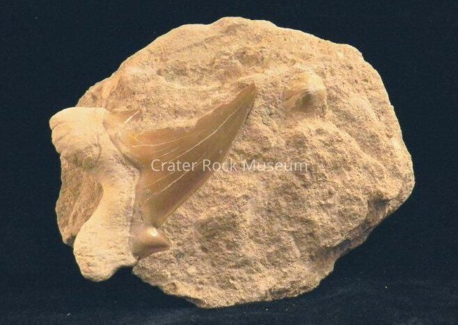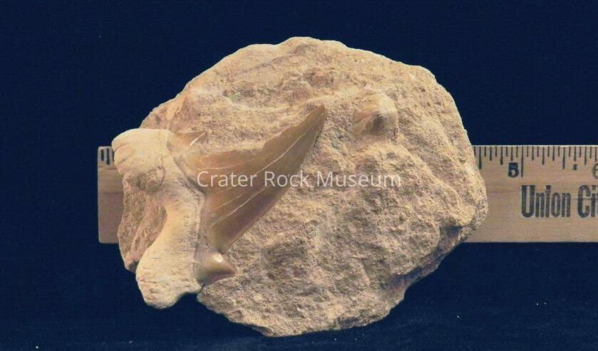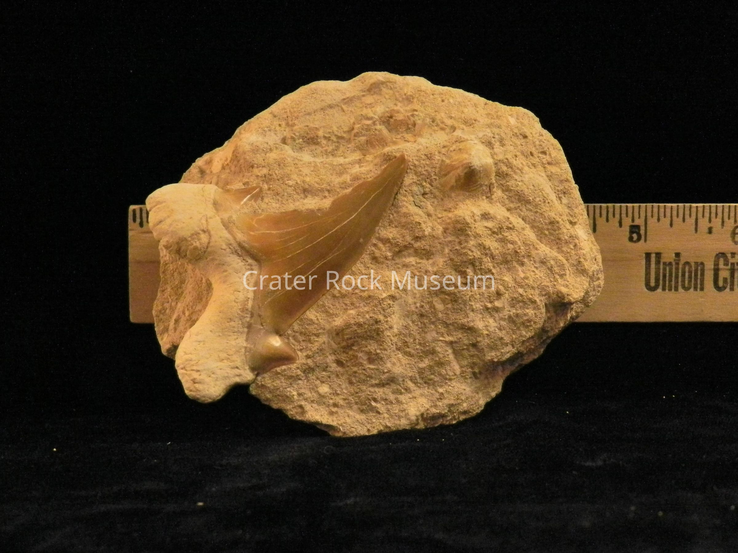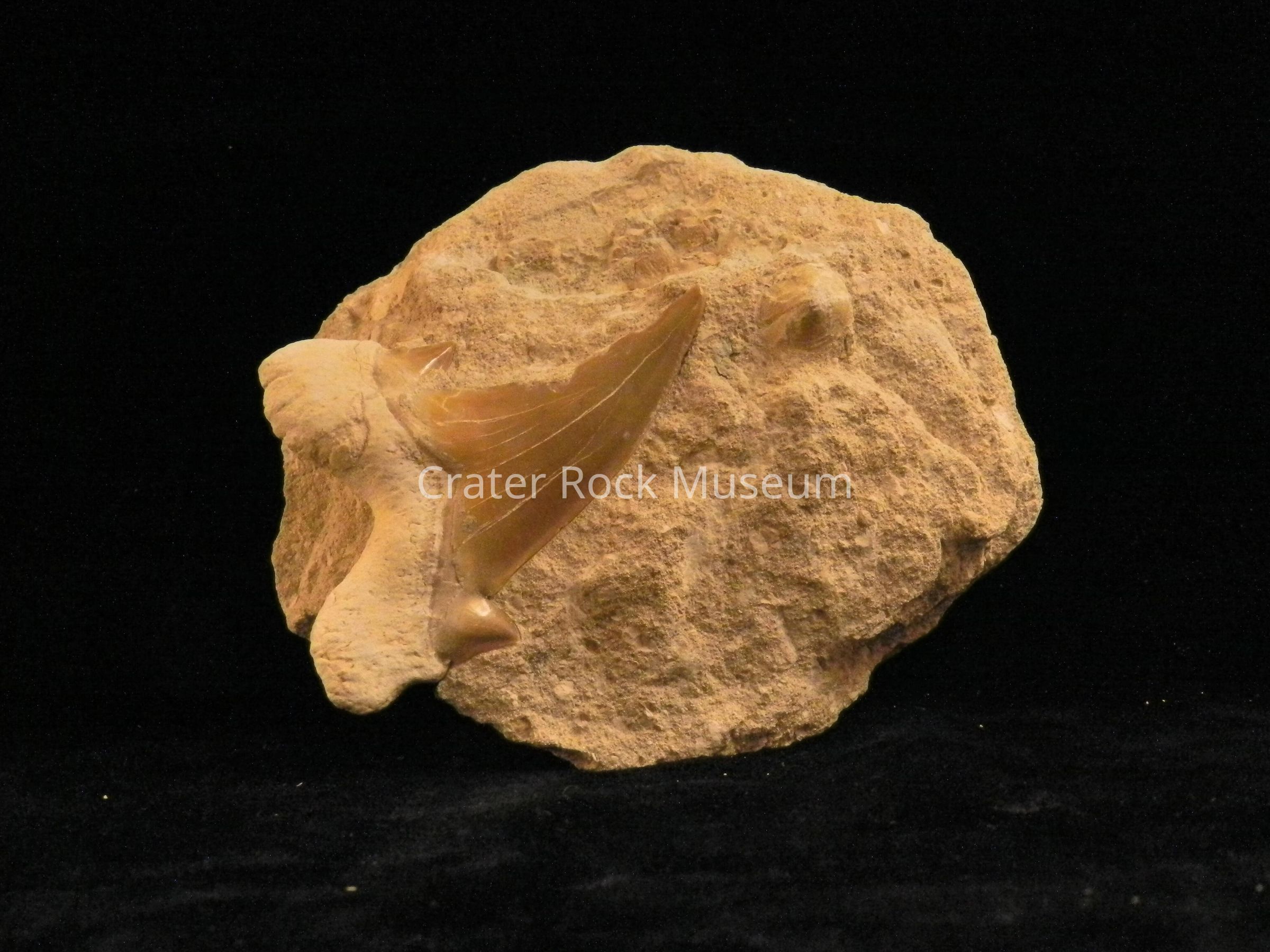 Description: Large rounded sandstone matrix with a single tooth embedded (approx. 2.125") at the base of r0ock. Color is creamy tan to chalky white. Tooth has slight curve to it.