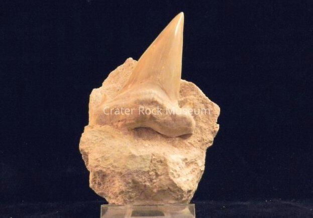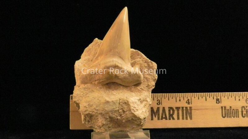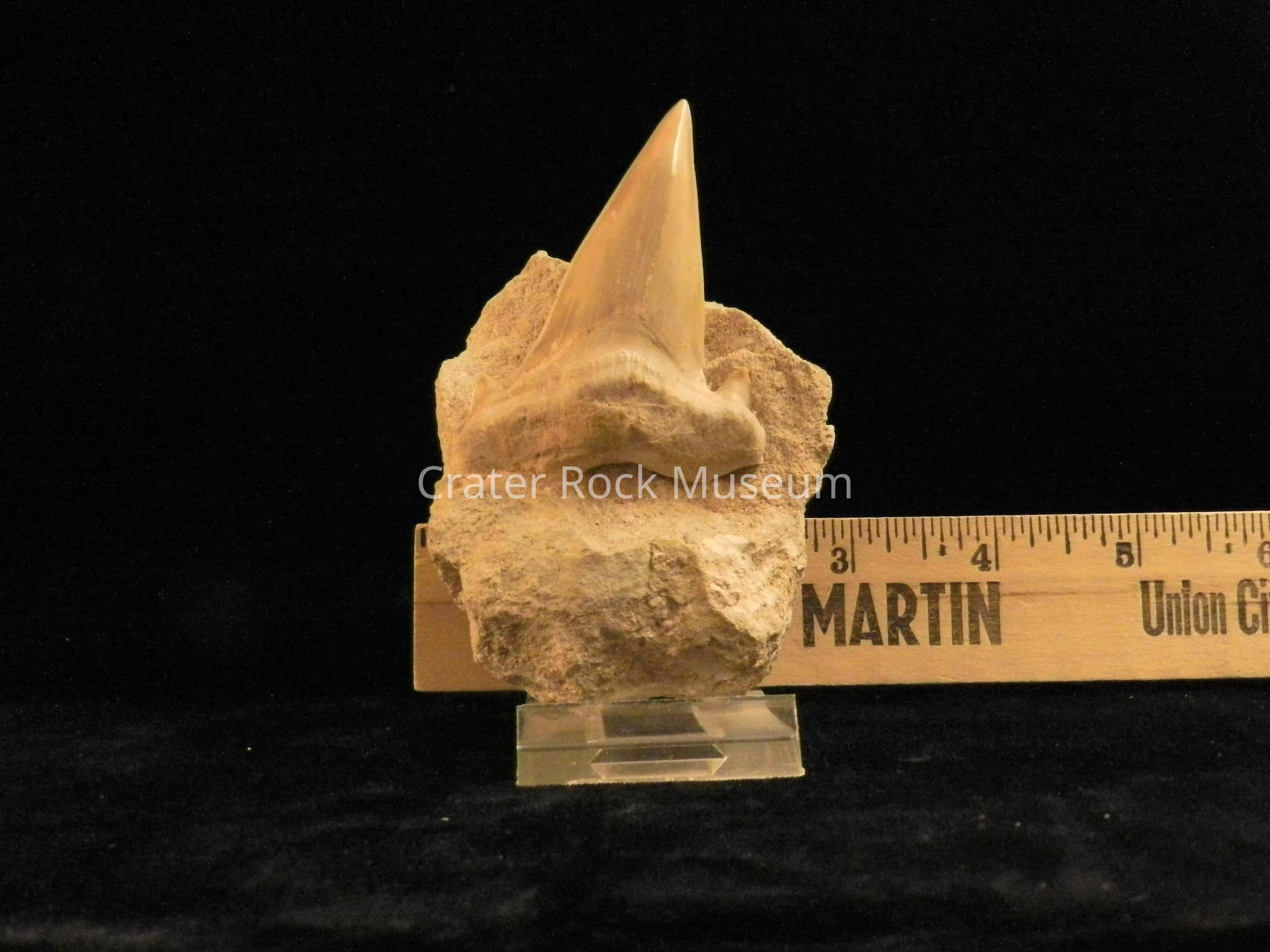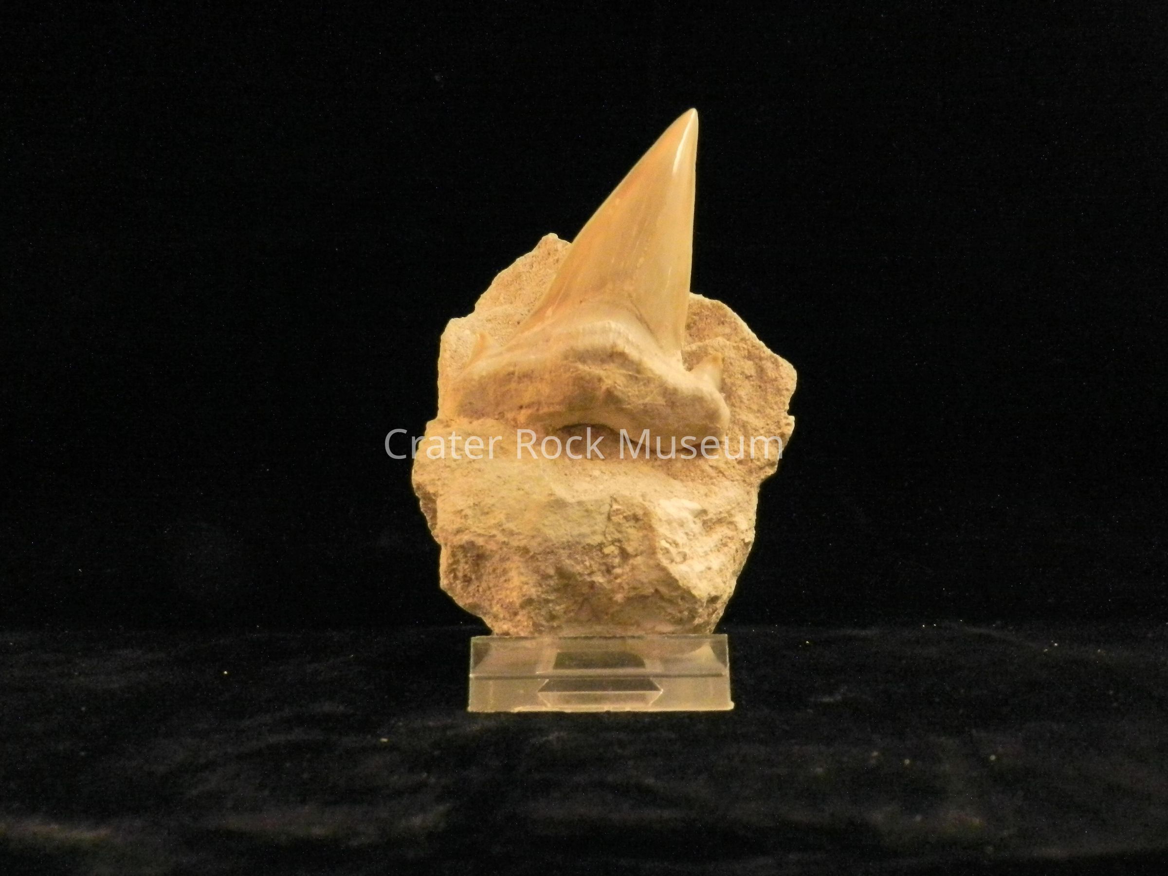 Description: Small sandstone matrix with single tooth embedded within (approx. 2.375" long) Tooth is a creamy beige with a tan base.
