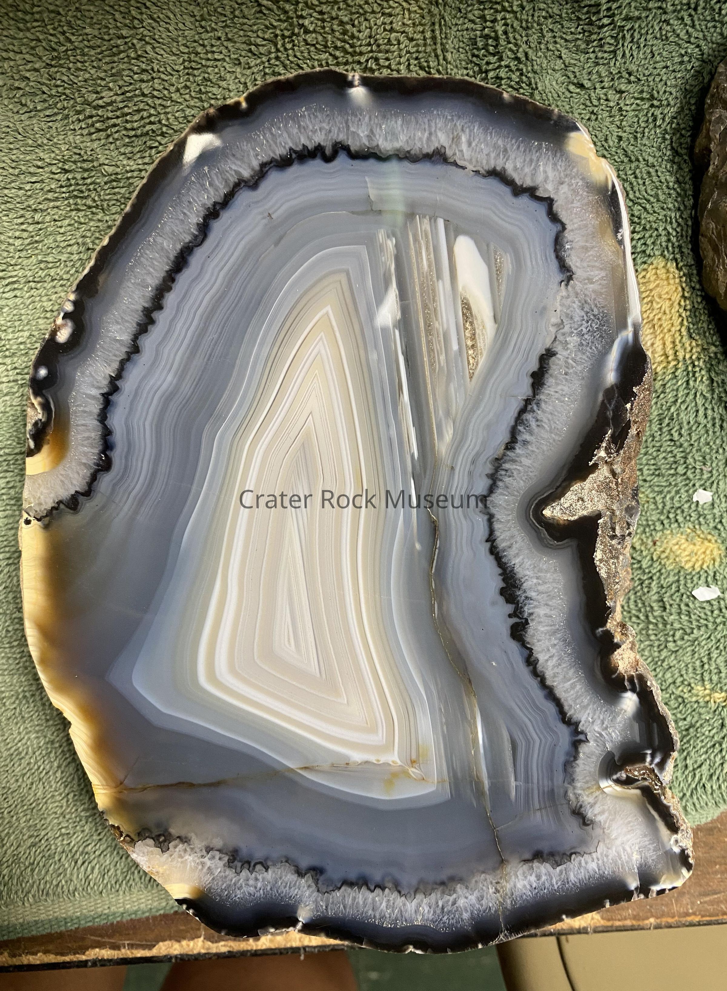 A 1 5/8" (4.2 cm) thick slab of a Brazilian Nodule. Polished side shows fortified Agate in Creams, Beiges and Whites in Central Zone, then Blues and White with Black at outer edge.A Light Blue Crystalline band and Blue and Blacks at outermost edge. Some bedding is seen containing some Crystalline. One side of Nodule is in Bright Creams and Crystalline band is absent here. Piece is unusual because Crystallization is at edge, not in center. Crack runs through the center.Dimensions