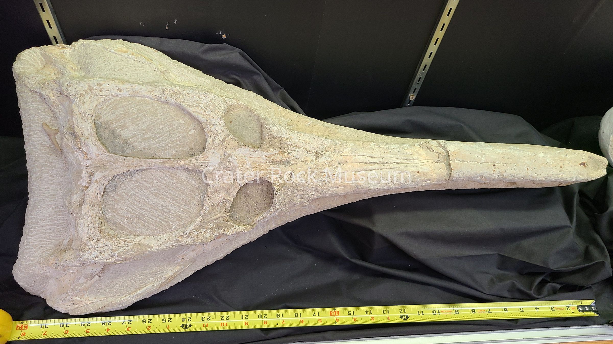 A complete, well preserved crocodylomorph skull and rostrum in matrix.