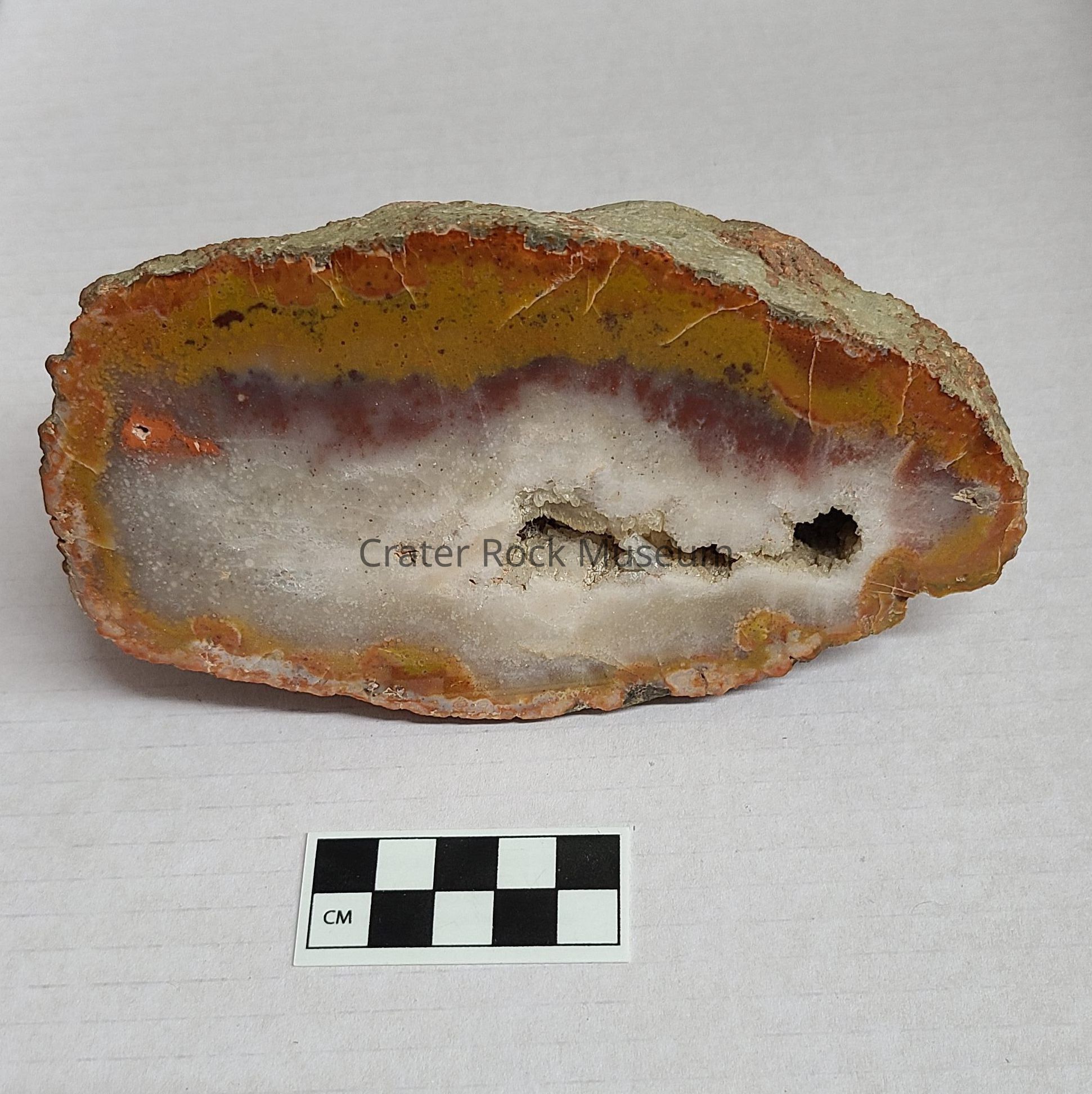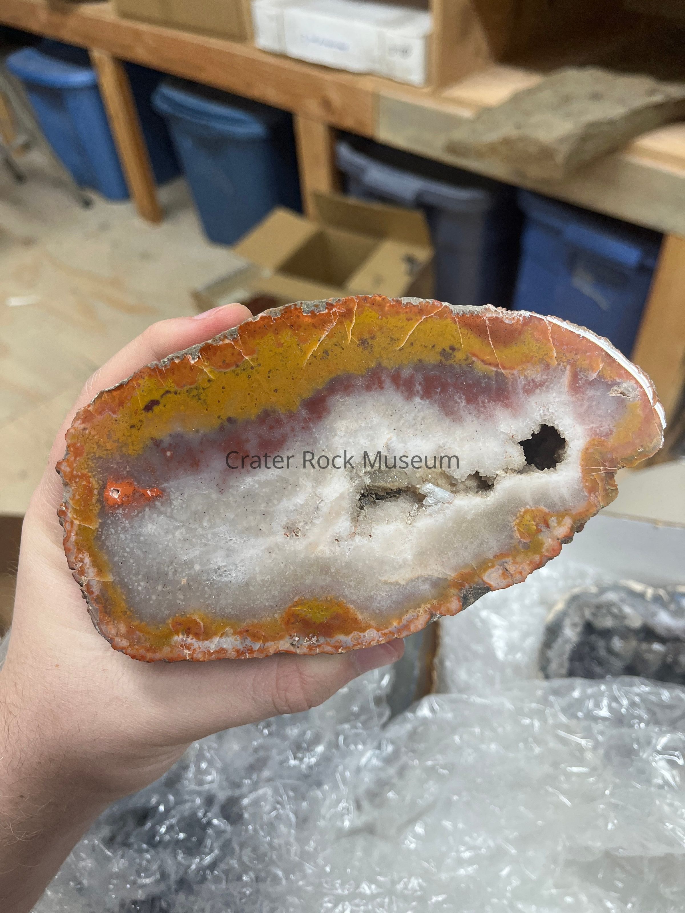 An Agate Nodule from UT. Polished side shows open Crystalline center in White and Grey surrounded by Red on one side and then Mustard and Orange. Small open Orange Dot to one side.Dimensions