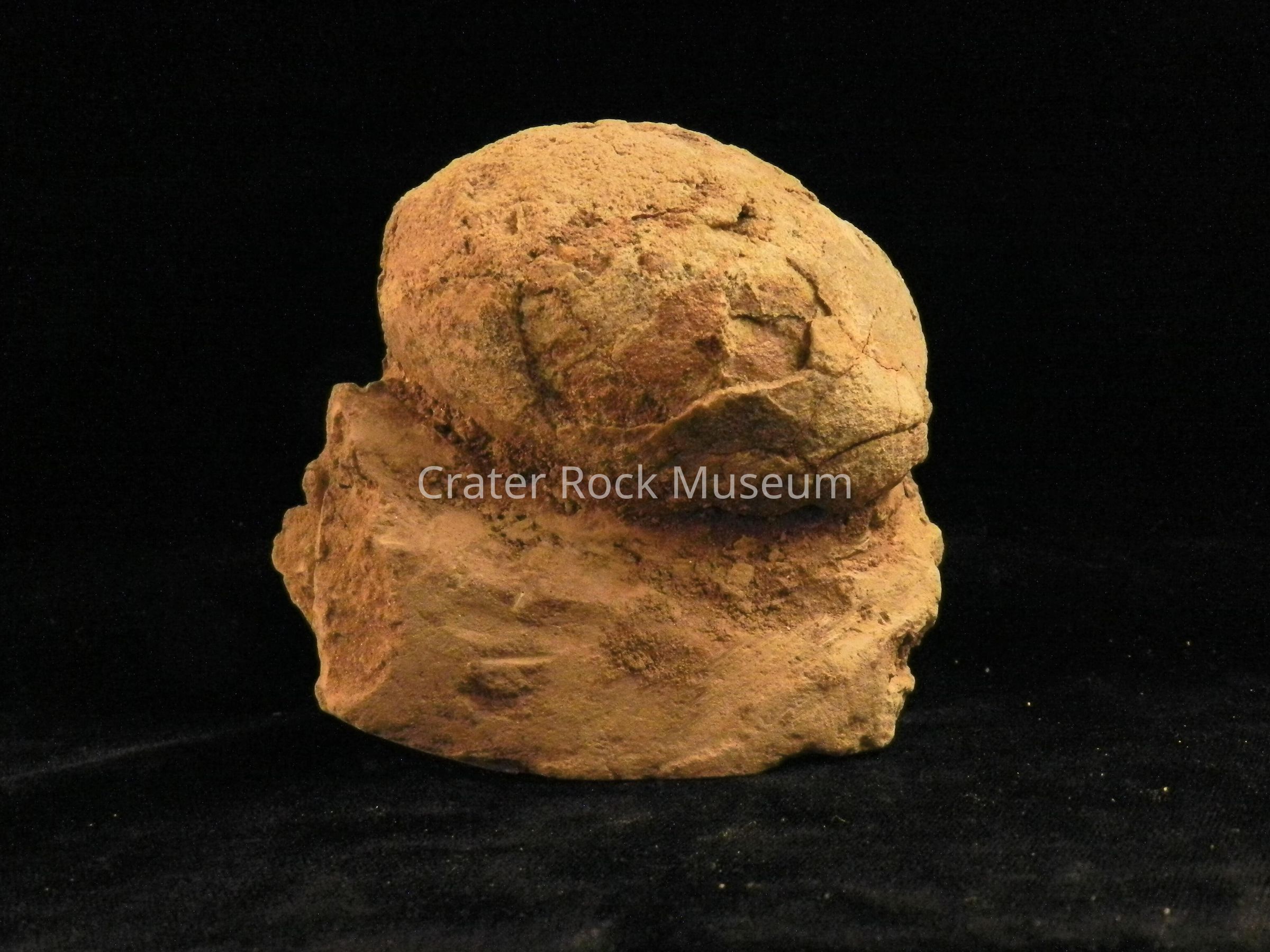 Description: Rough and highly fractured, egg shaped (fragmented) on top of a fairly large sandstone block (pedestal),. Color is a dirty pink to a darker reddish-brown (granular) matrix.