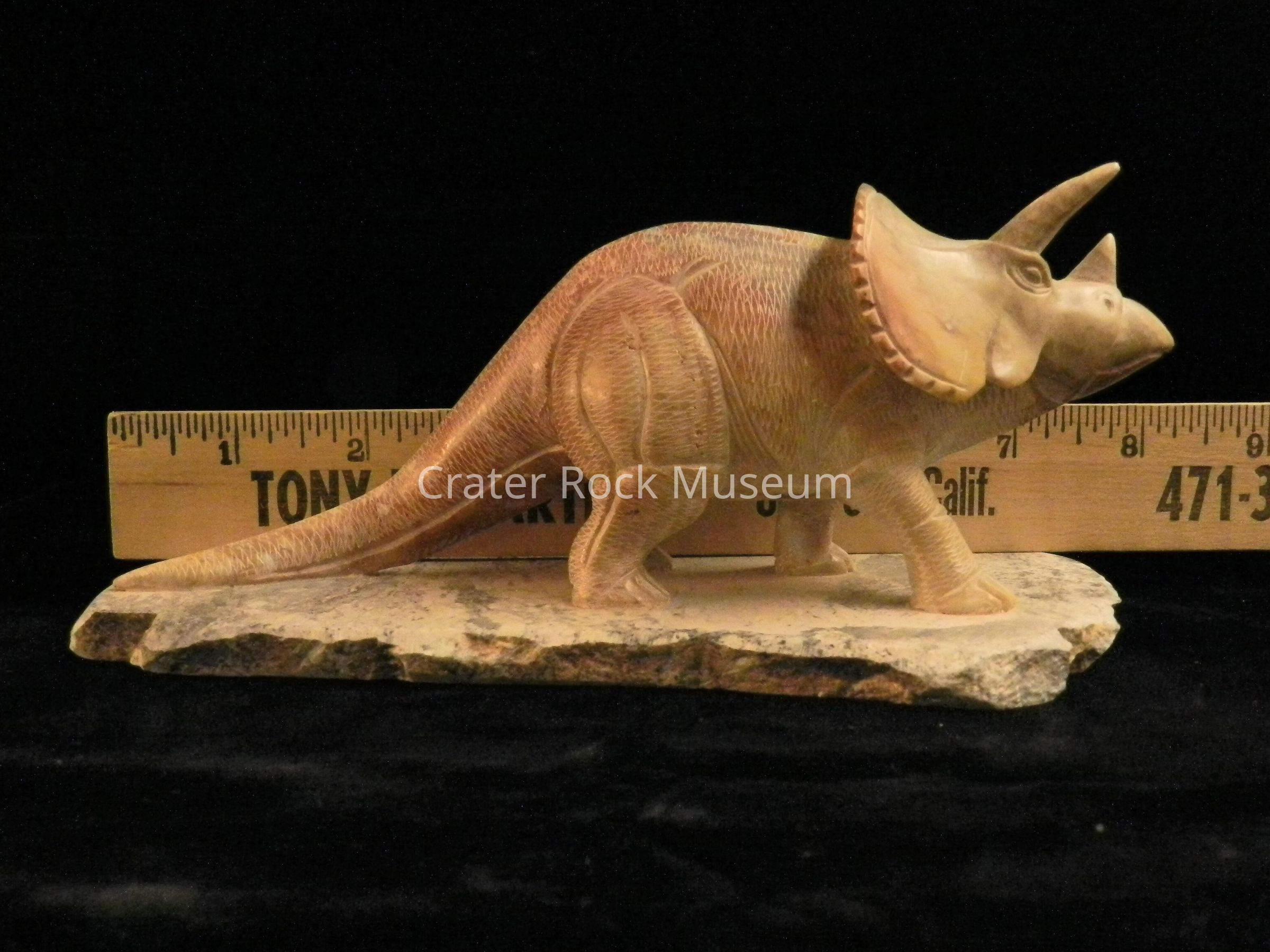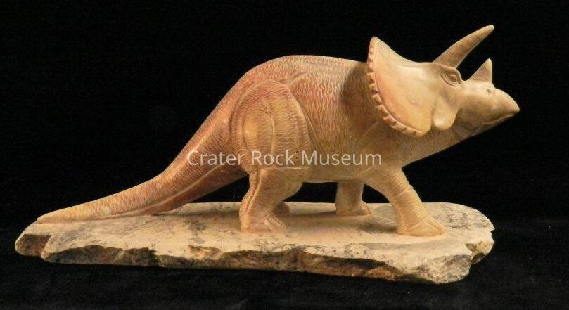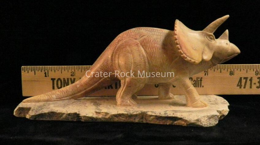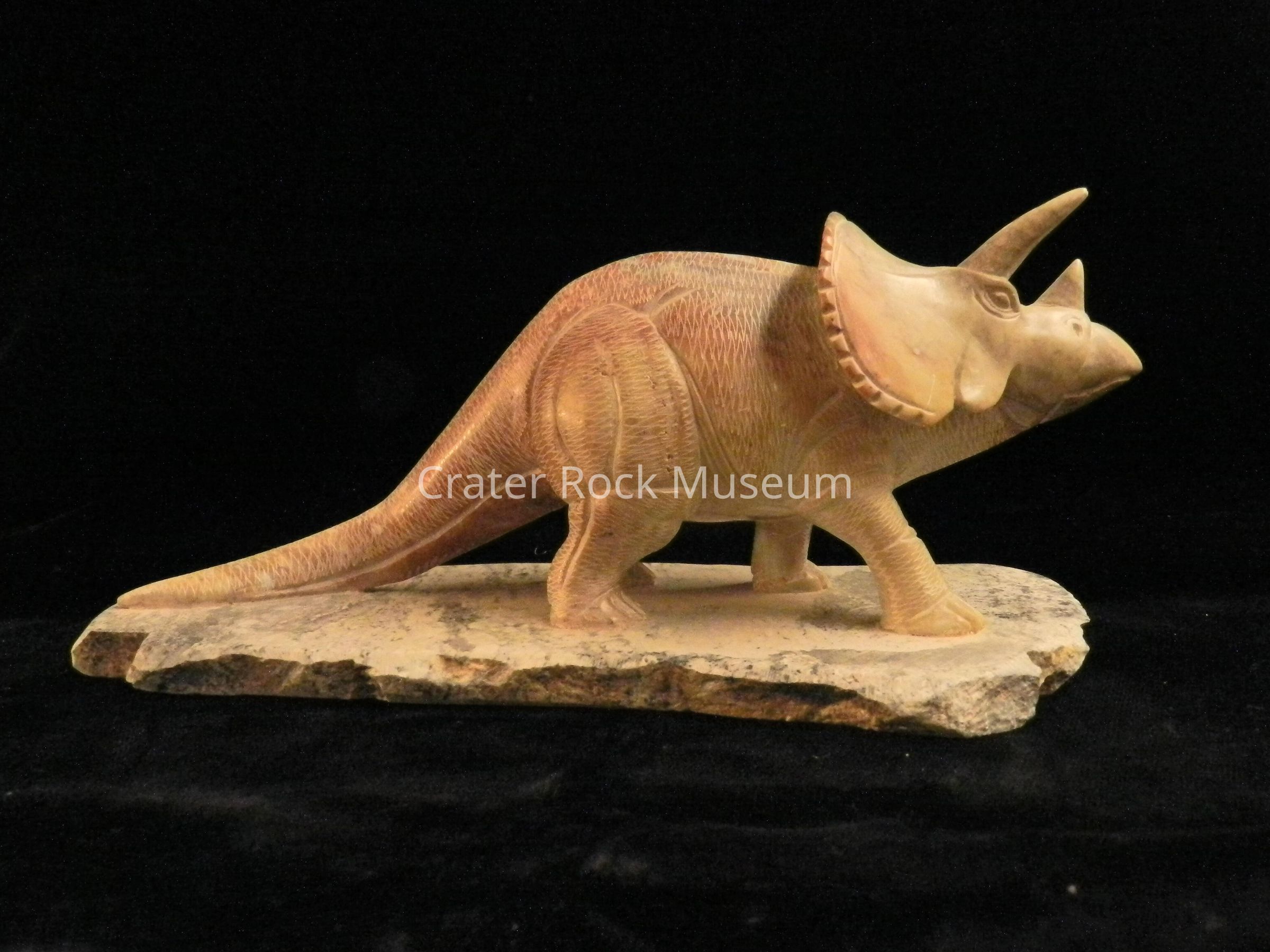 Description: (2) piece carving of a Triceratops. Figure is standing on a flat pedestal. Highly detailed. Color is light brown to tan highlights.