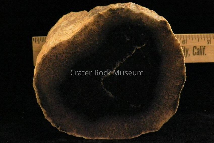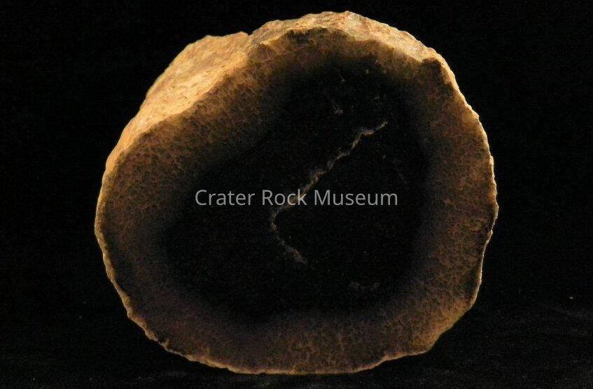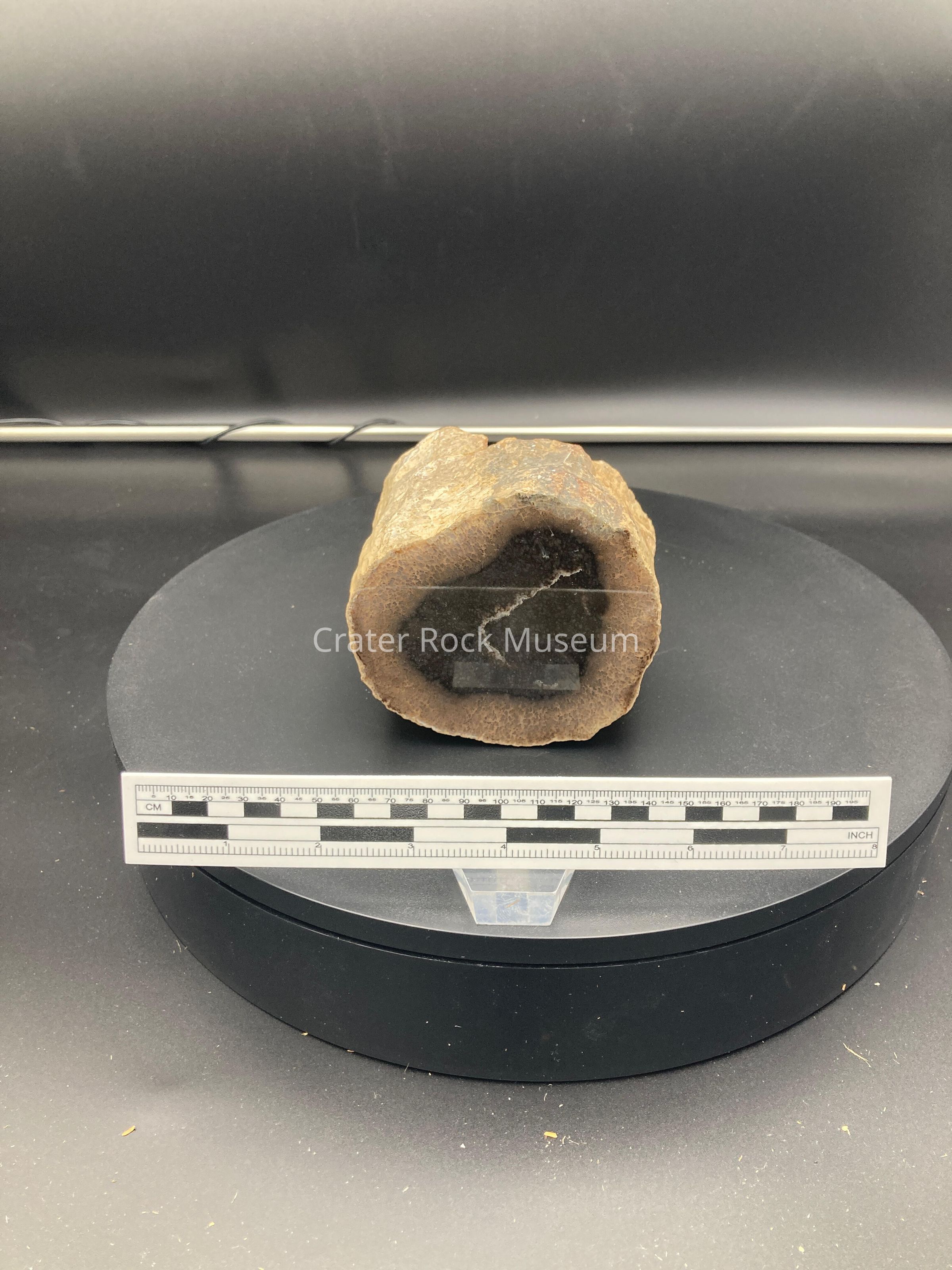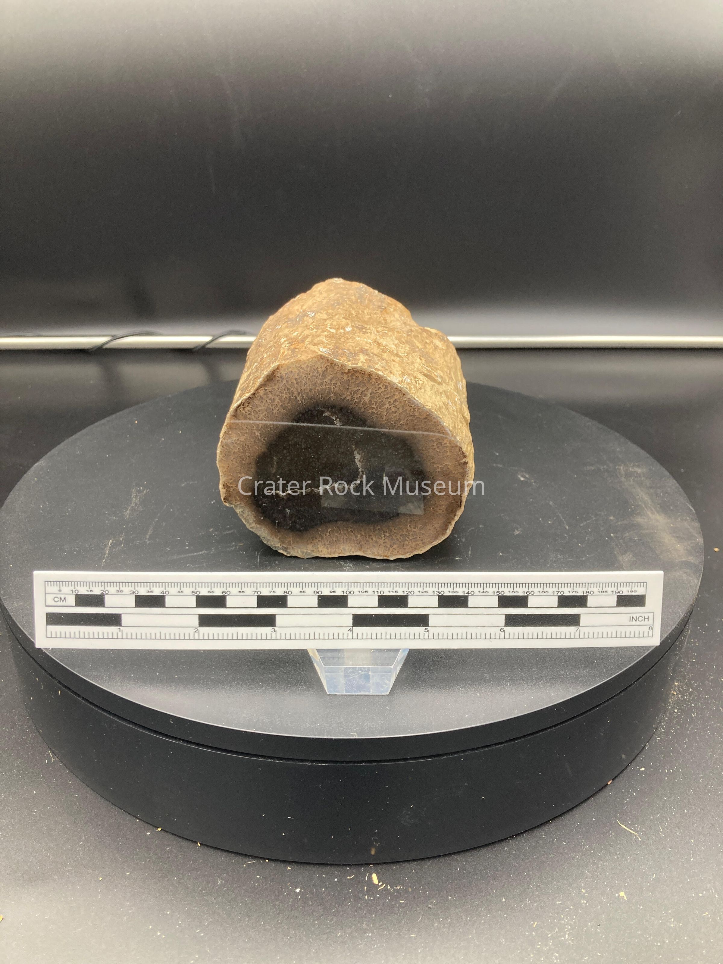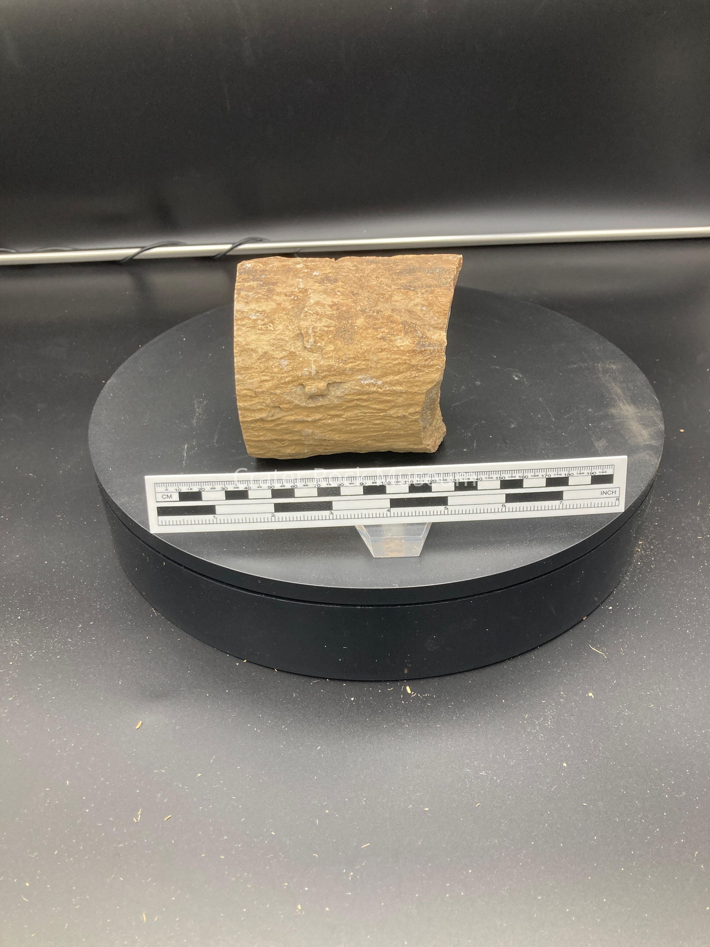 Description: Section of a long bone, polished flat on one end. Face shows outer area to be a tan to brown porus structure, while the inner area is a porus black. Outer "stem" area is light to dark tan with rough surface.