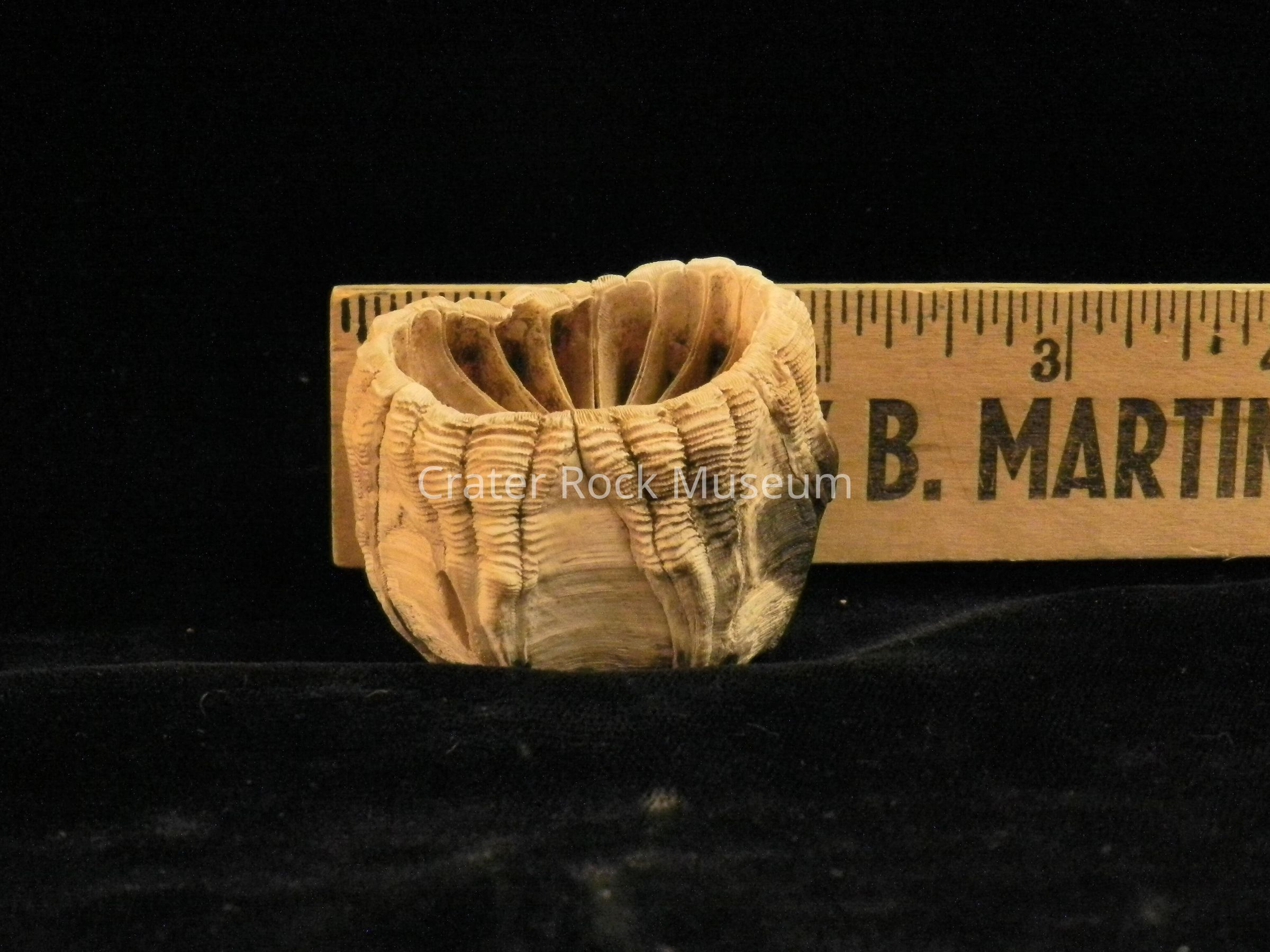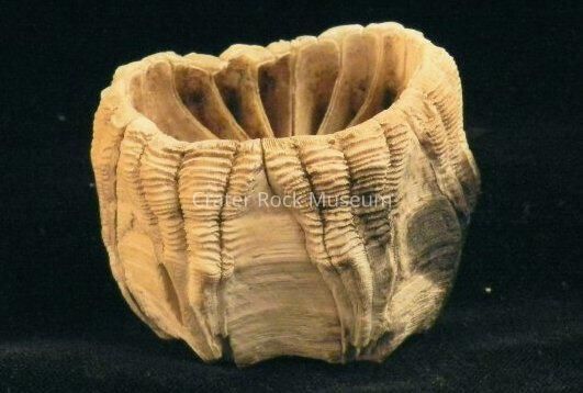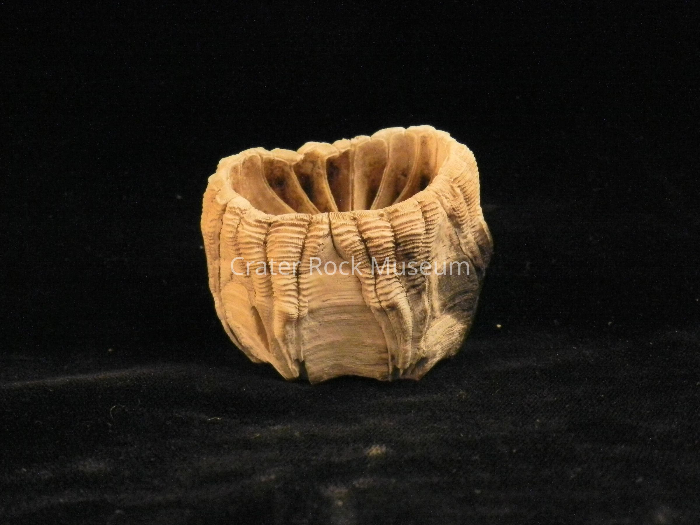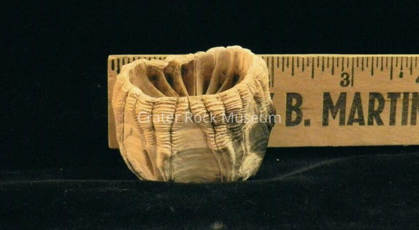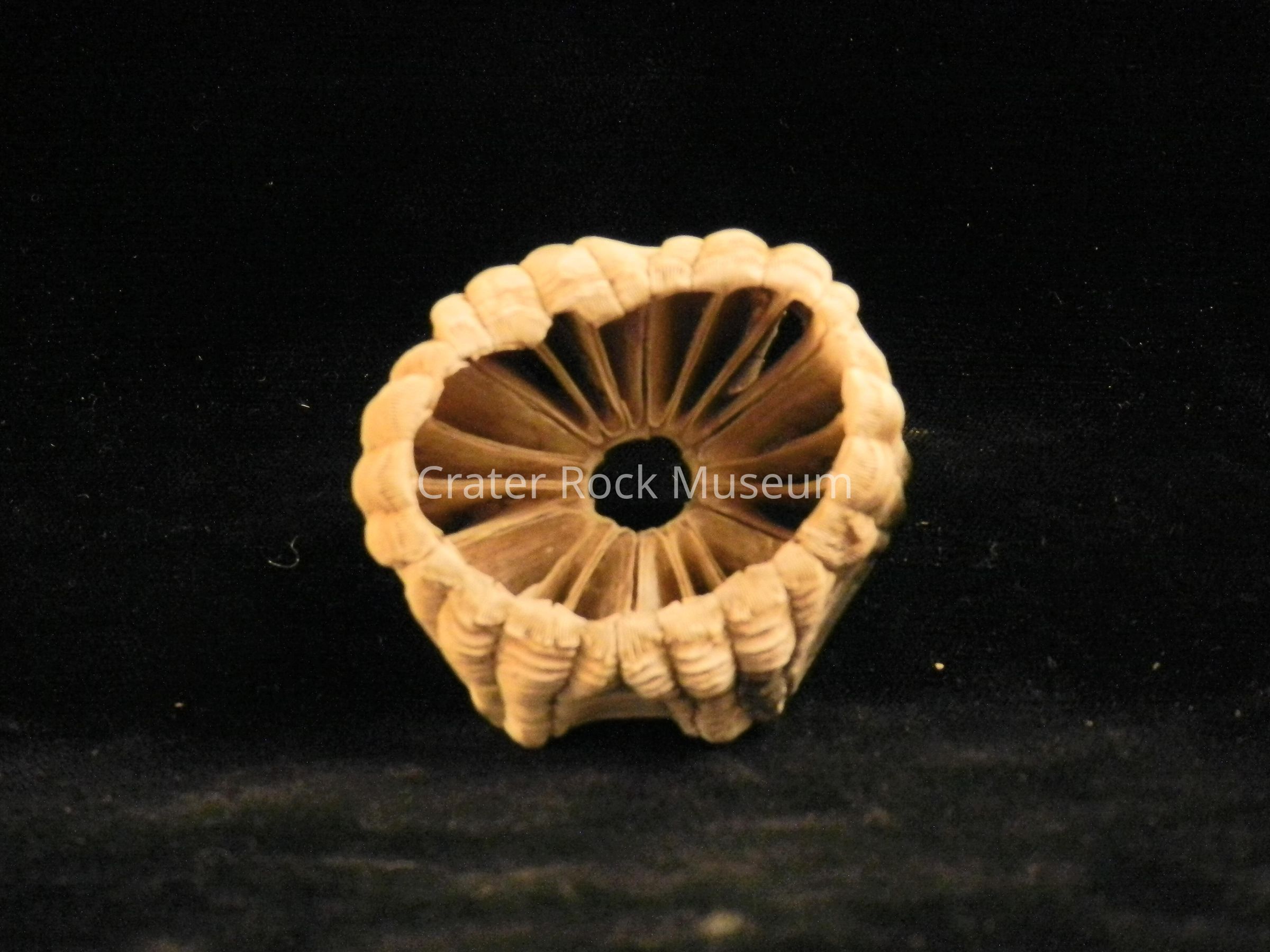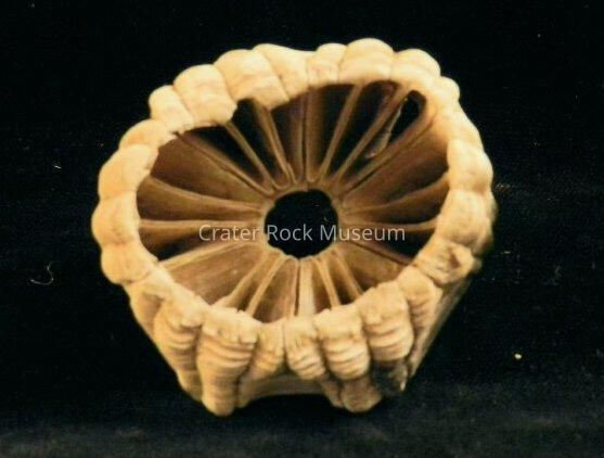 Description: A single large fossil Sea Bud. Hollow cavities on each end with draping crinoid shaped structures going from top to bottom in threes. Colors is beige to light tan.