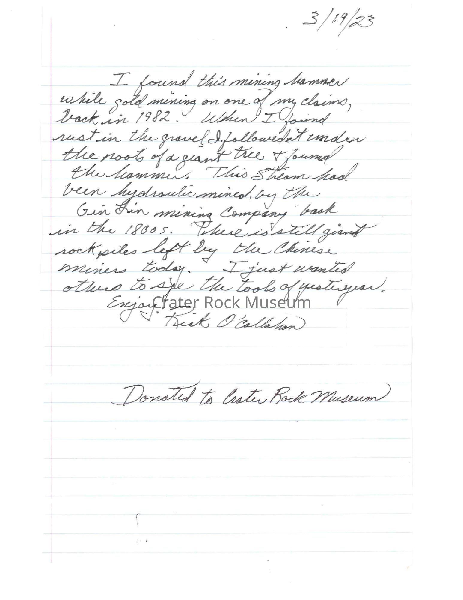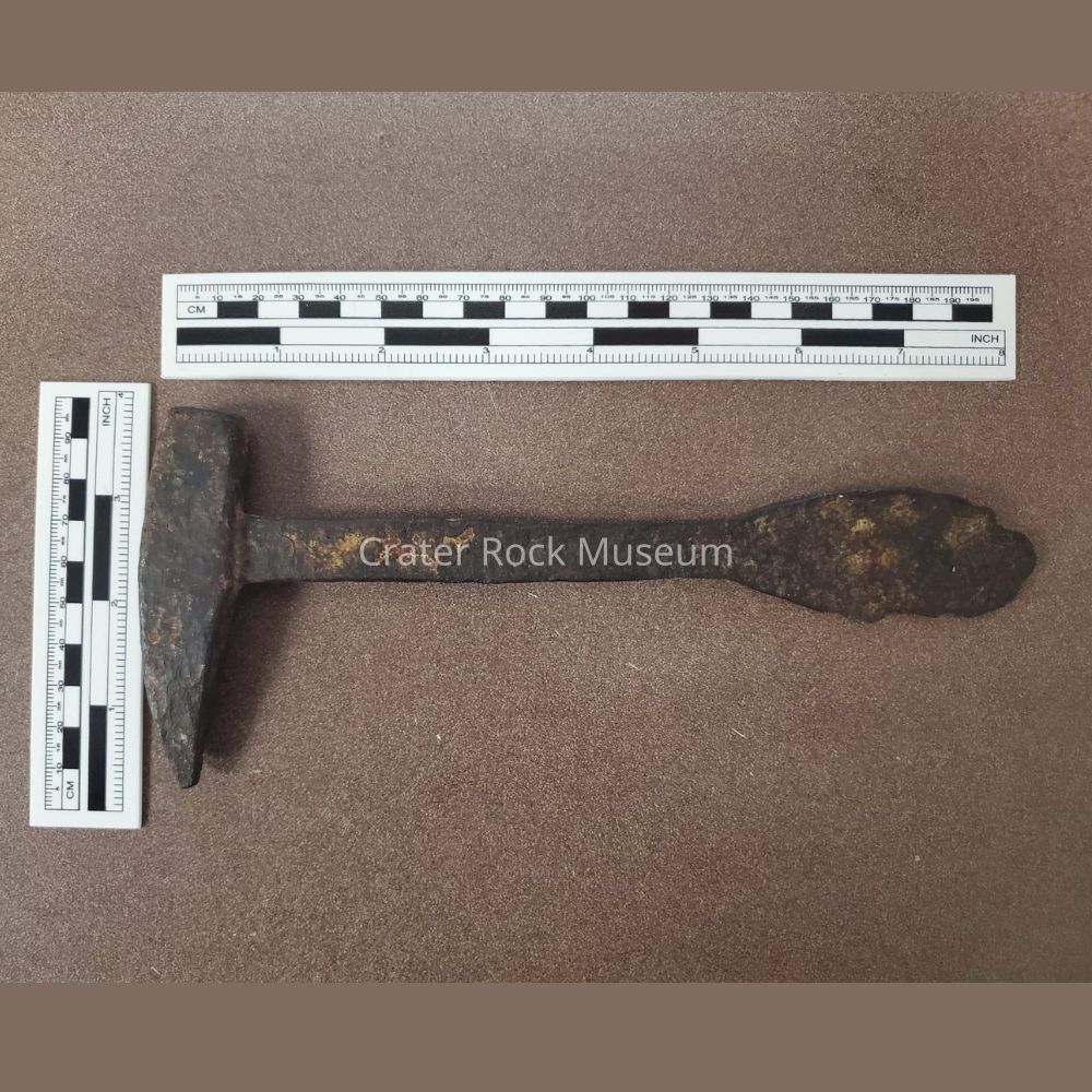 Antique rock pick hammer possibly from the Gin Lin Mining Company of the 1800s. Found on a claim in the area they worked in. There was a rust trail that led up to it. Its handle is 8.5" long and the pick head is 3.75" long. Donated by Rick O'Callahan. See attached photo of original document that came with the item.Collection