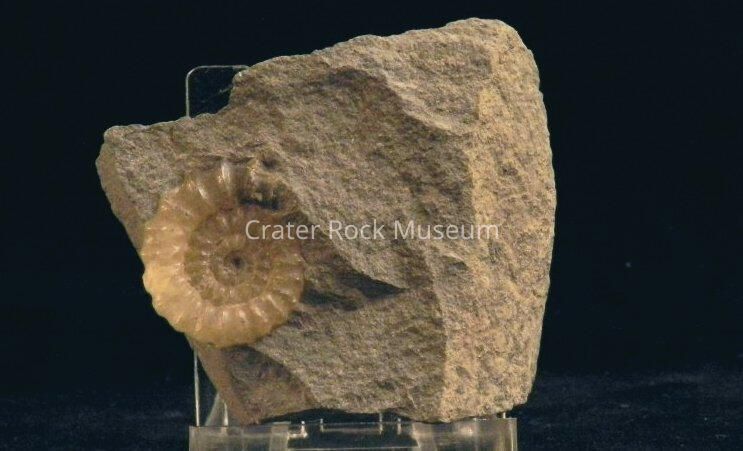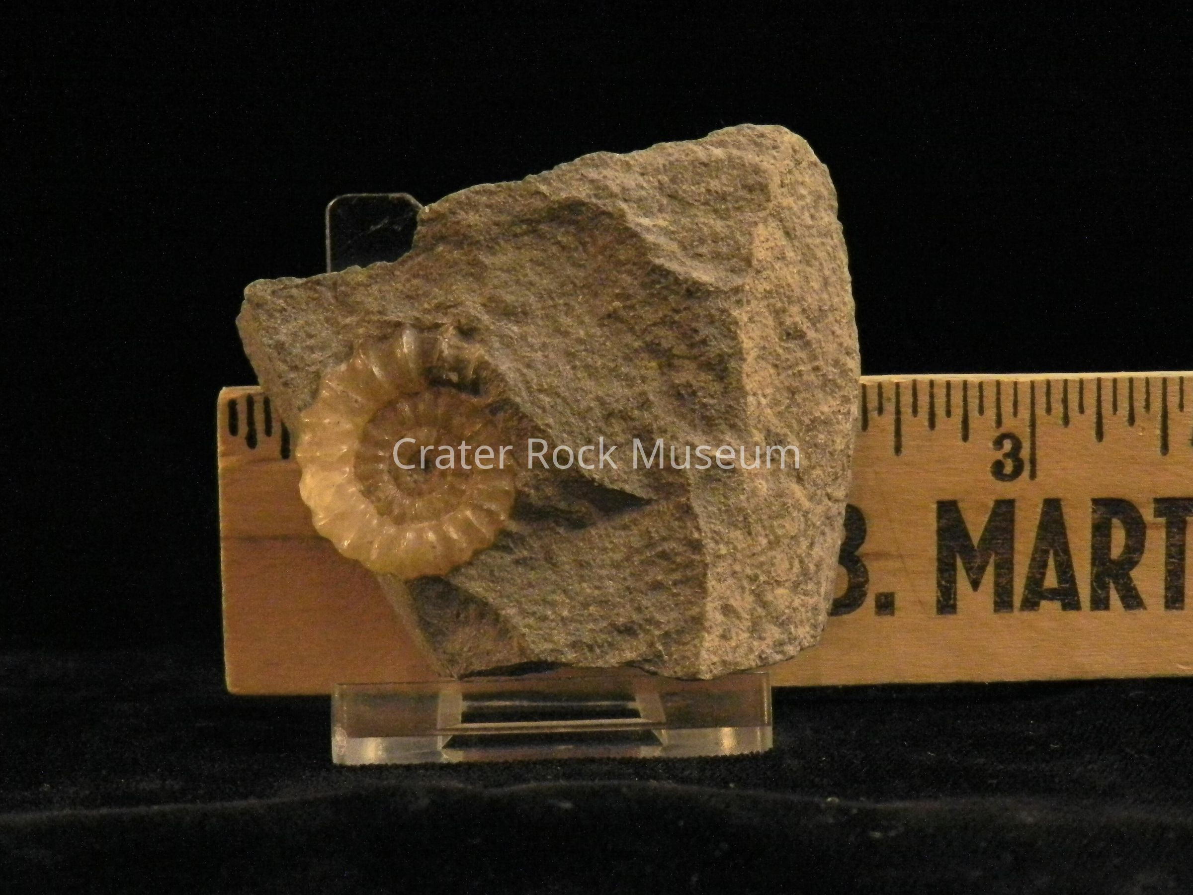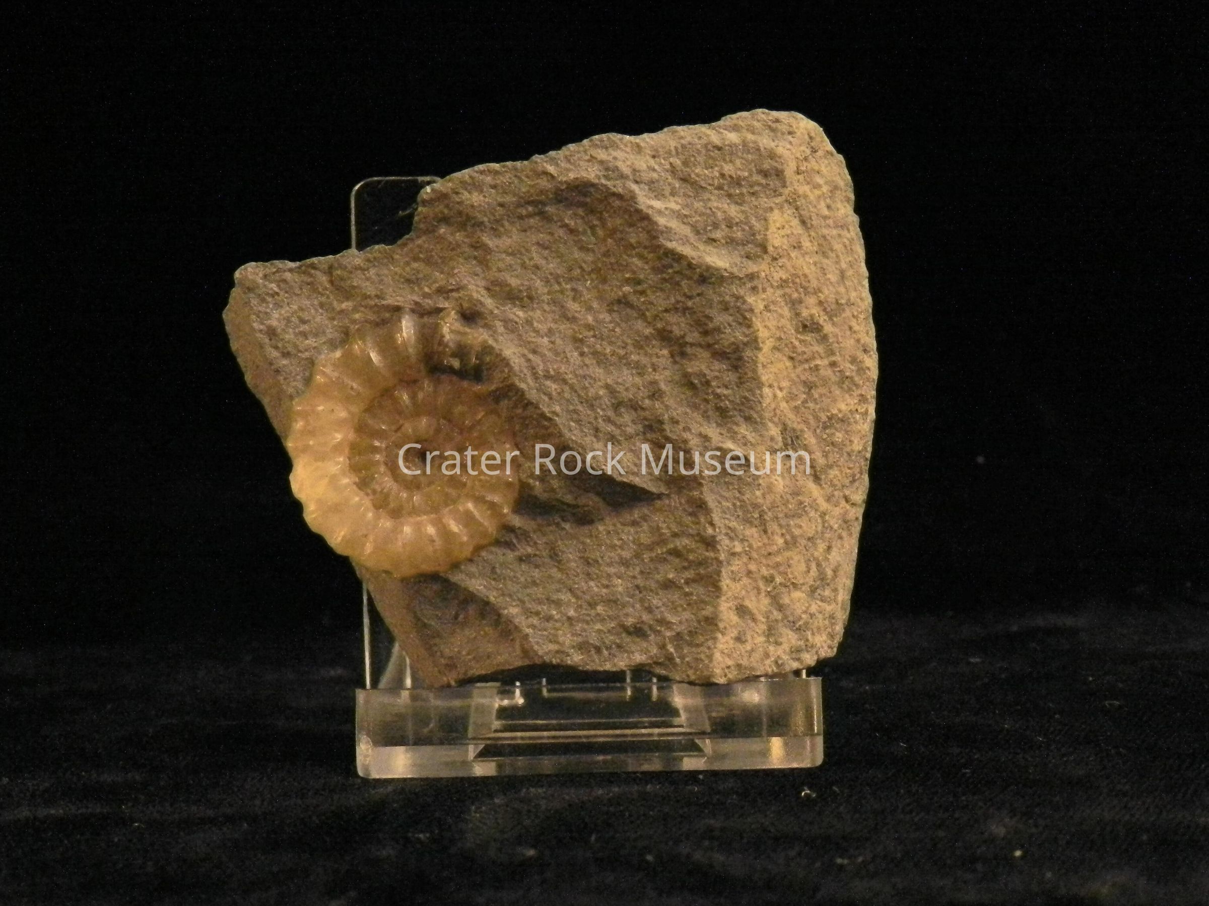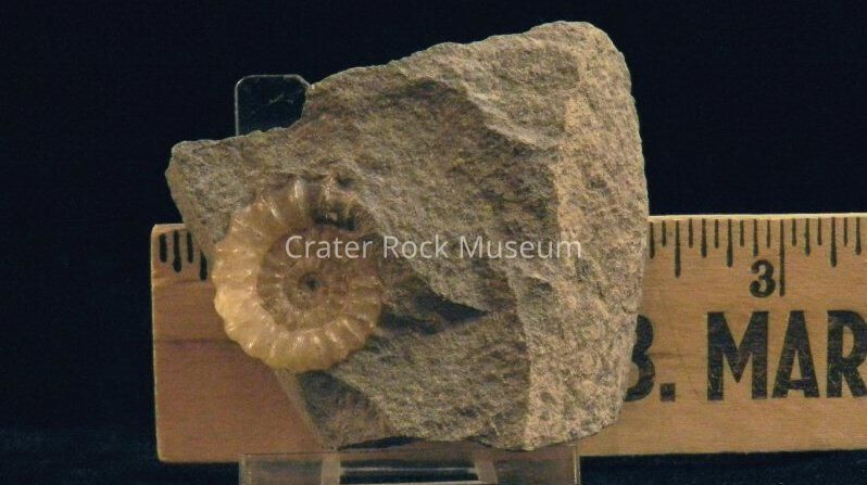 Description: Semi-flat, angular with a small translucent coiled ammonite. Dull yellow in color. Matrix dark gray and fine grained.