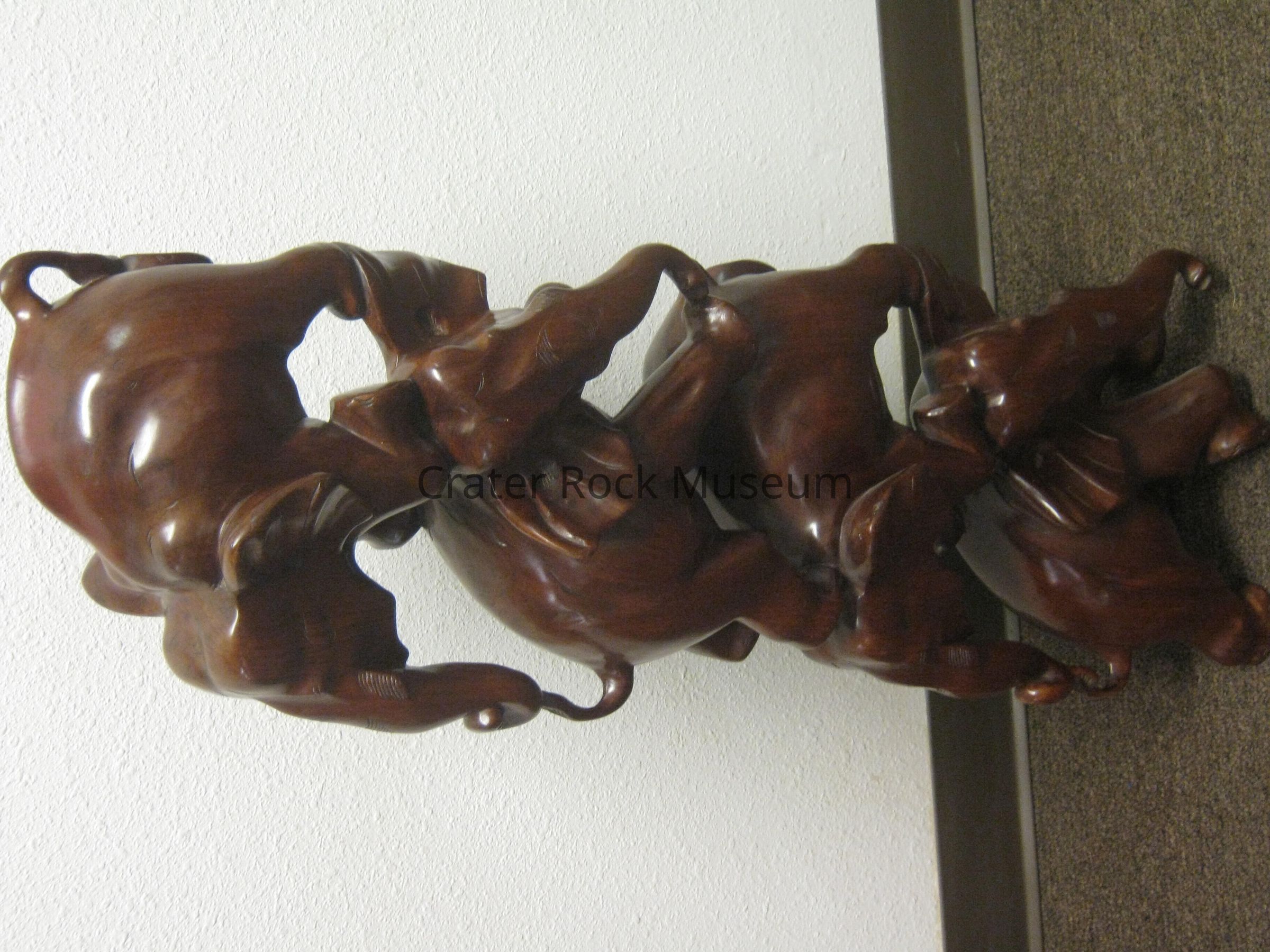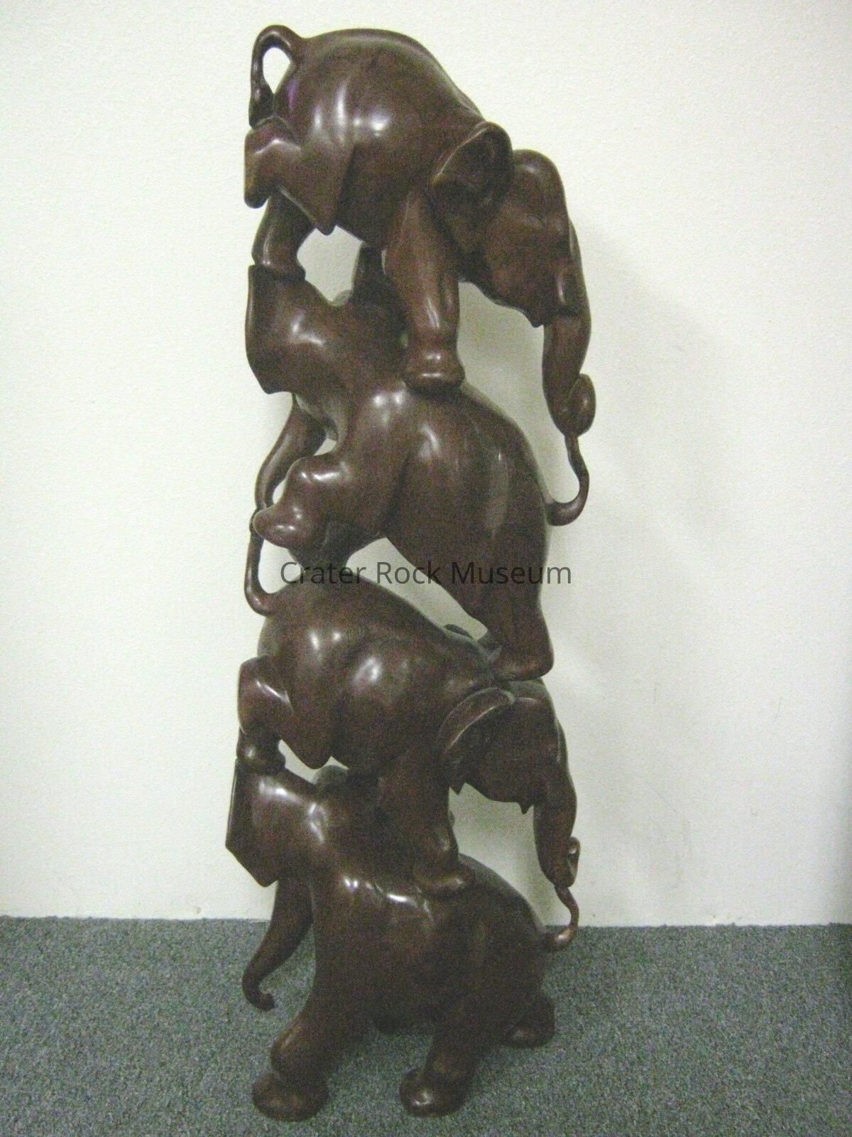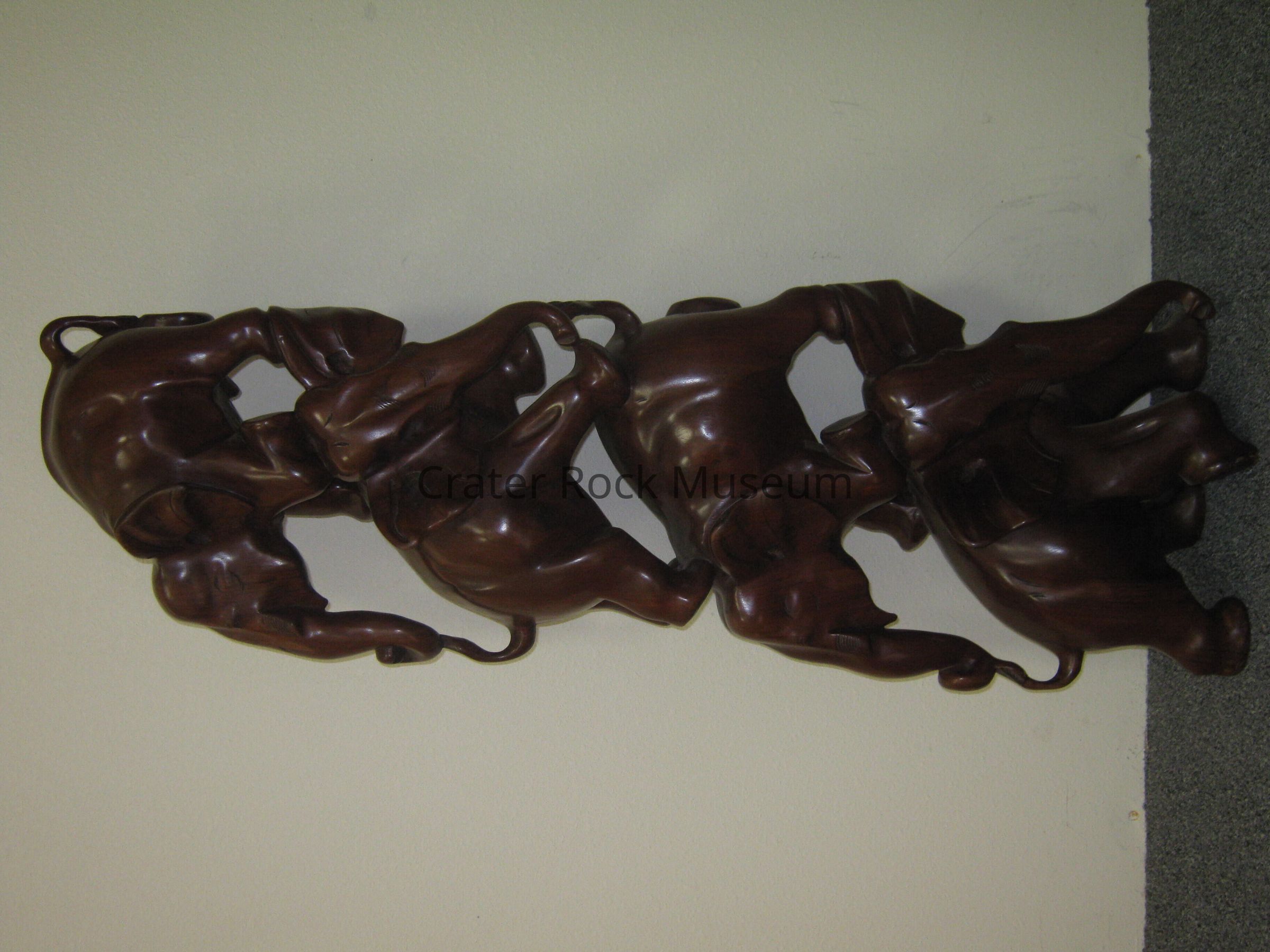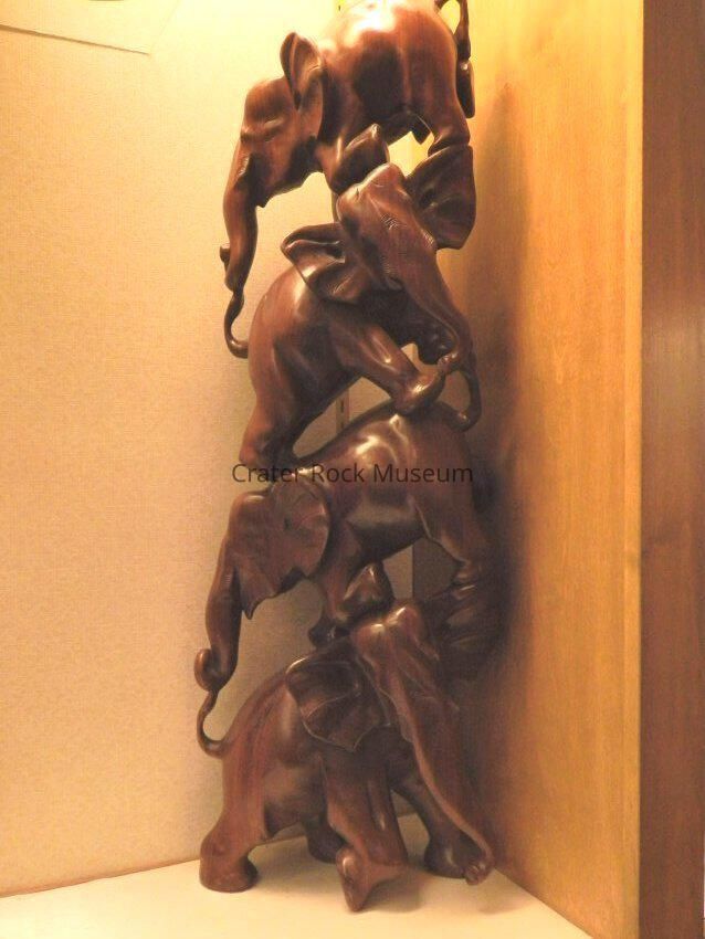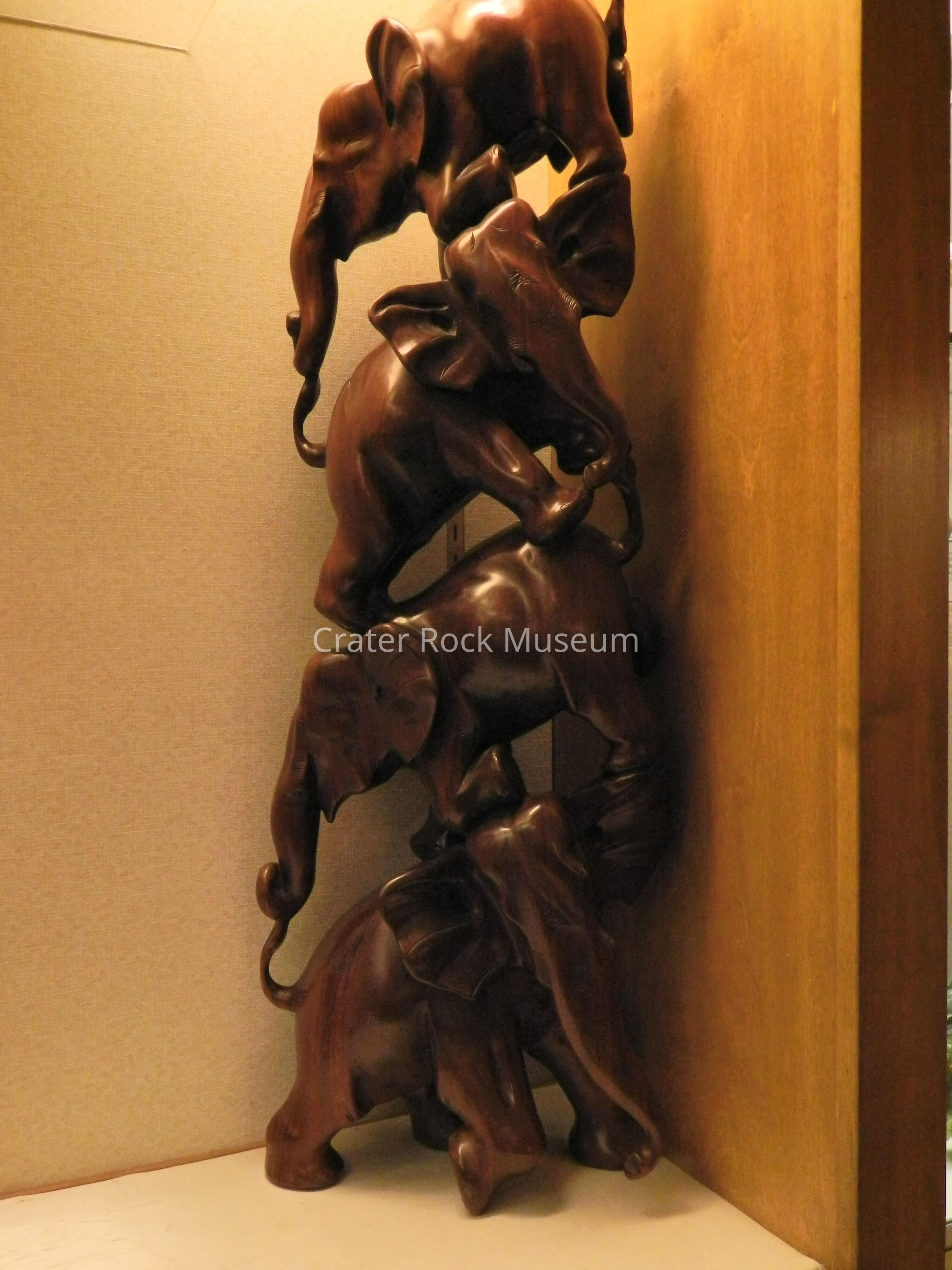 Chinese wood carving of four elephants balancing on top of each other. Deep reddish-brown mahogany wood.Collection