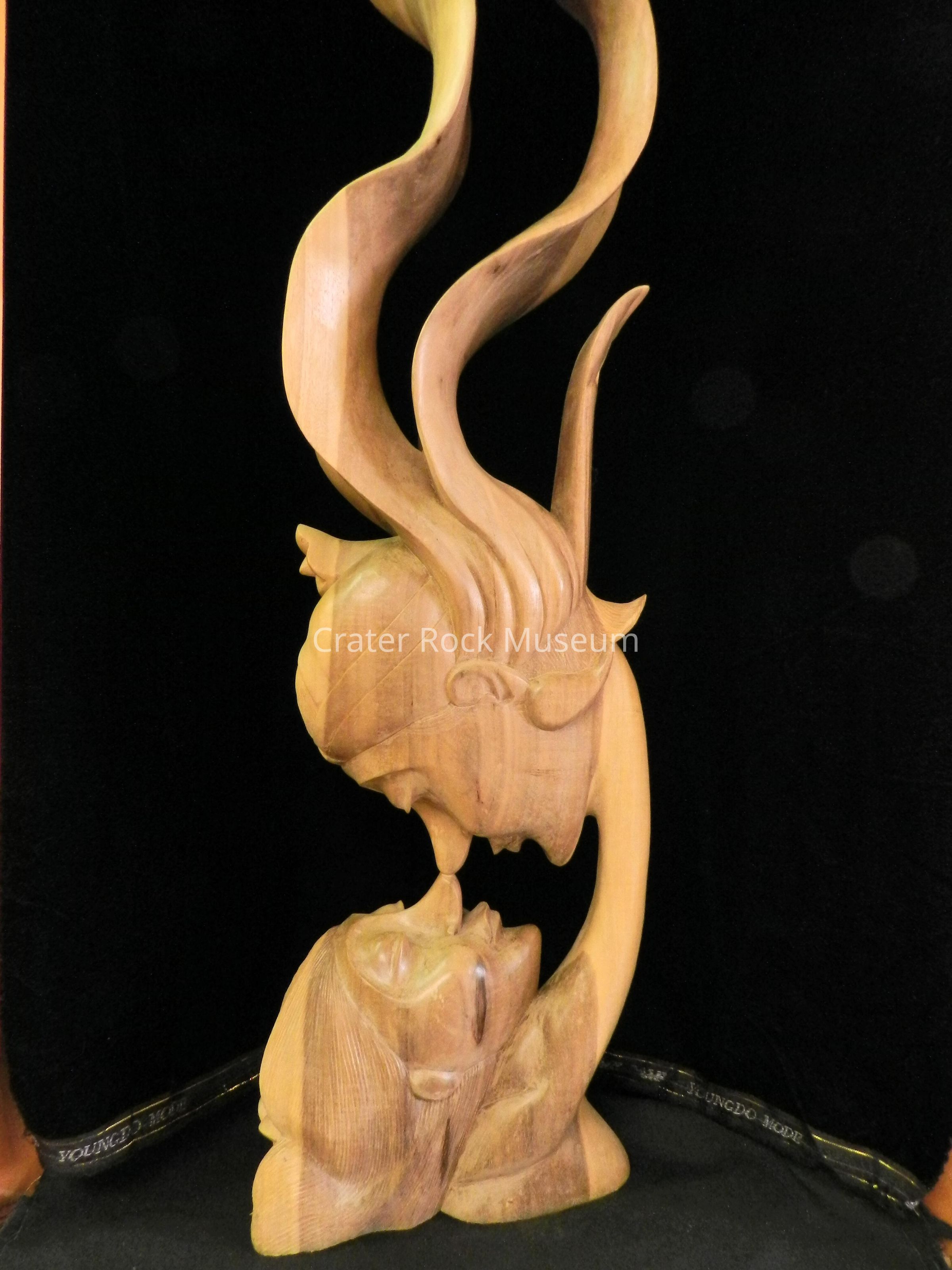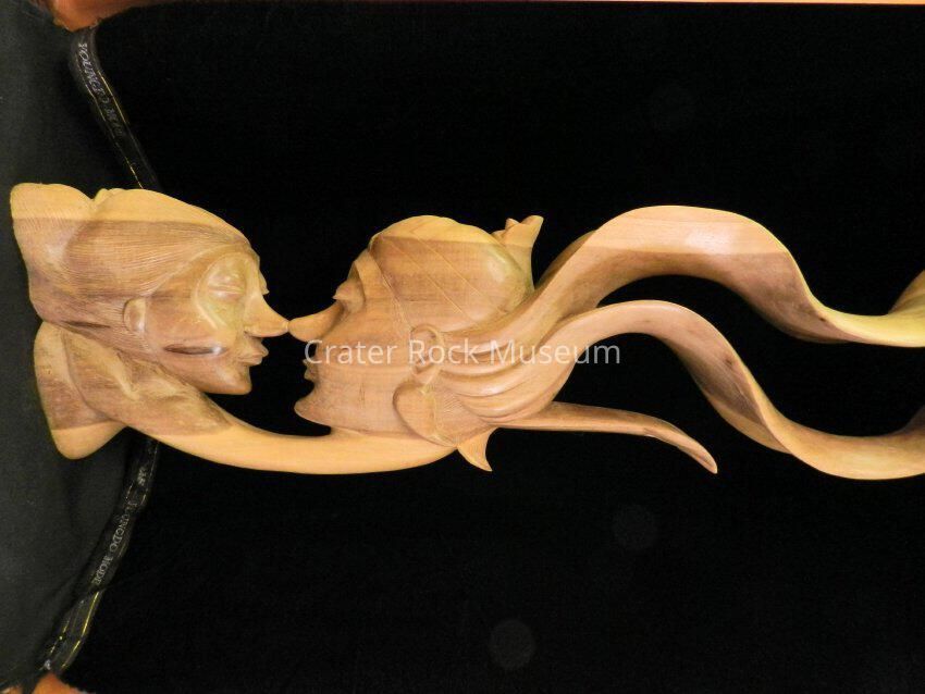 Sculpture from Bali, Indonesia of two faces with noses touching ("Kissing Faces") carved from Rain Tree aka suwar.Collection