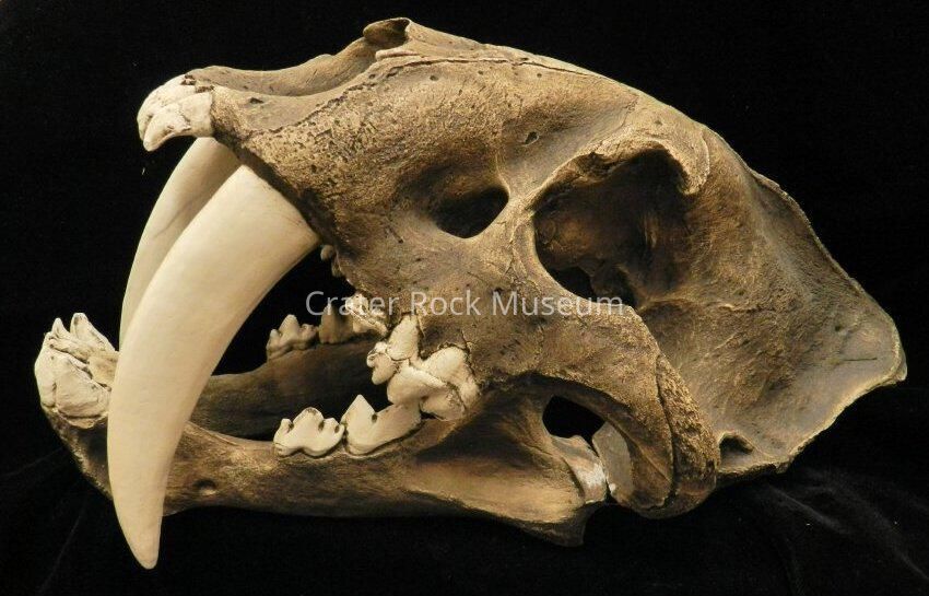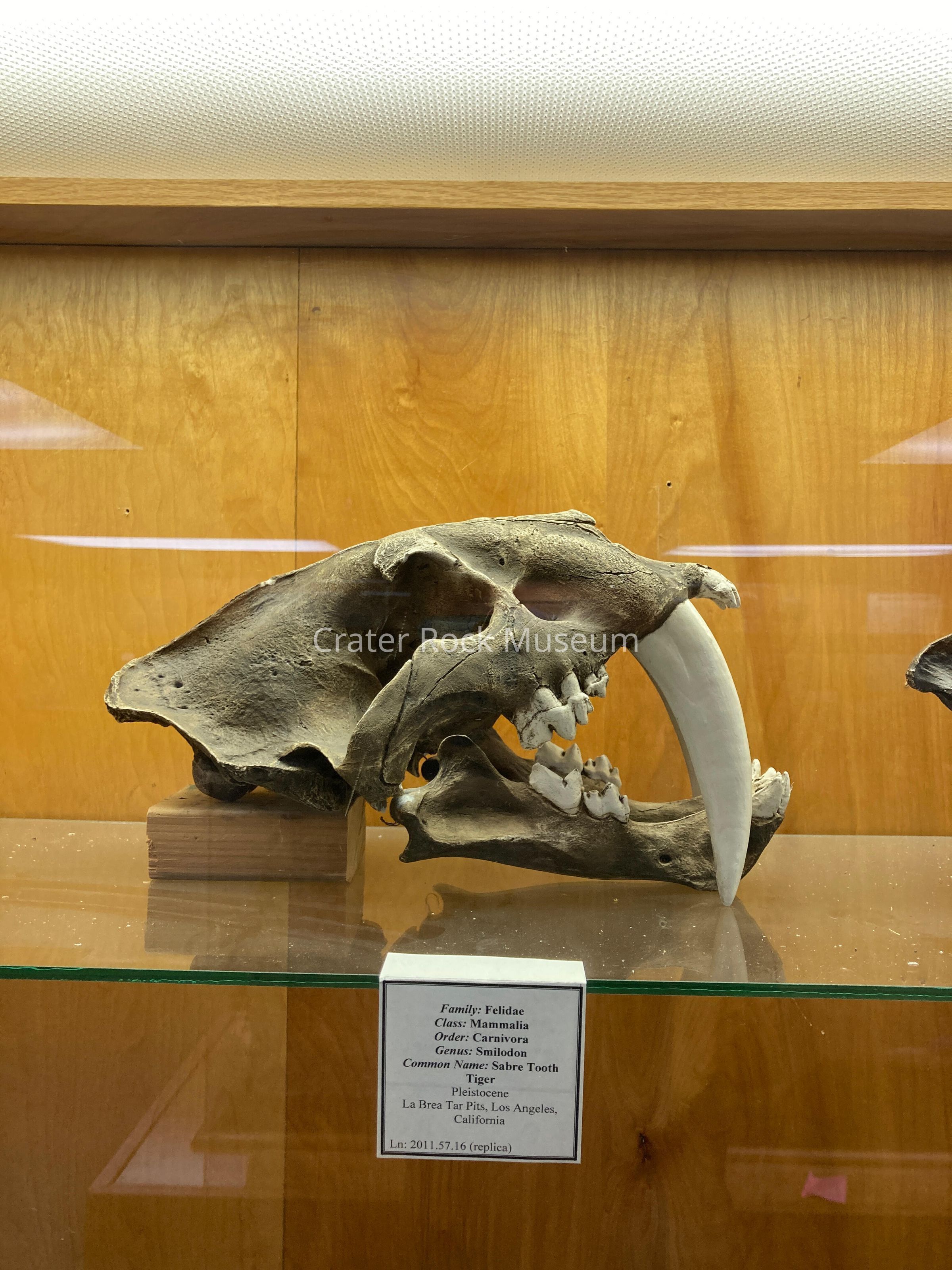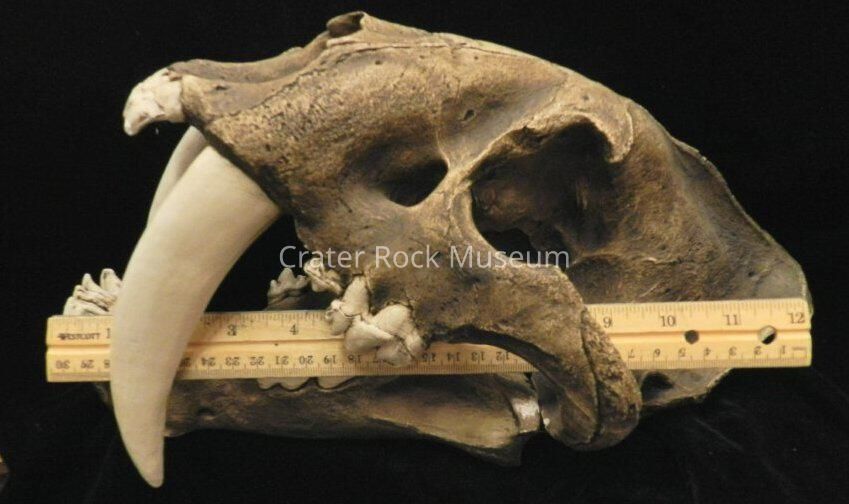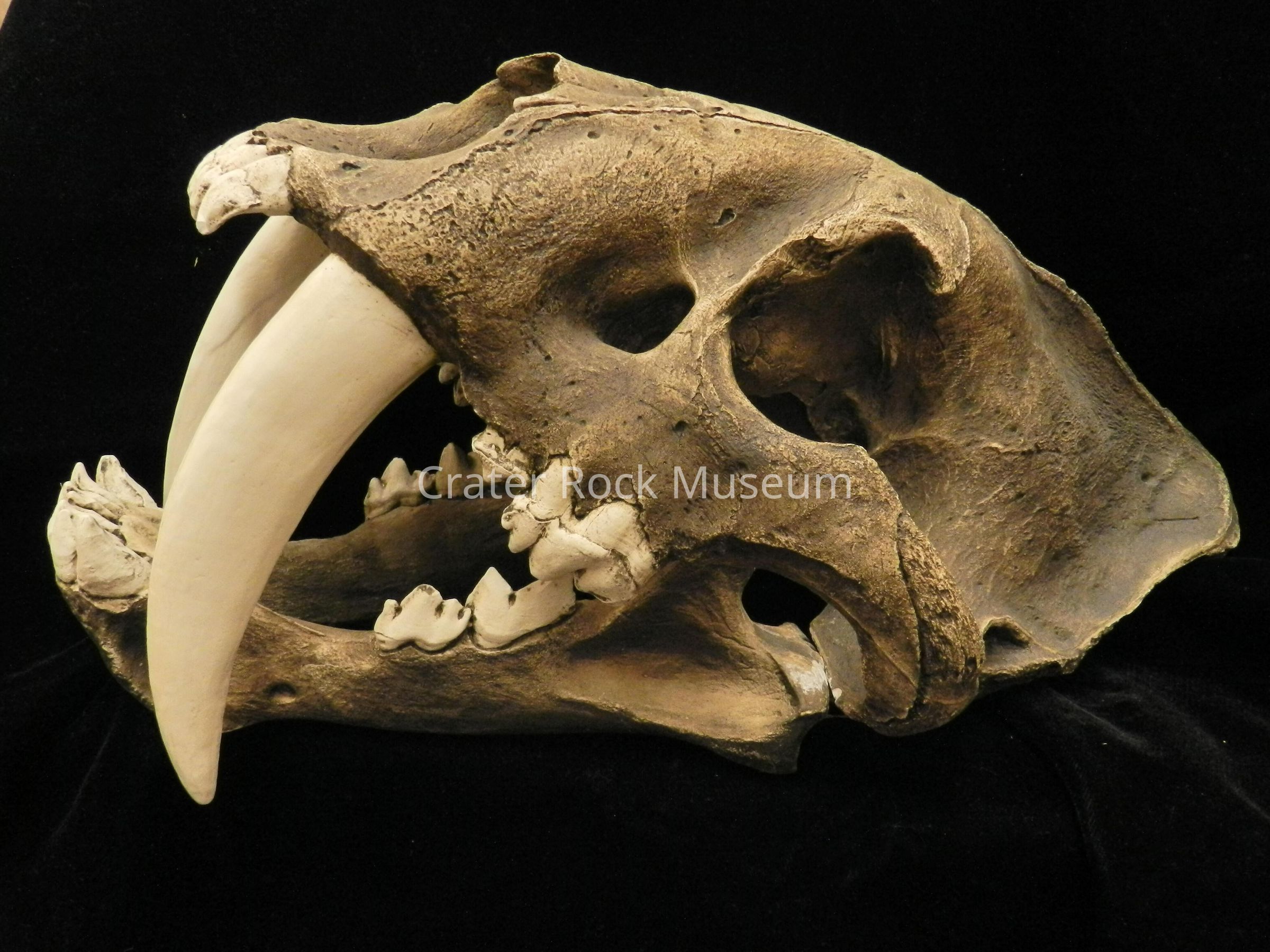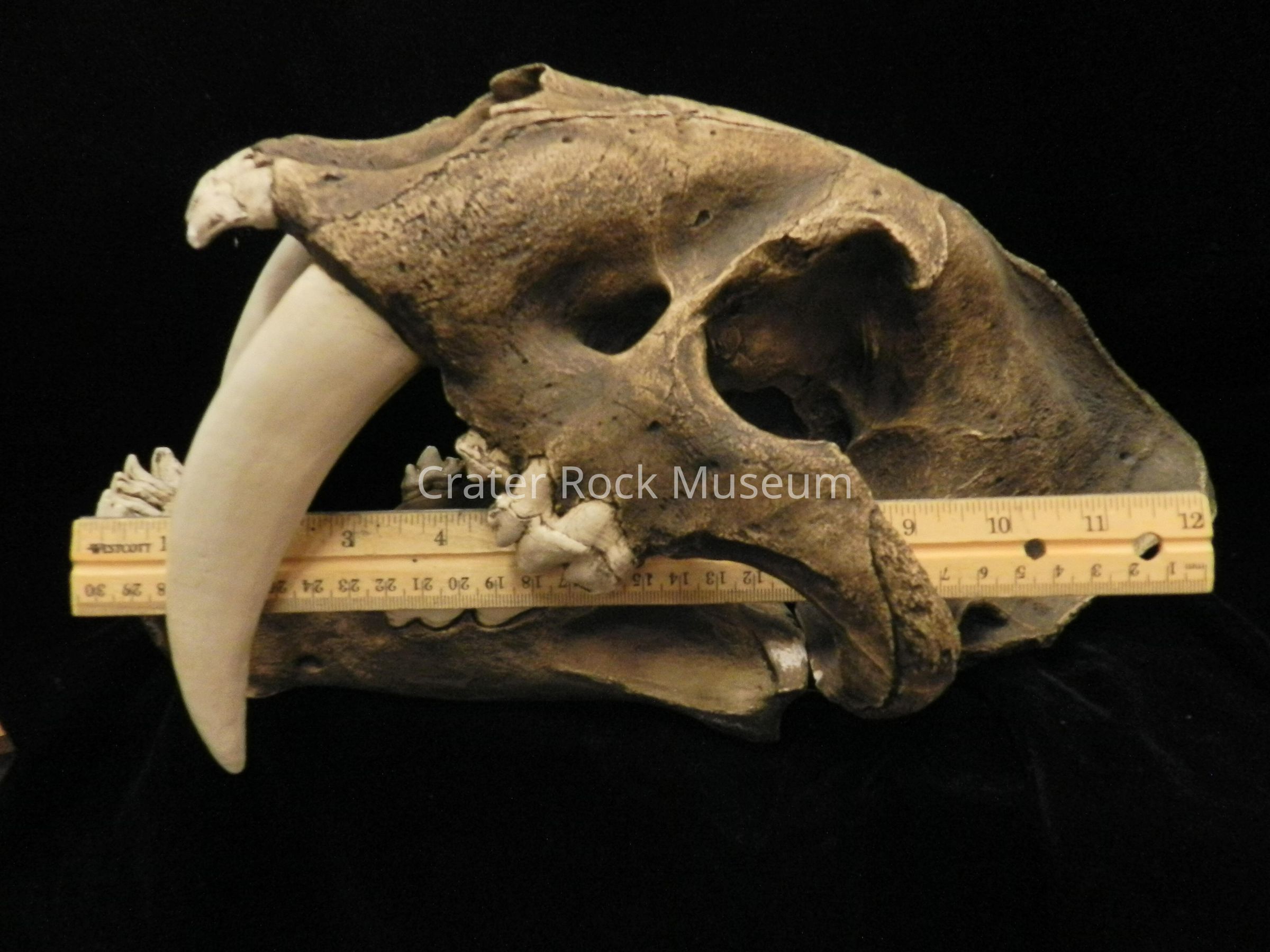 Description: (replica) of a sabre toothed cat skull with full detail. Brown and black with white teeth.