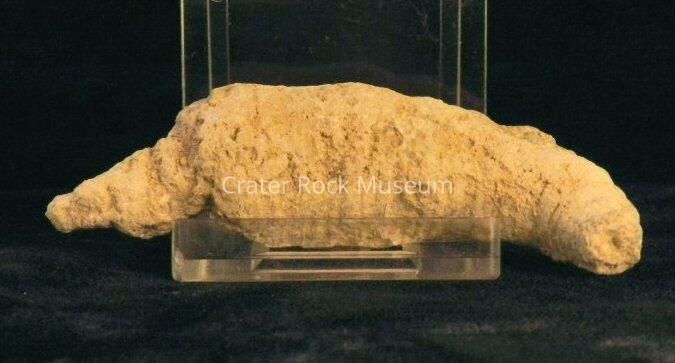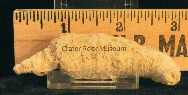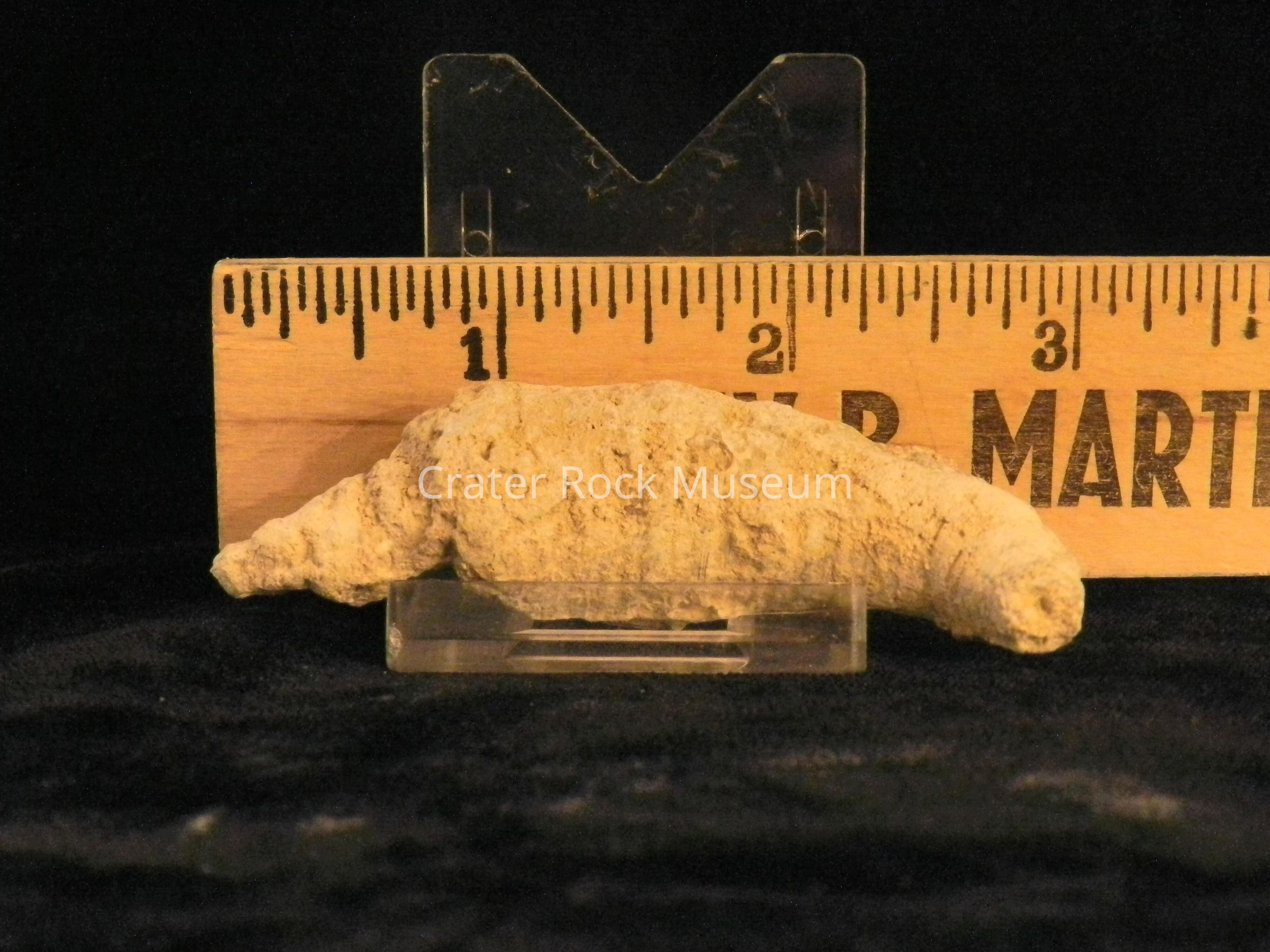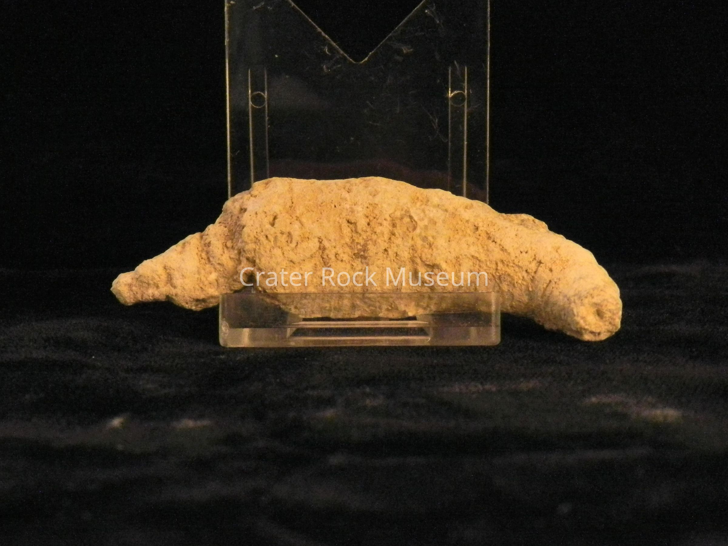 Description: Columnar, with segmented banding that is barely visible. Specimen is very worn and rough. There is a "hook" shape on small end and "web-like" striations running the length on one side. Color is a chalky white and tan.