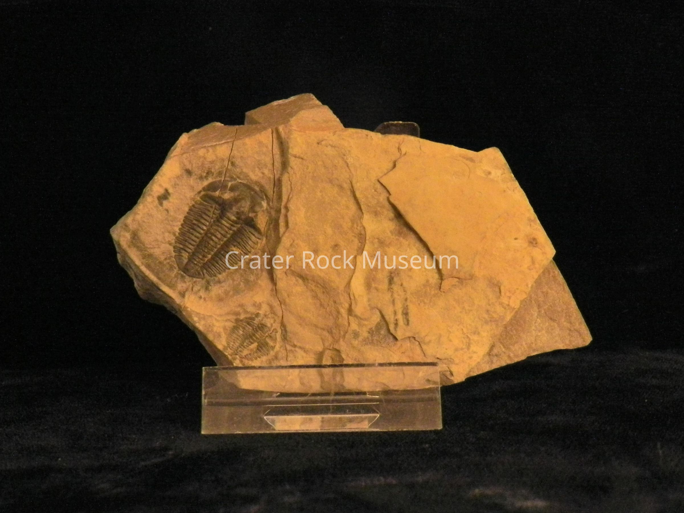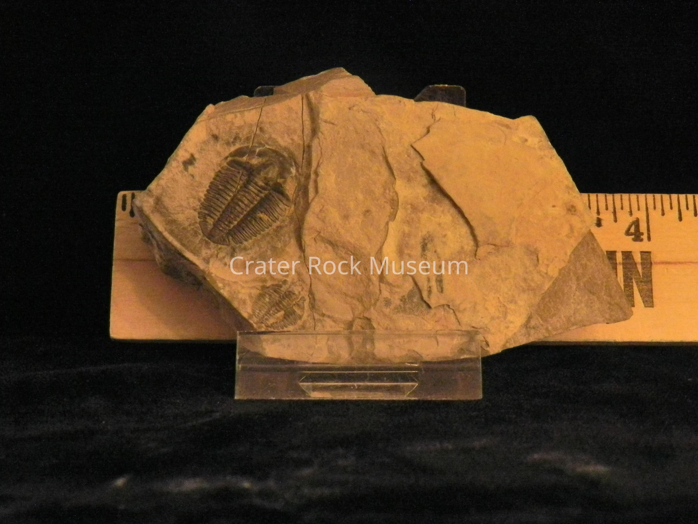 Description: Thick slab with two small fossils, one is highly detailed showing complete specimen. The other specimen is slightly faded. Color is dark gray.