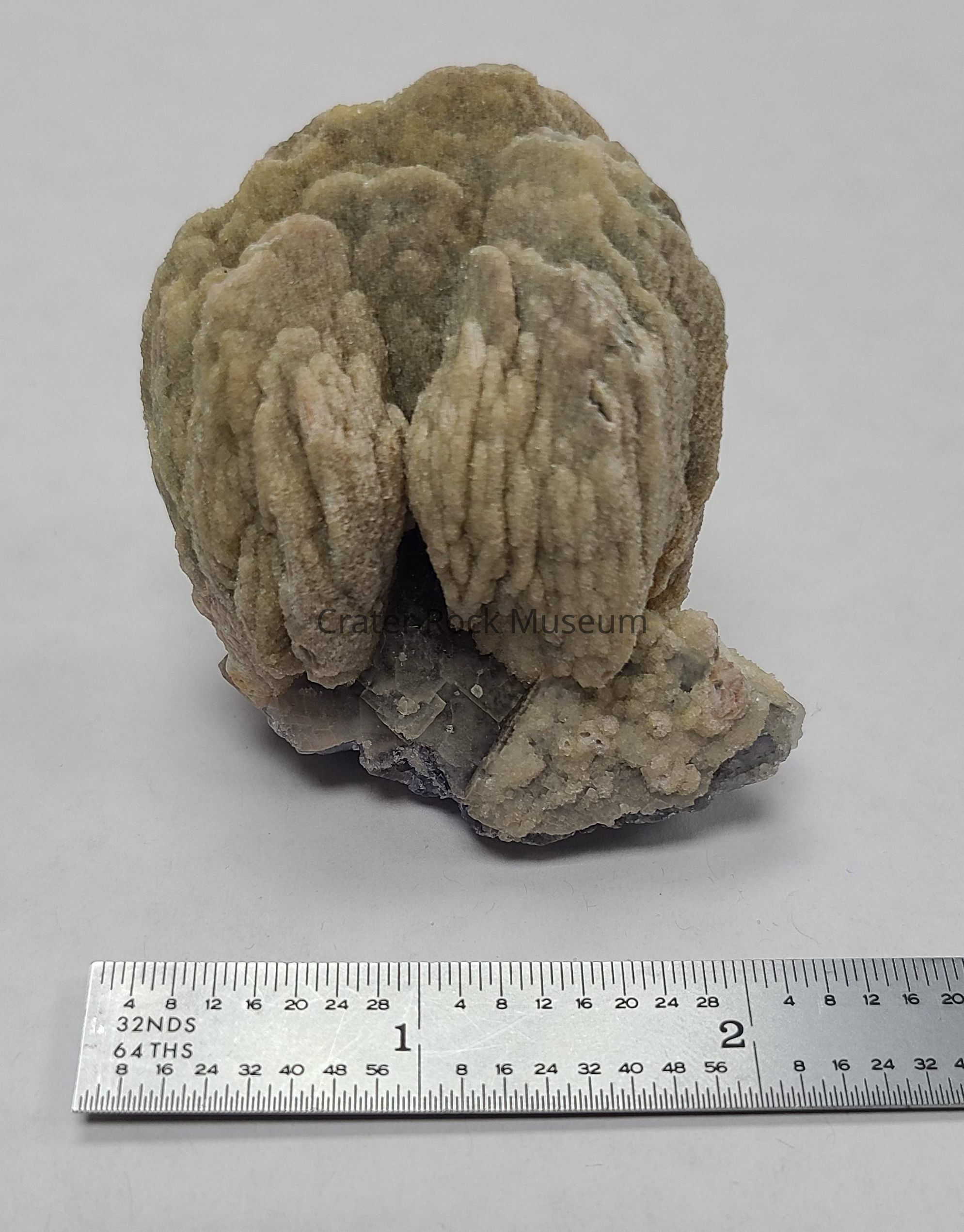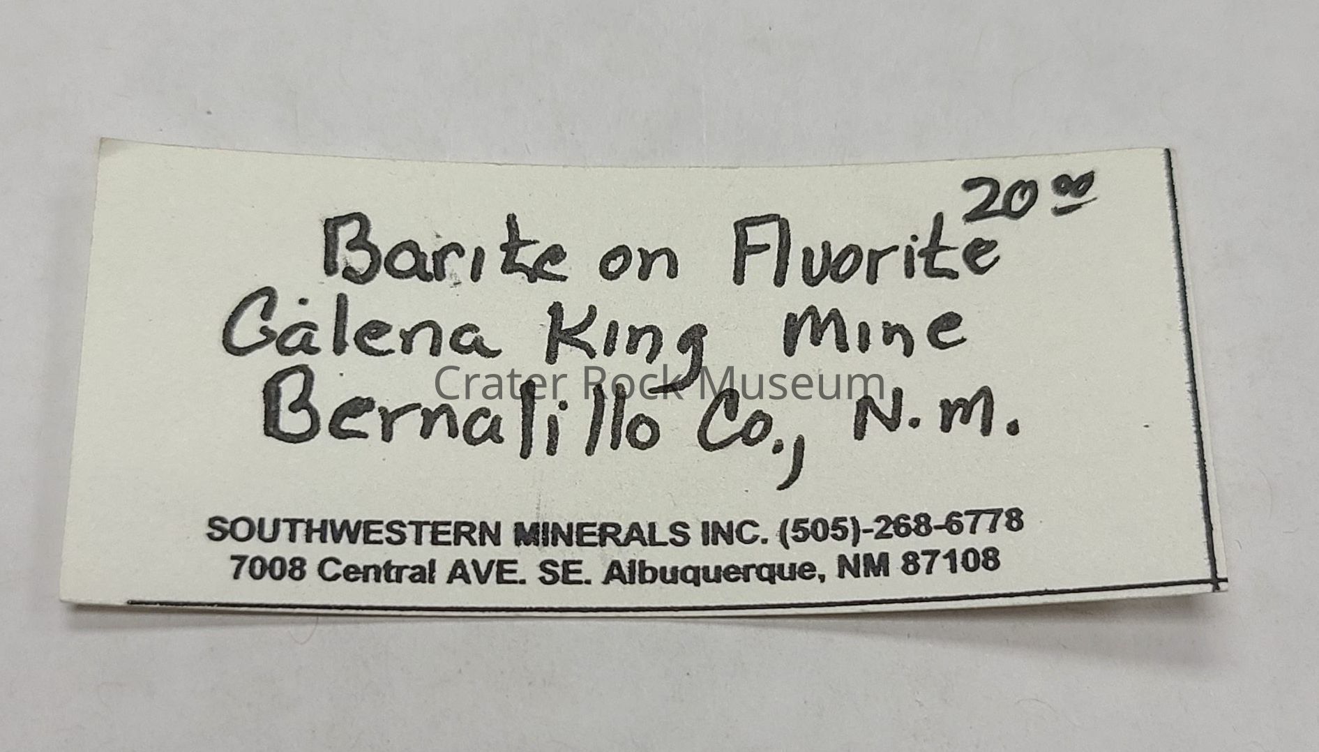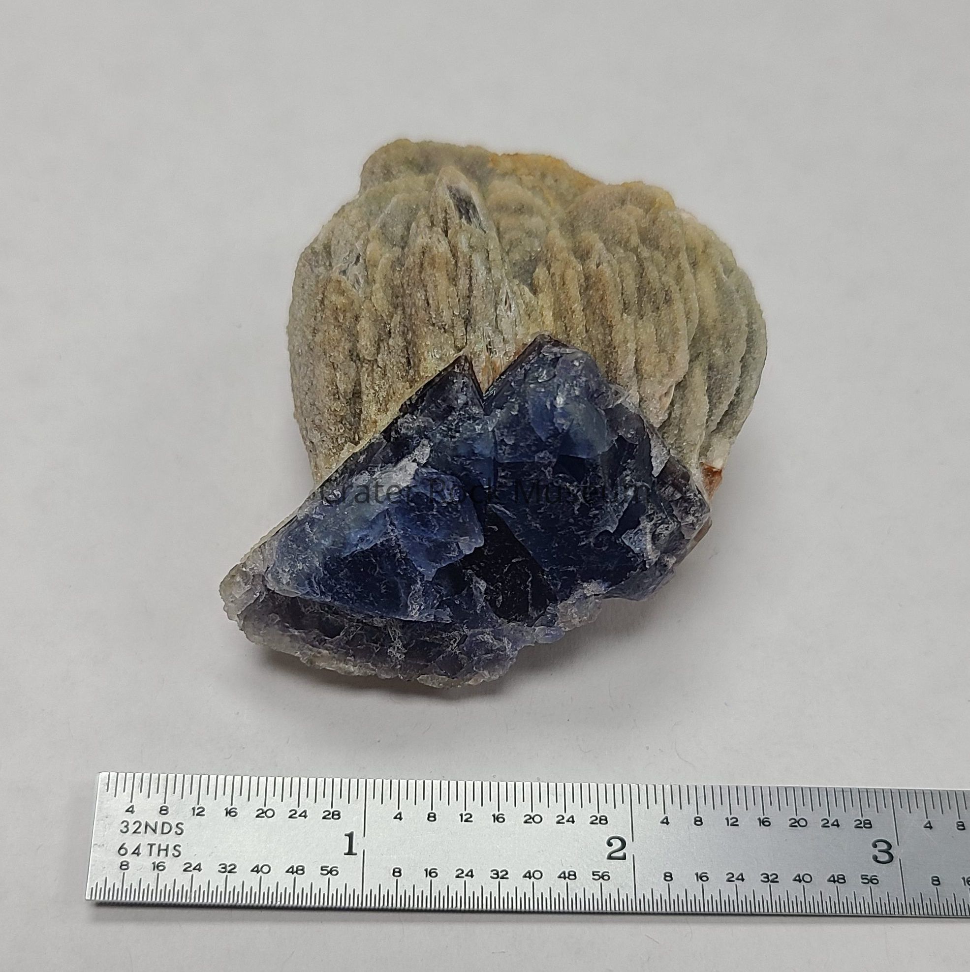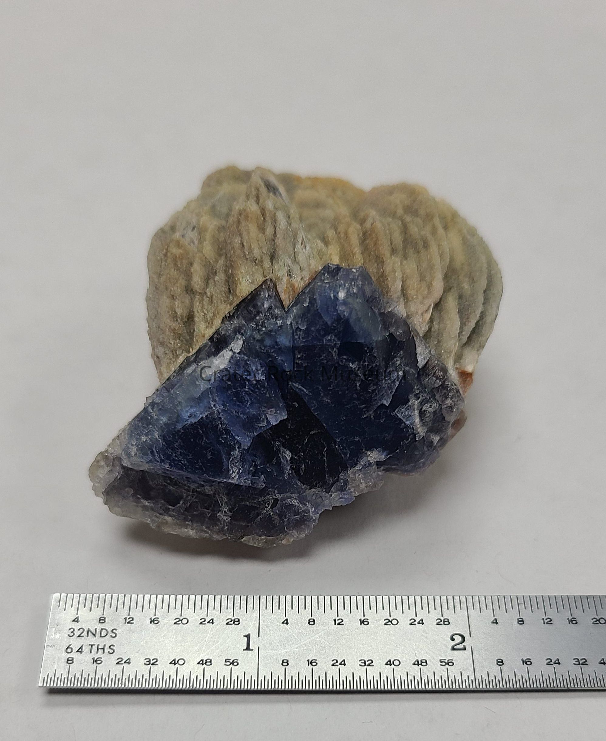 The image shows a striking blue fluorite crystal resting on textured barite, with a ruler for scale