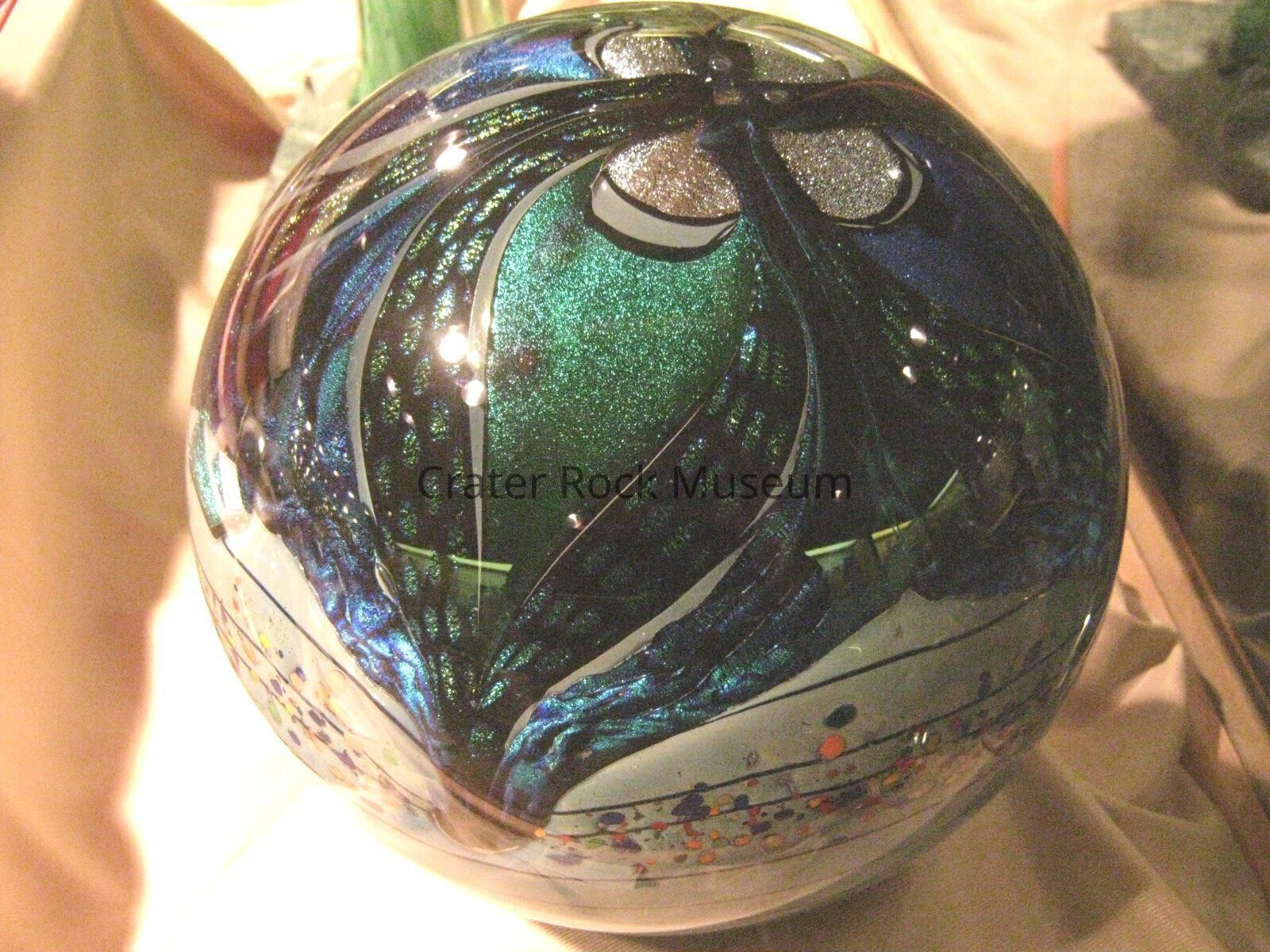 Glass Ball with blue stripes on the bottom, multi colored specks,yellow, green, and blue swirls on topCollection