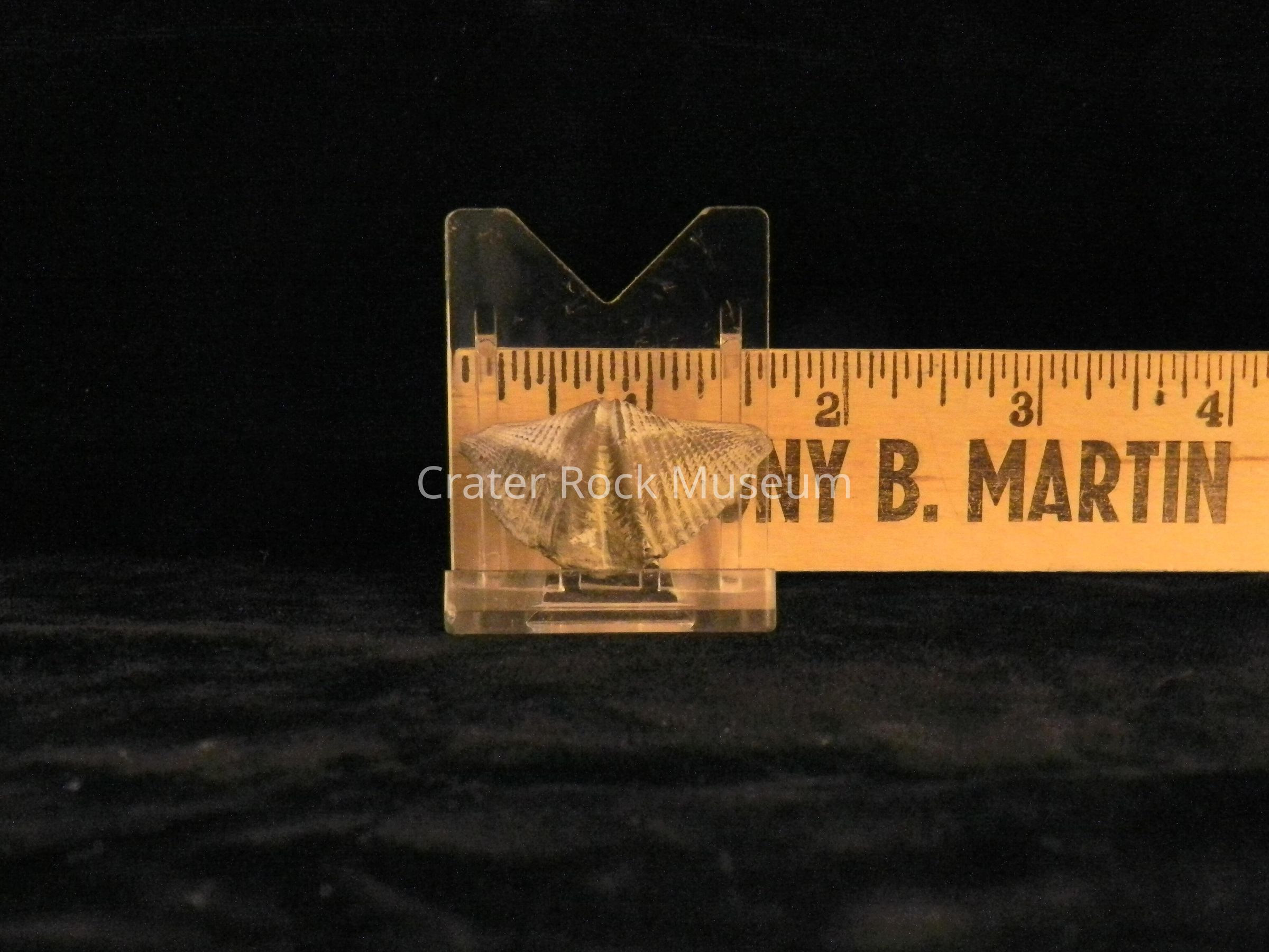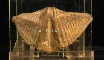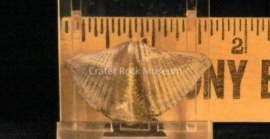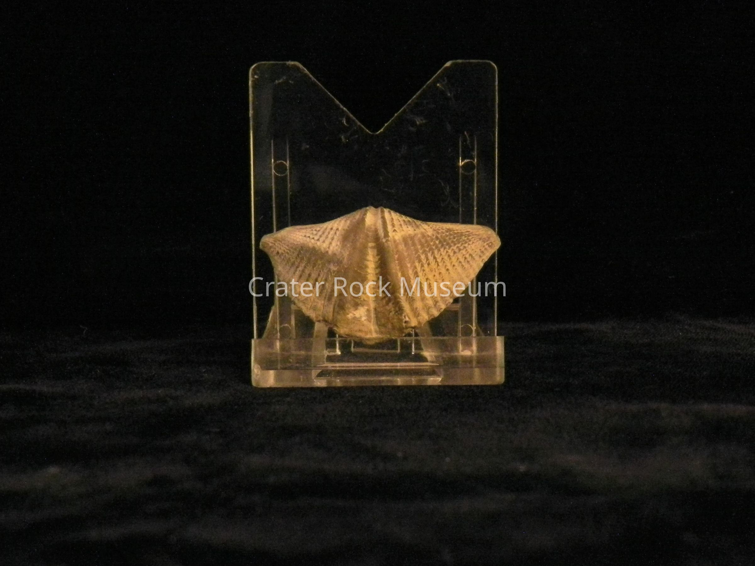 Description: Highly detailed brachiopod with two convex, symetrical halves. Color is light tan to gray with no matrix.