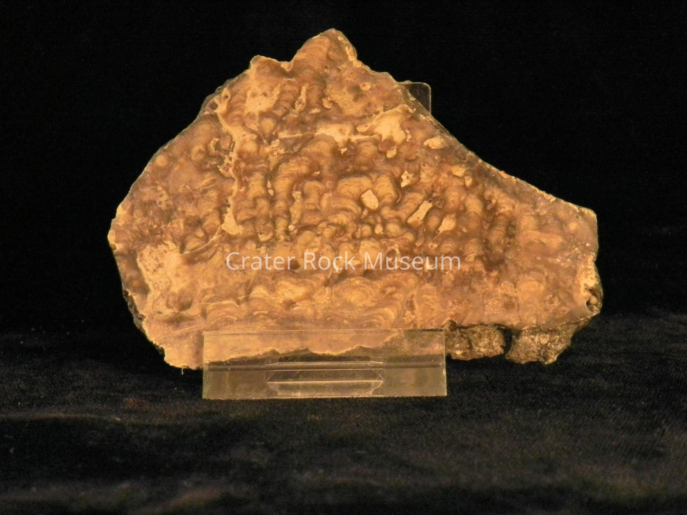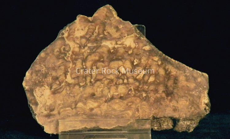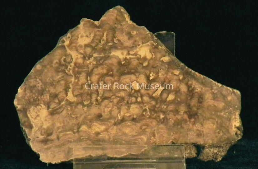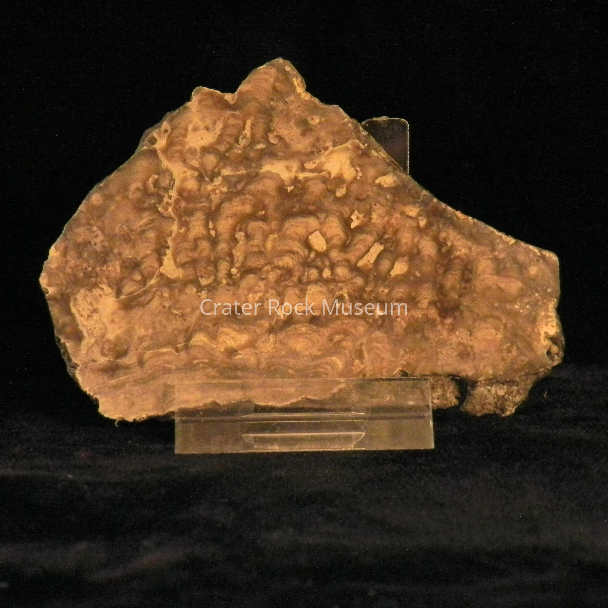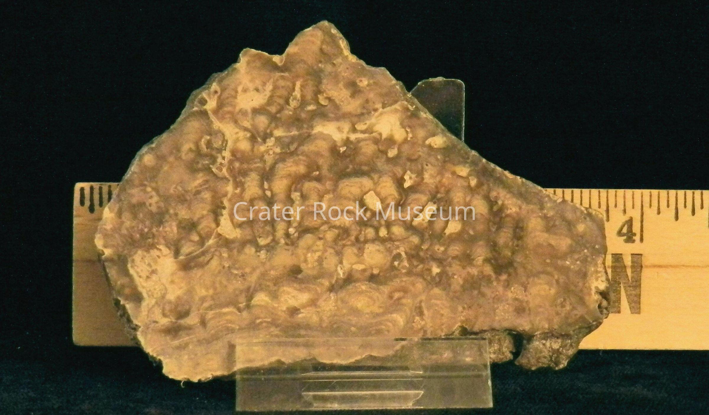 Description: Thin slice with smooth face. Stromatolite structures are finely detailed showing random tubular (Oolitiic) structures. Light and dark tan and brown.