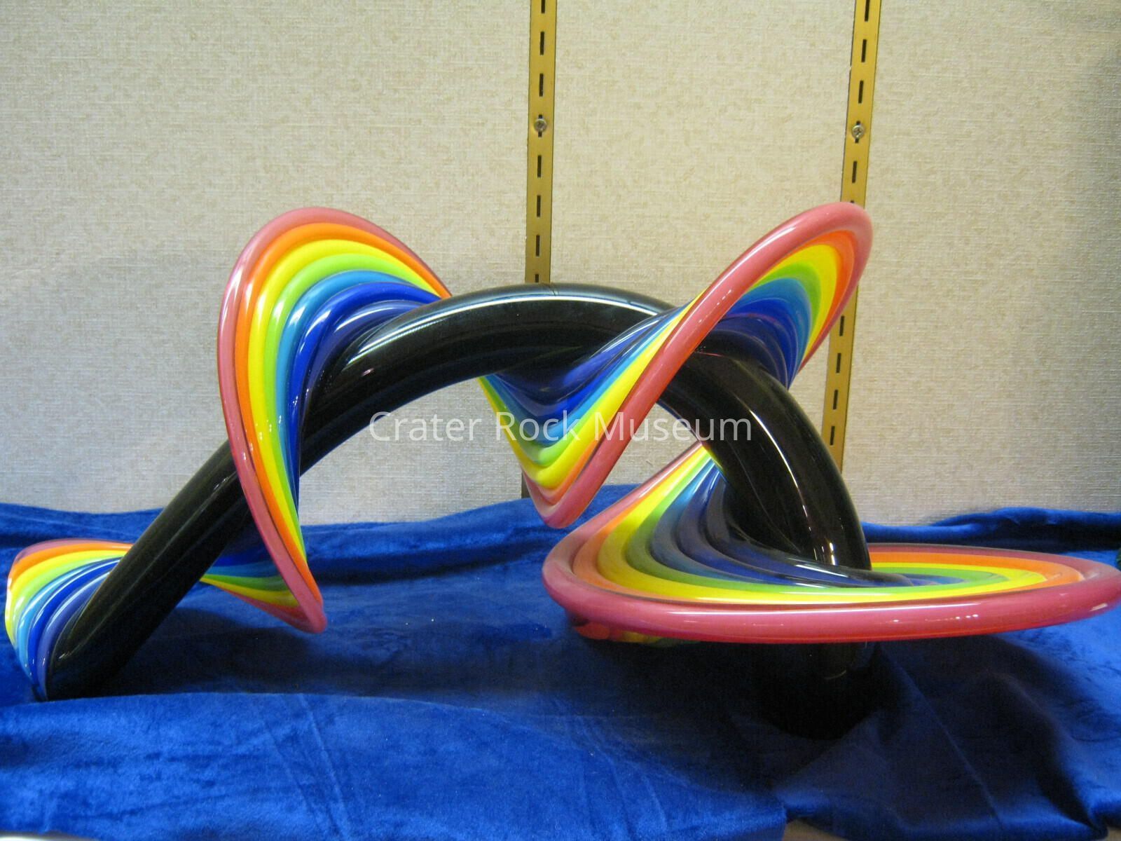 A black curved line with a rainbow swirl going around it called a Heechee Probe or Heechee Sculpture.Collection